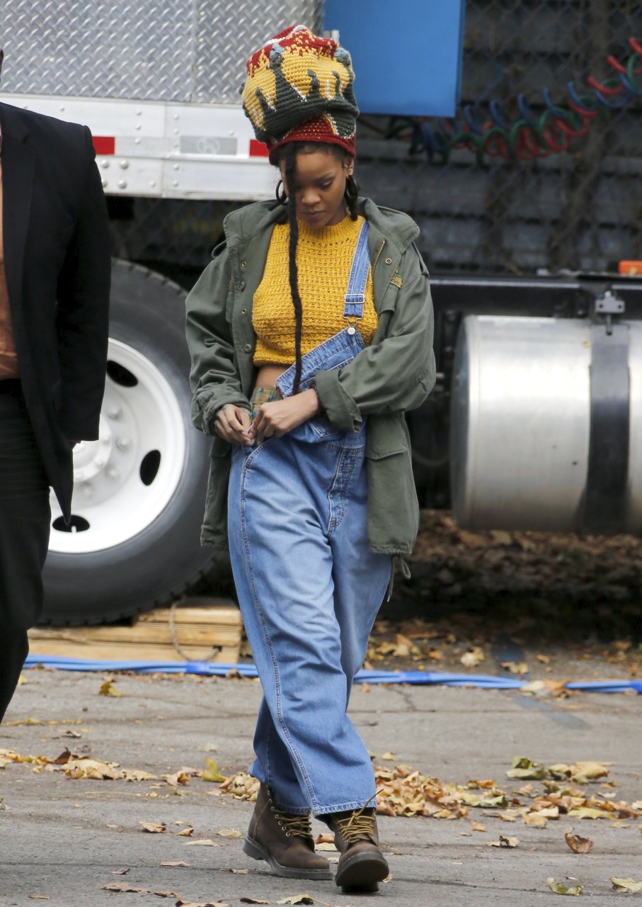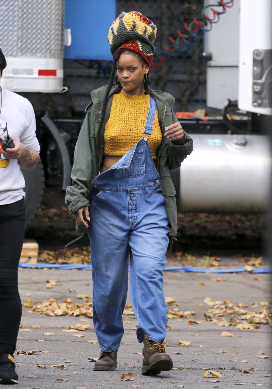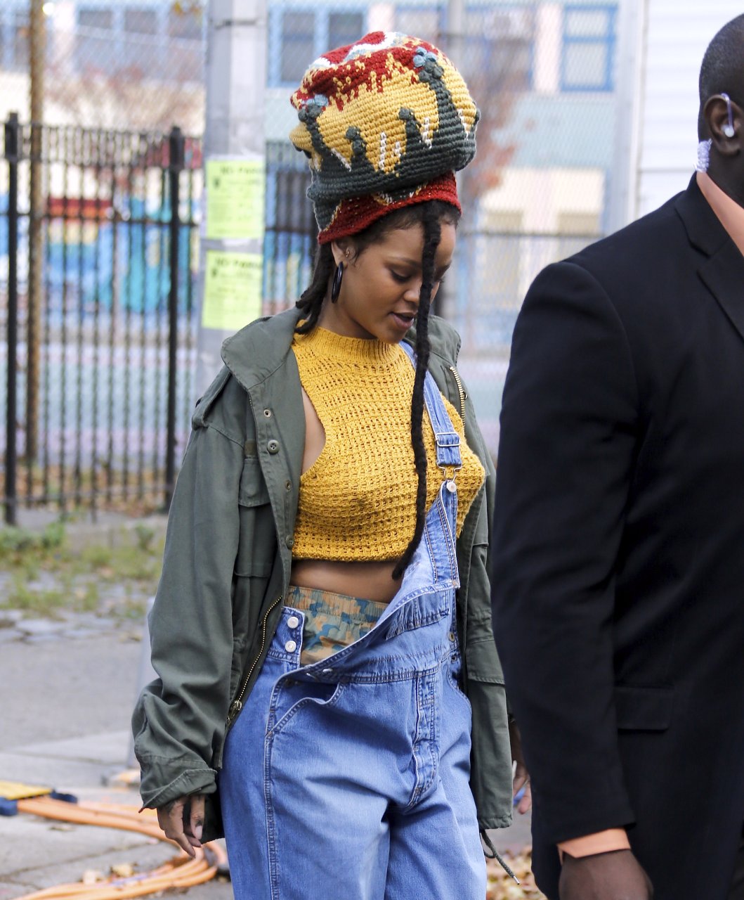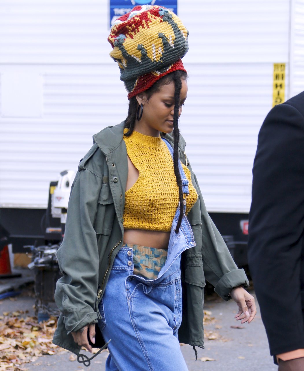 Rihanna usa um top amarelo de tricô cropped sem sutiã no set de Ocean’s Eight em Nova York, 11/04/16. Vibração Rastaman, sim! Positivo! Rihanna é uma cantora e estilista americana. Idade: 28 (20 de fevereiro de 1988).