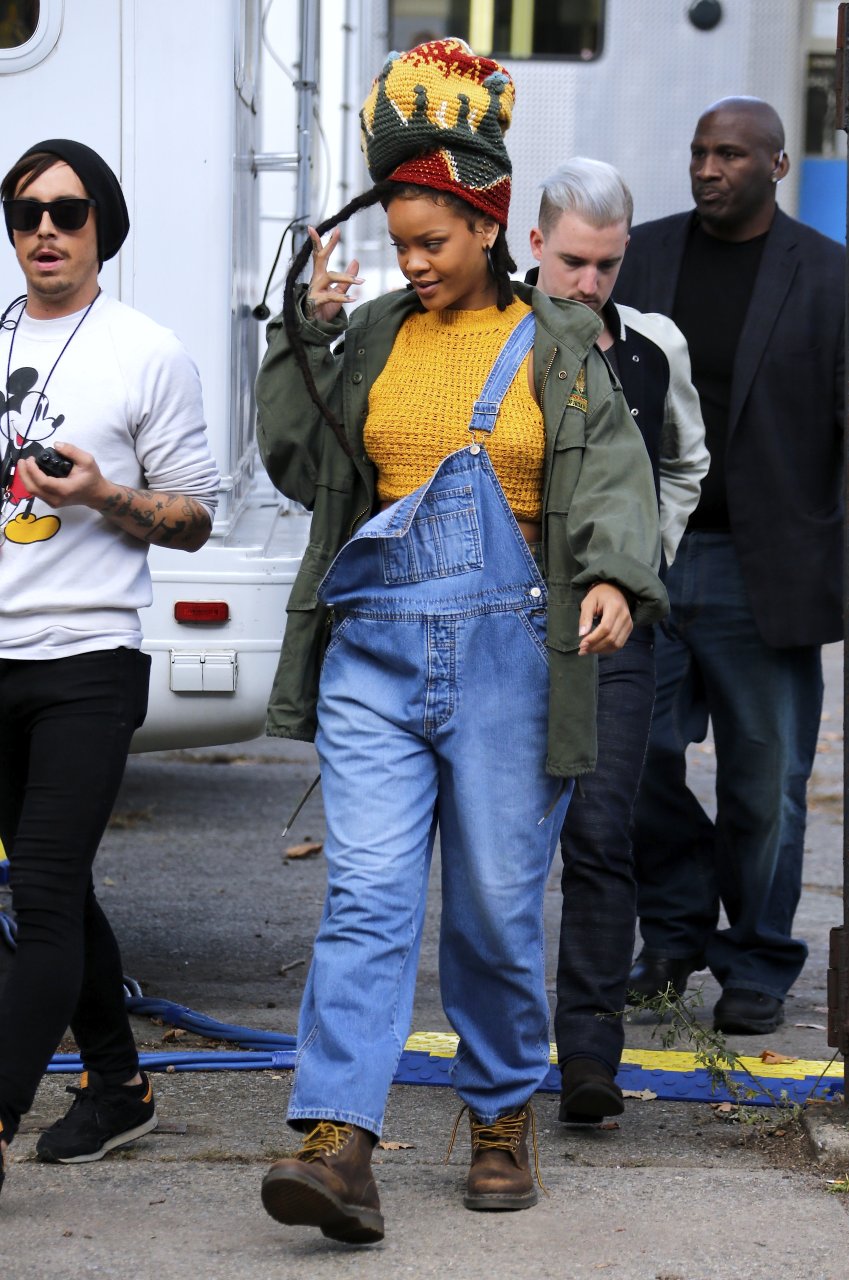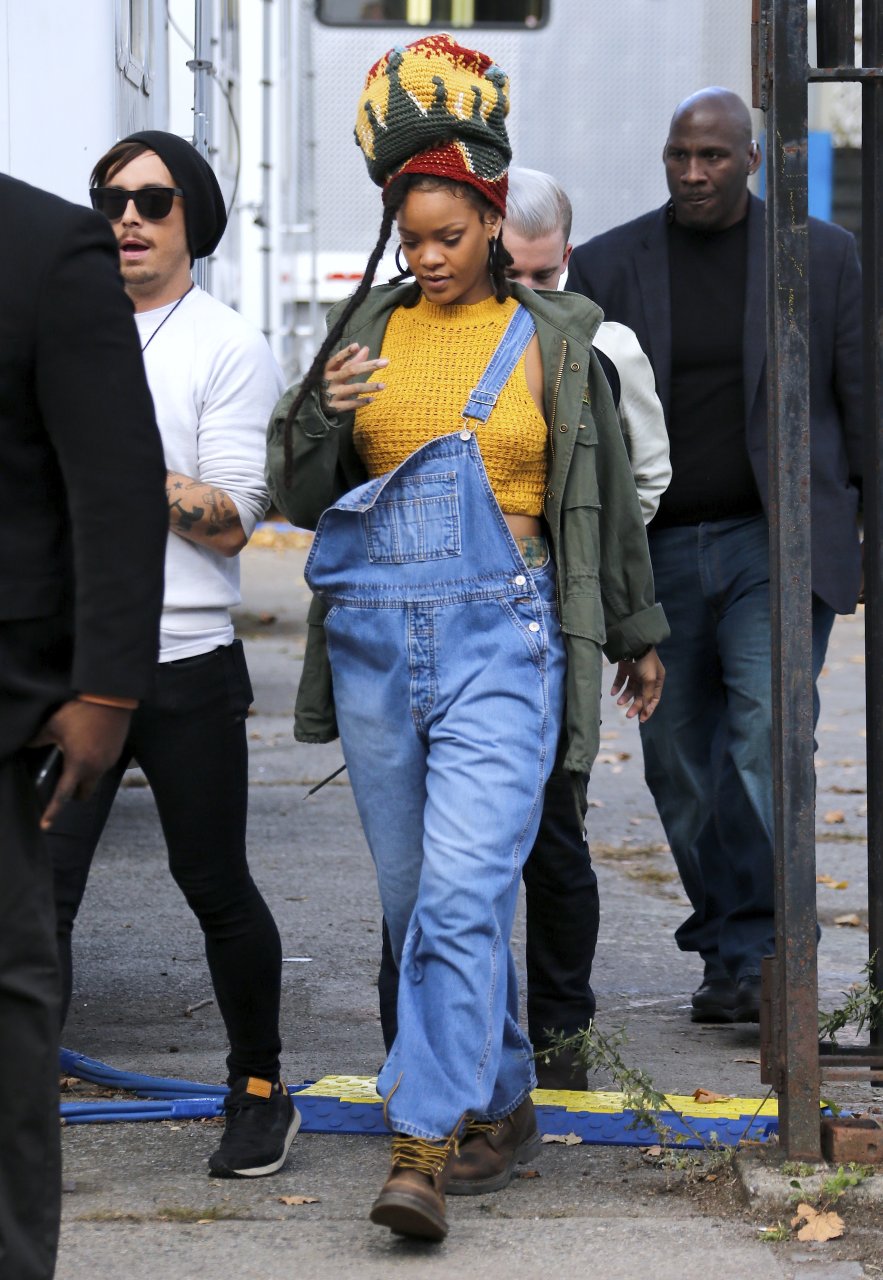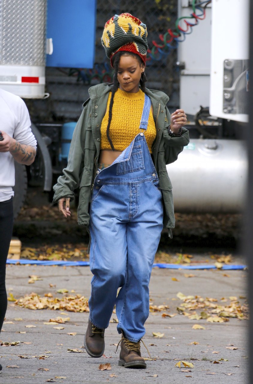 Rihanna usa um top amarelo de tricô cropped sem sutiã no set de Ocean’s Eight em Nova York, 11/04/16. Vibração Rastaman, sim! Positivo! Rihanna é uma cantora e estilista americana. Idade: 28 (20 de fevereiro de 1988).