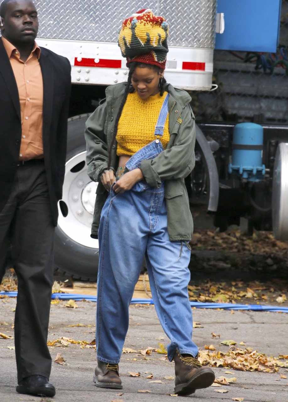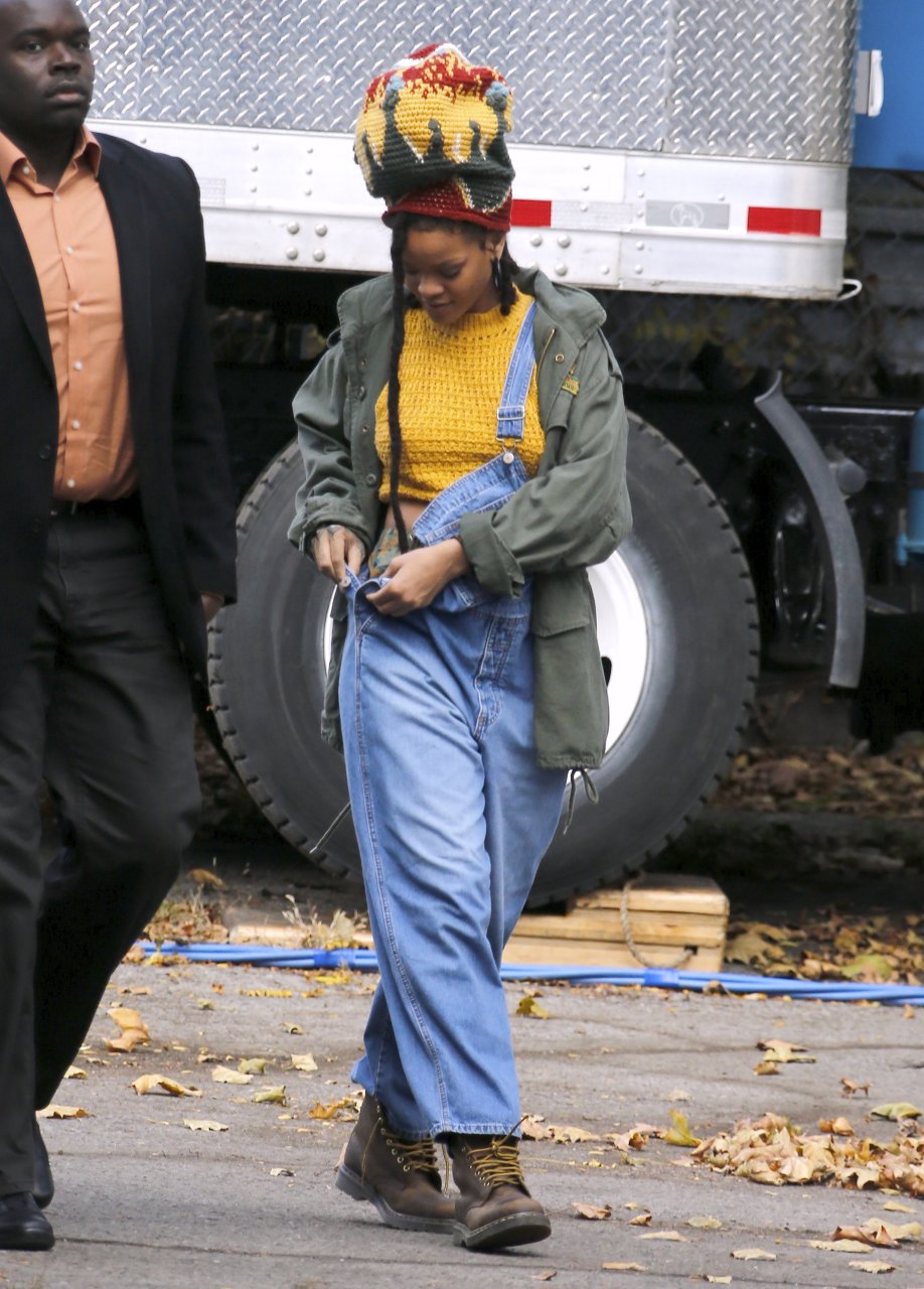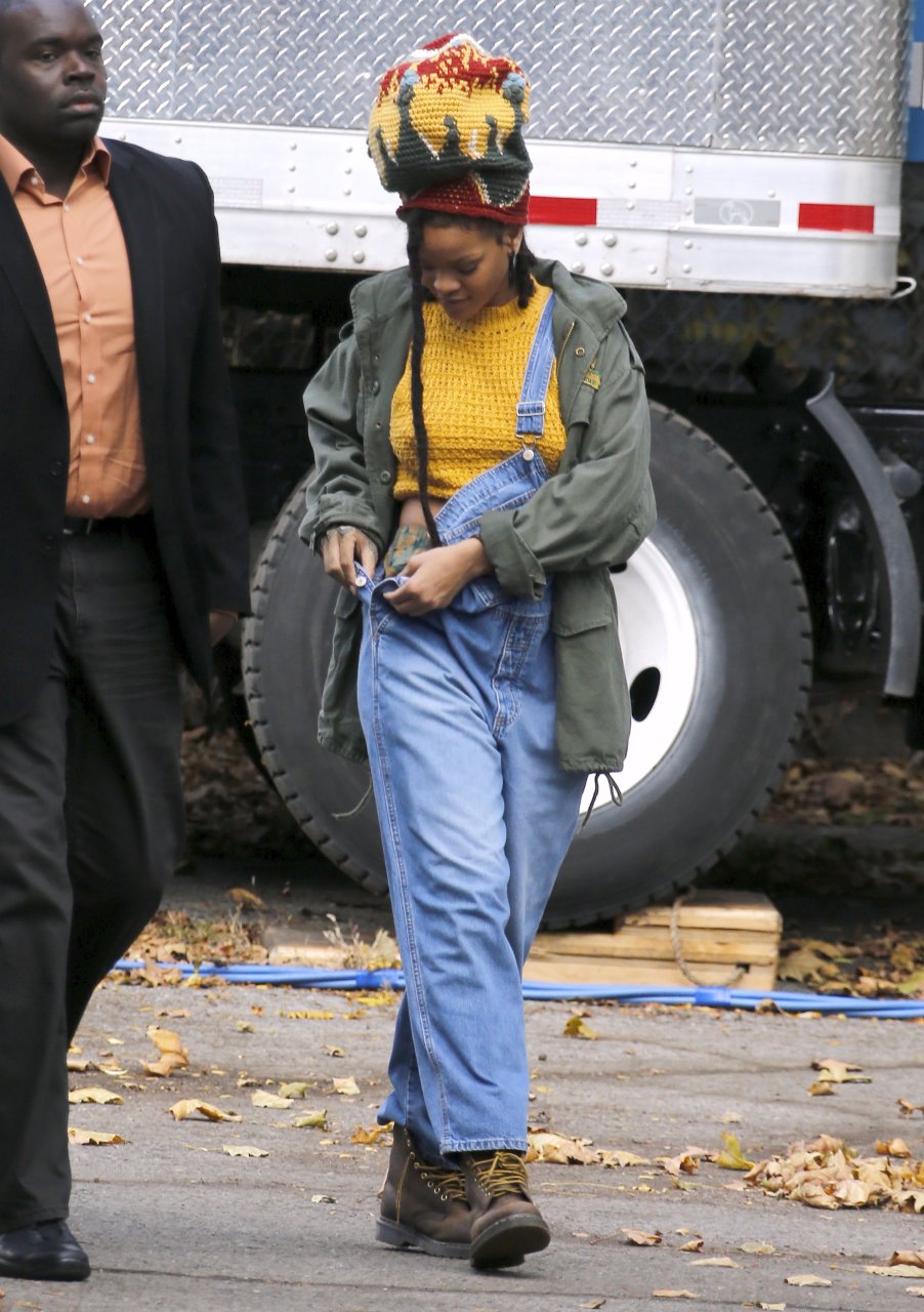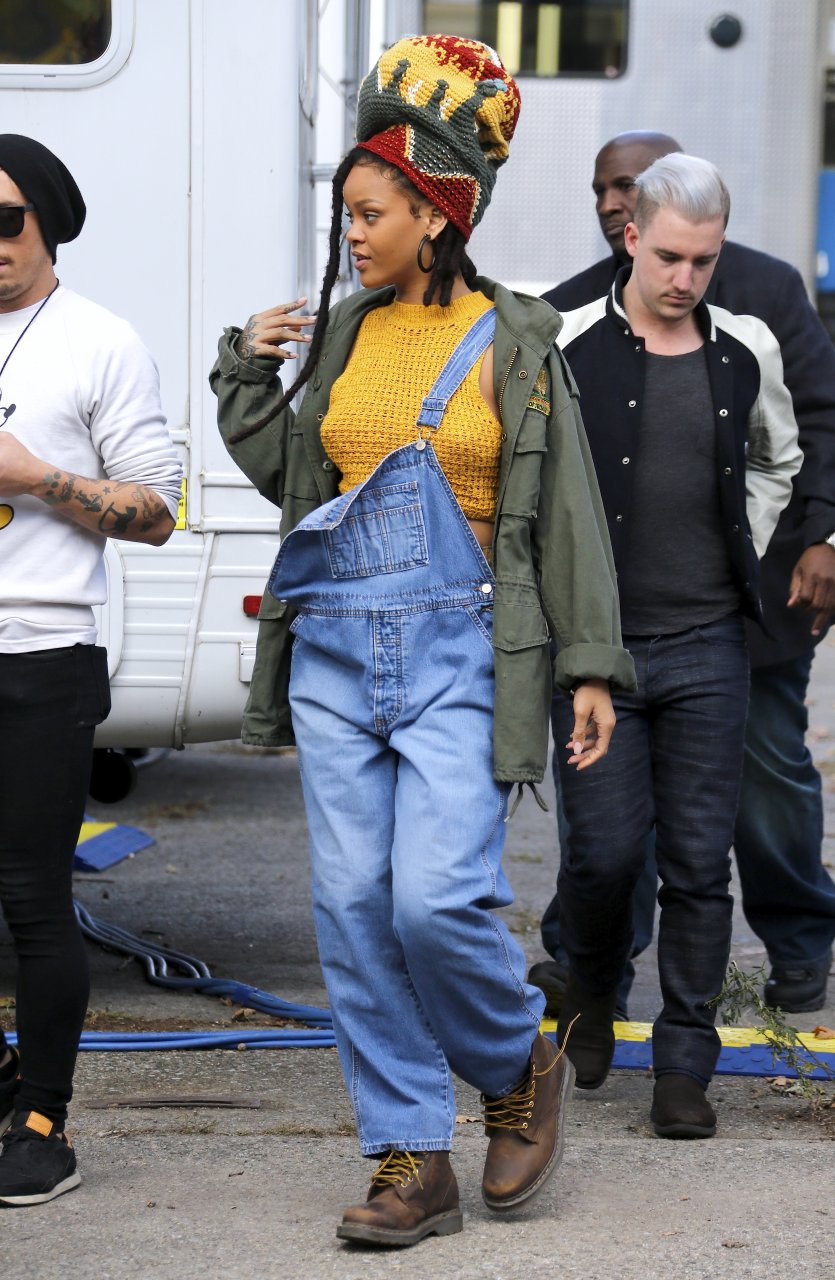 Rihanna usa um top amarelo de tricô cropped sem sutiã no set de Ocean’s Eight em Nova York, 11/04/16. Vibração Rastaman, sim! Positivo! Rihanna é uma cantora e estilista americana. Idade: 28 (20 de fevereiro de 1988).