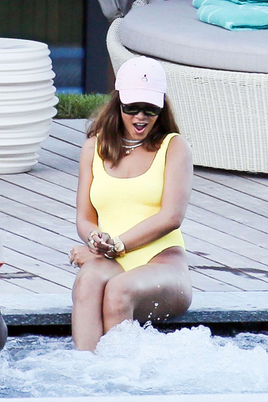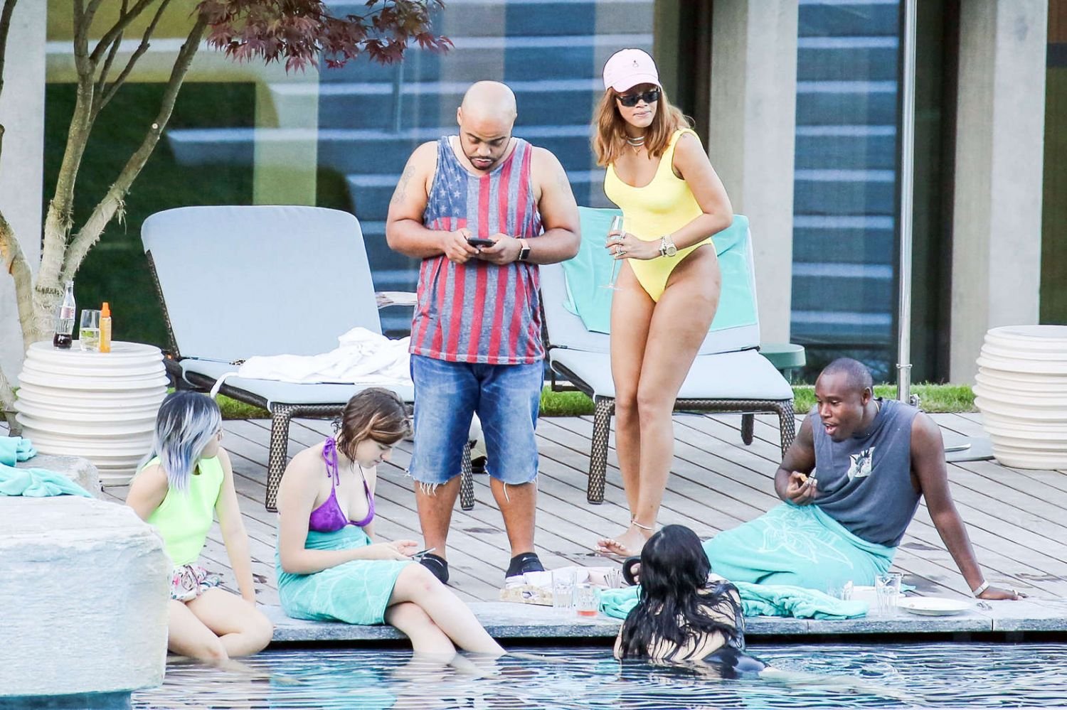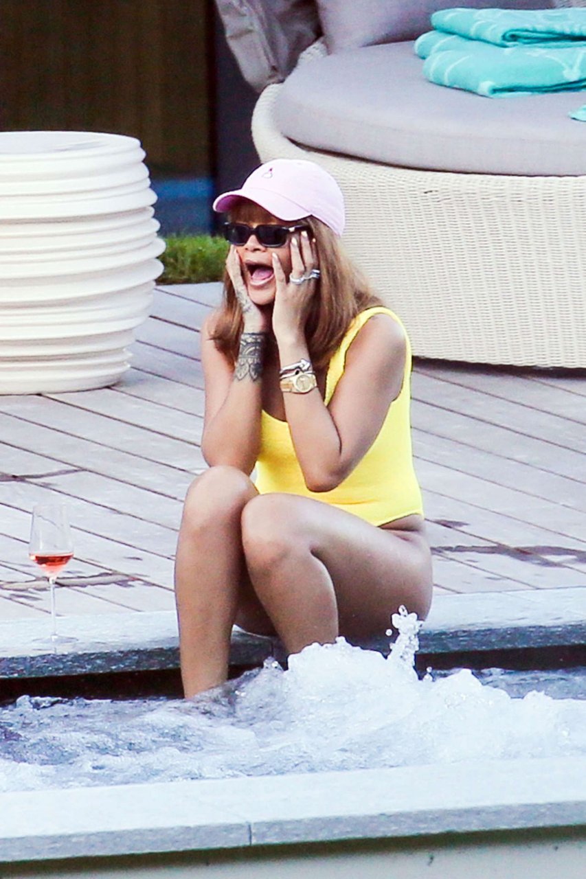 Rihanna aproveitou uma pausa merecida enquanto relaxava à beira da piscina em sua casa em Zurique (agosto de 2016). Amarelo é o novo preto! Rihanna é uma cantora e estilista americana. Idade: 28 (20 de fevereiro de 1988).
