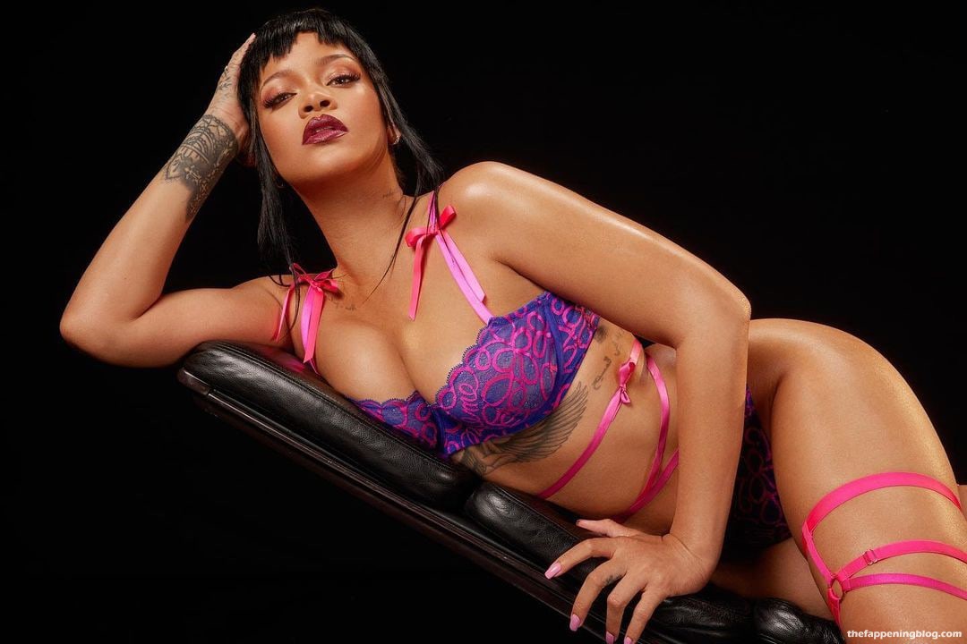 A cantora Rihanna exibe um visual muito atrevido em lingerie roxa e rosa enquanto promove sua mais recente coleção Savage X Fenty no Twitter, 31/08/2021.