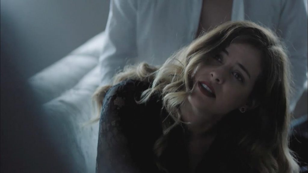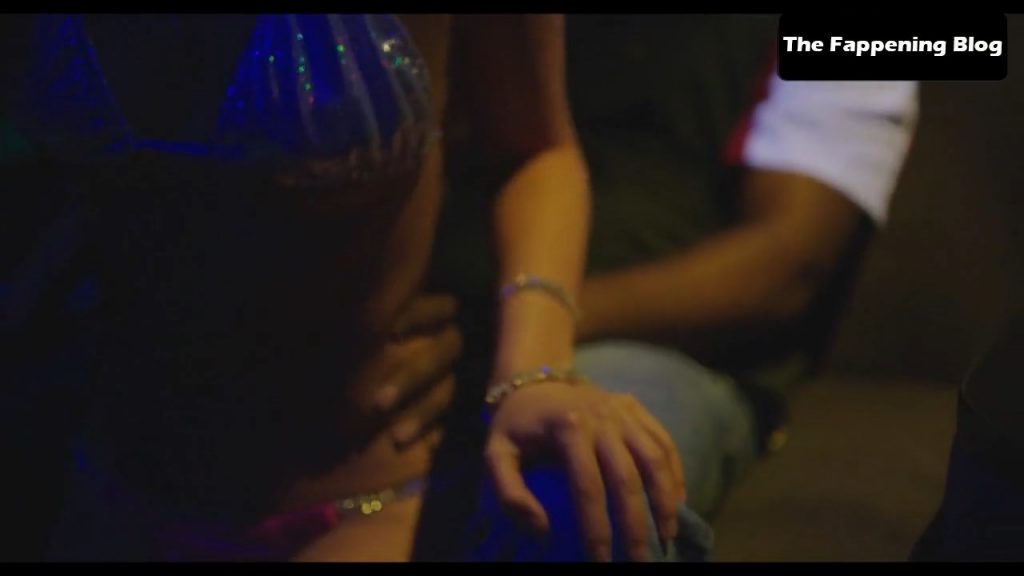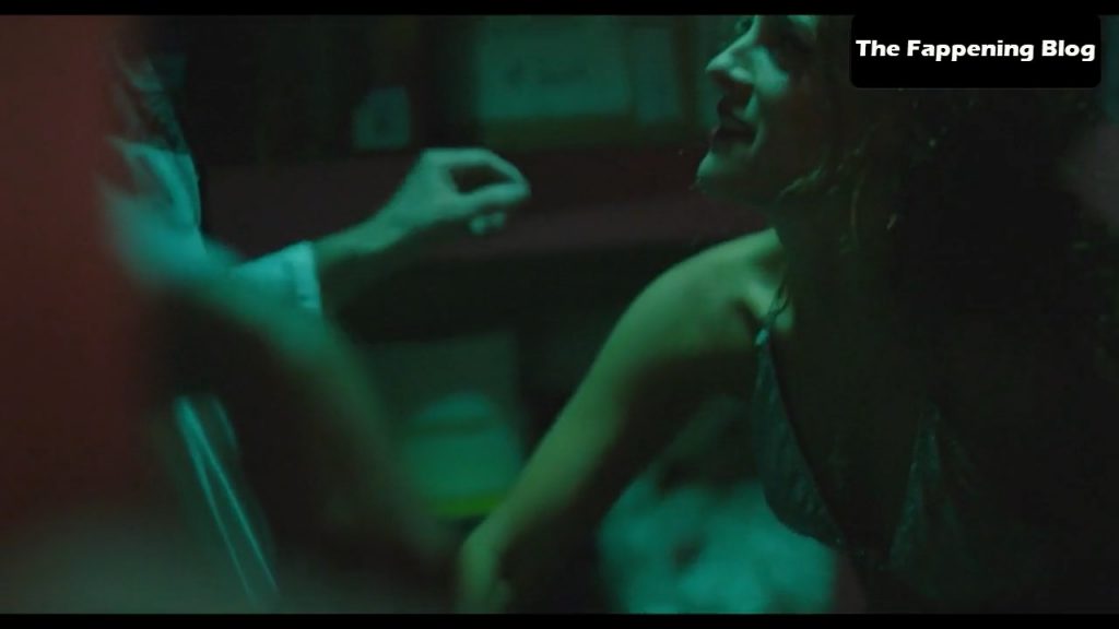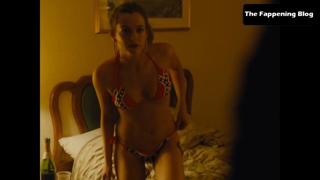 Riley Keough rebolando no colo de um cara enquanto ele está sentado na beira da cama, com calças e ela com a camisa desabotoada. Riley então desce do cara e senta-se em frente a ele, puxando os seios para fora do sutiã.She then begins to masturbate.
