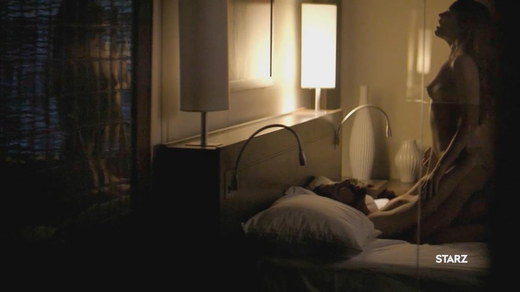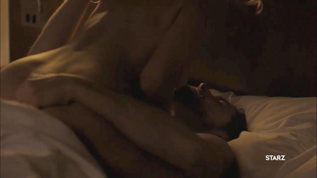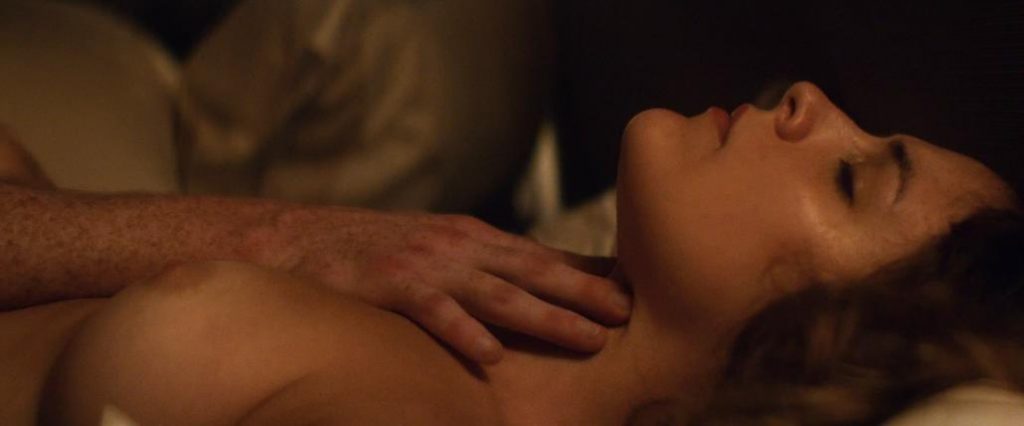 We then see Riley Keough naked on top of him and showing her breasts and butt from the side as she rides him. After they finish having sex, we see Riley on her back with her right breast visible as well as her left flashing into view.