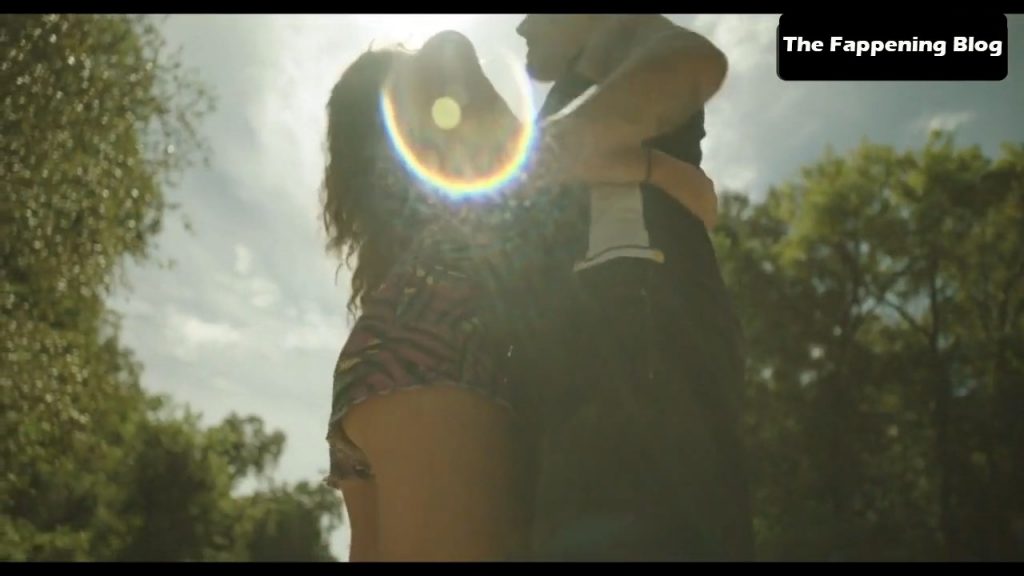 Sexy Riley Keough wearing an unbuttoned shirt that reveals her bra as she walks over to a guy who sitting on a couch. She then hikes her skirt up and shows her bare butt as the guy puts his arms around her and goes down on her. All this, while she stands in front of him. Next, we see Riley lying on the couch by herself, her hand down her panties as she masturbates.