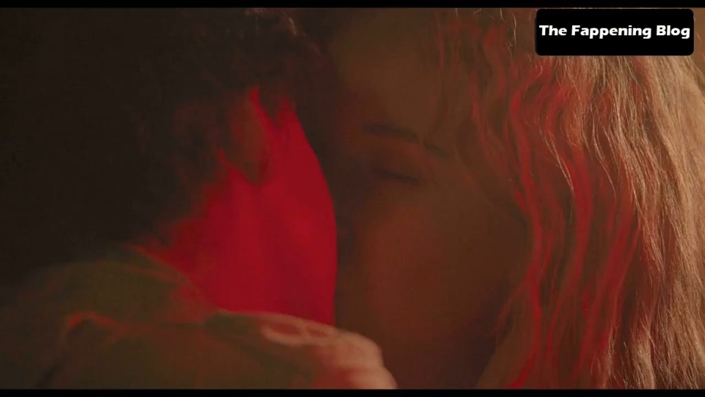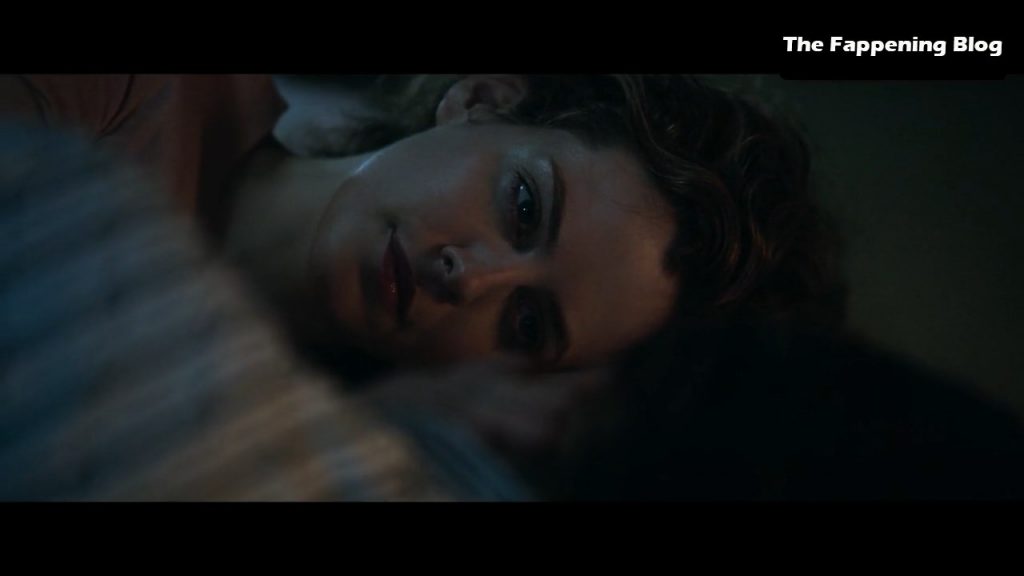 Riley Keough nua enquanto está por cima de um cara na cama, mostrando a bunda e os seios de lado enquanto o cavalga. O cara então coloca a mão no seio dela enquanto continuam fazendo sexo.