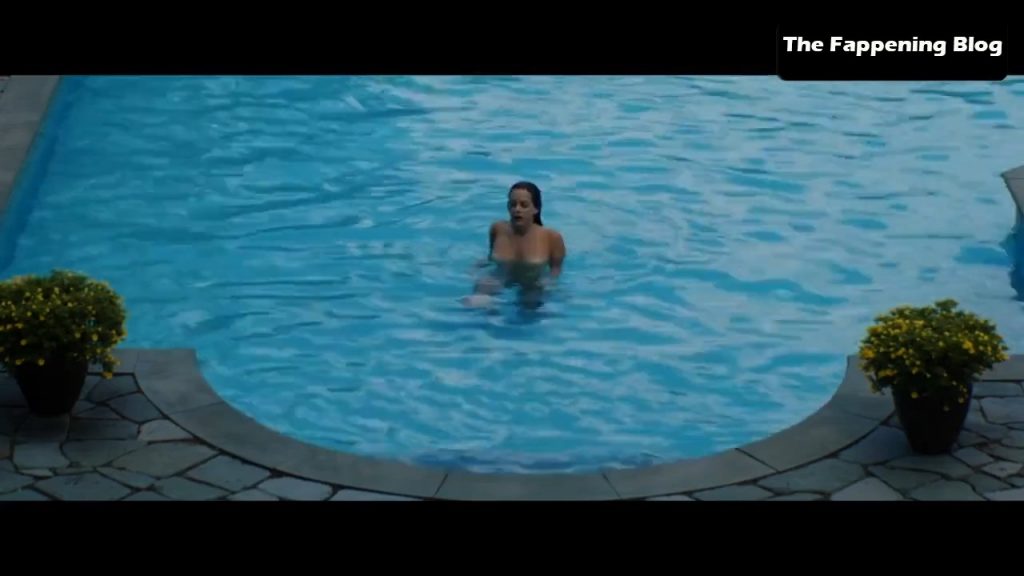 Riley is swimming nude in a pool, eventually breaking the surface of the water to reveal her rack, plus a quick look at her ass as she swims away!