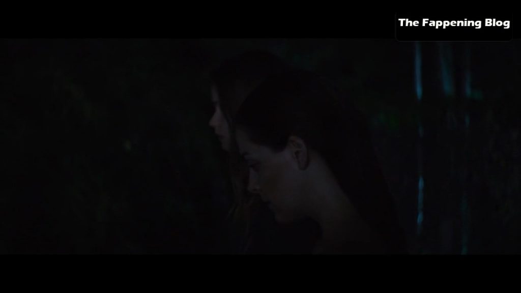 Riley stands nude in the moonlight with her back to Abbey. Eventually we see Riley’s breasts as she leads Abbey around, before Abbey wakes up from what has been a dream!