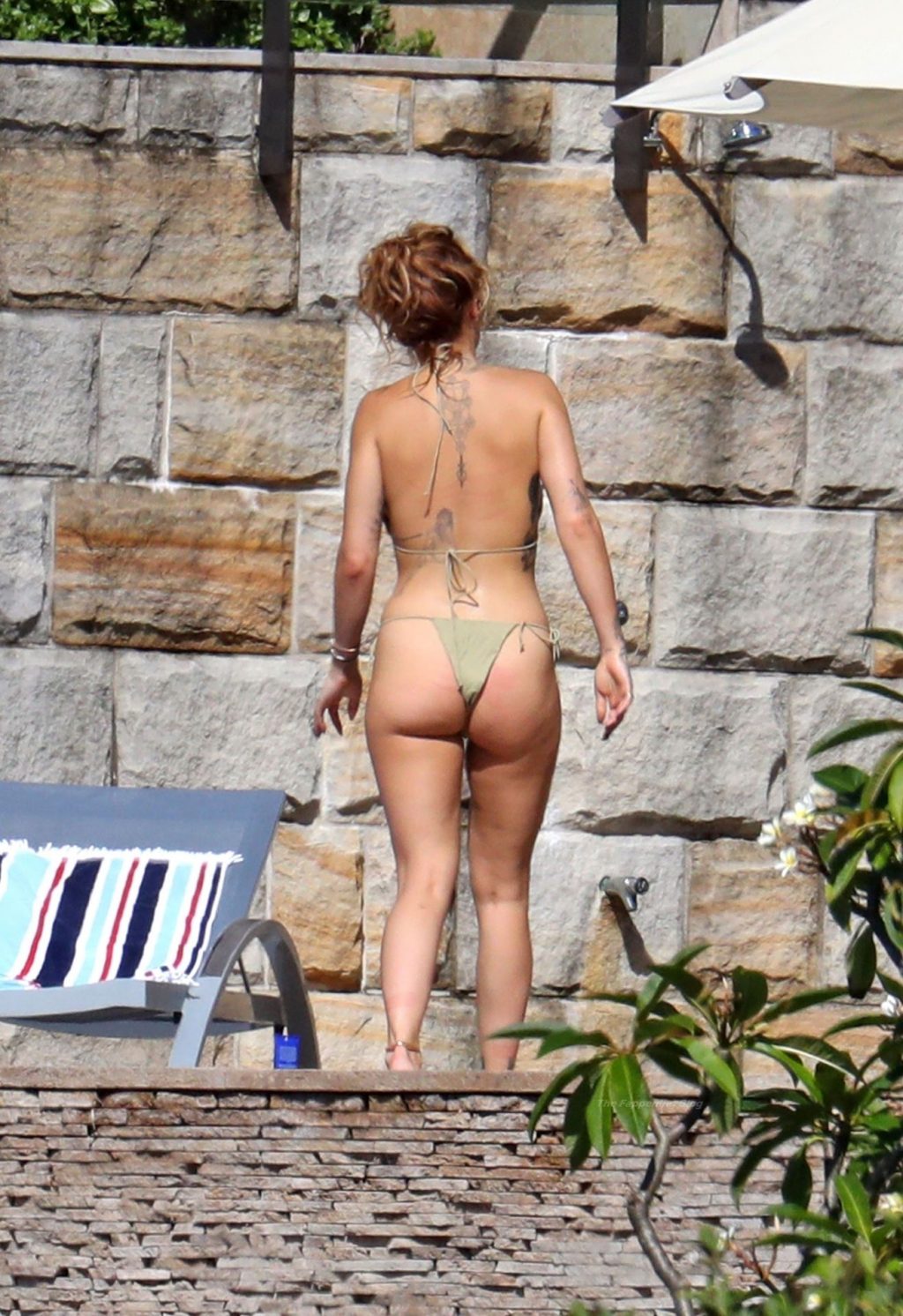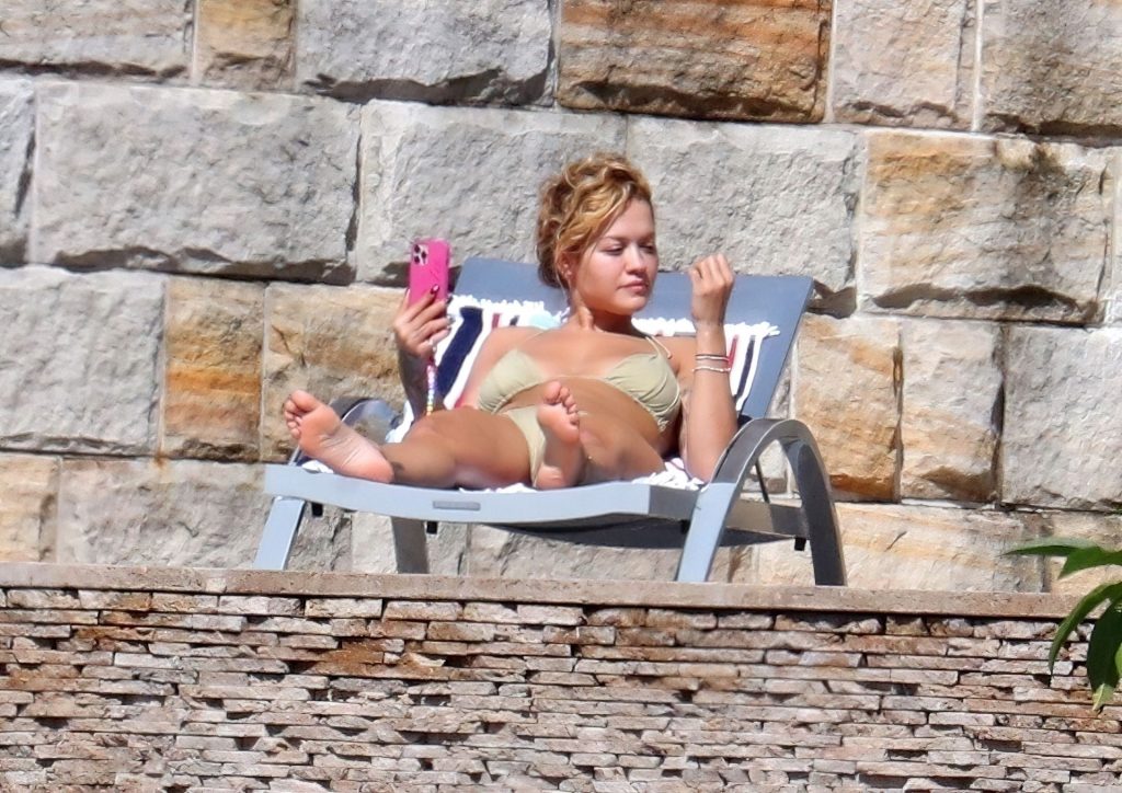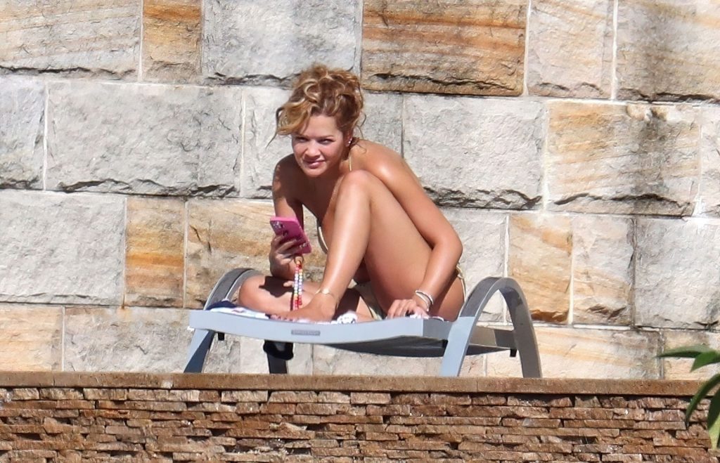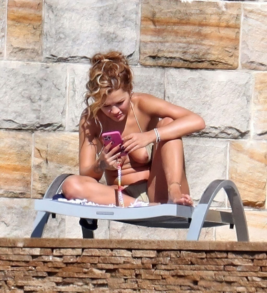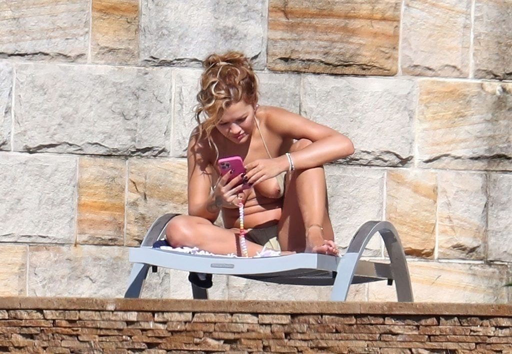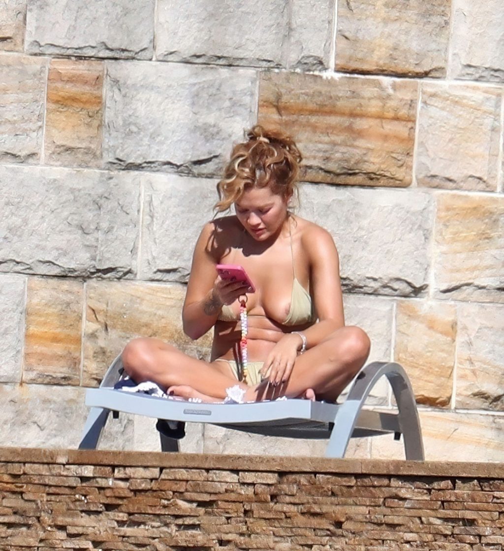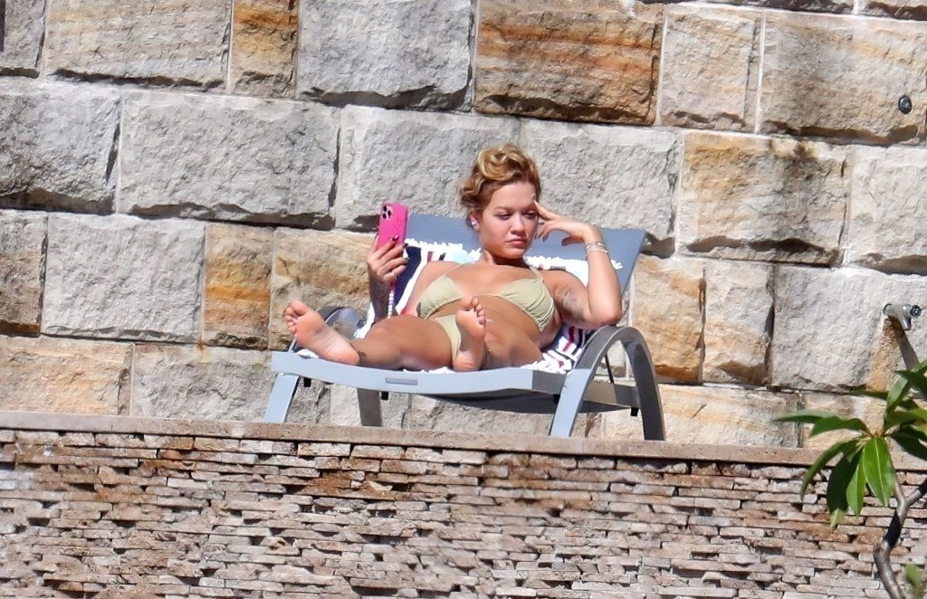 Cantora Rita Ora está ‘Quente Agora’ enquanto relaxa à beira da piscina usando um biquíni verde e mostrando seus seios nus para nós – Sydney, 31/03/2021.