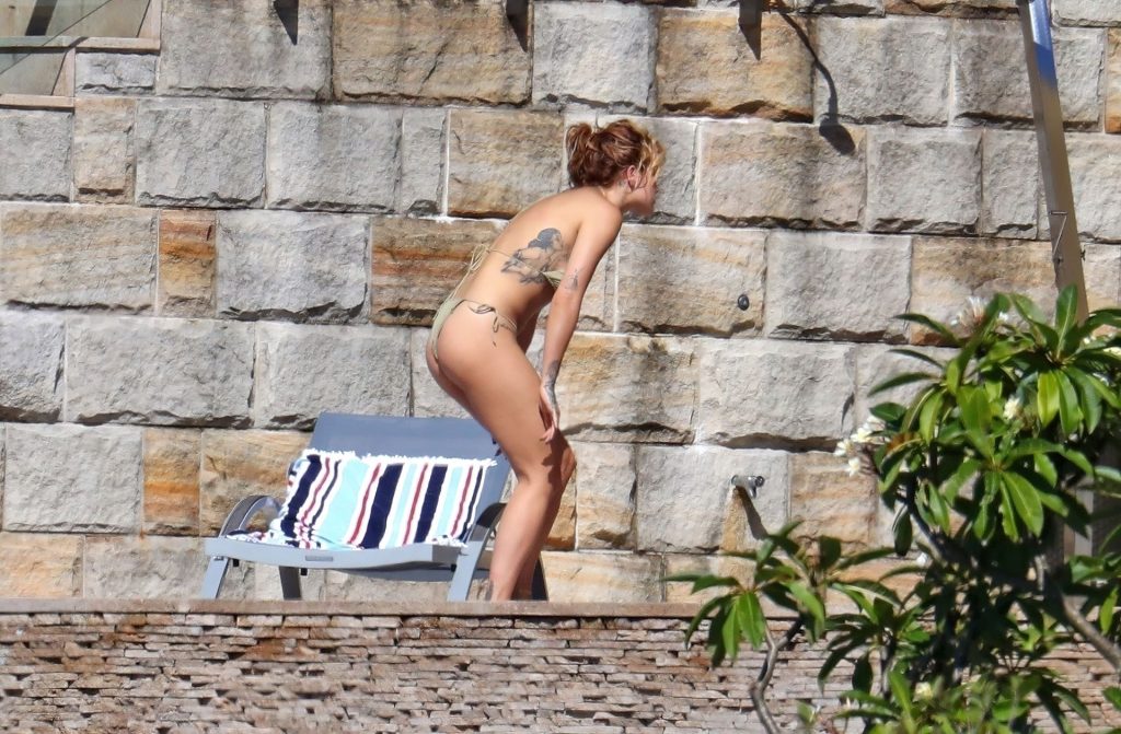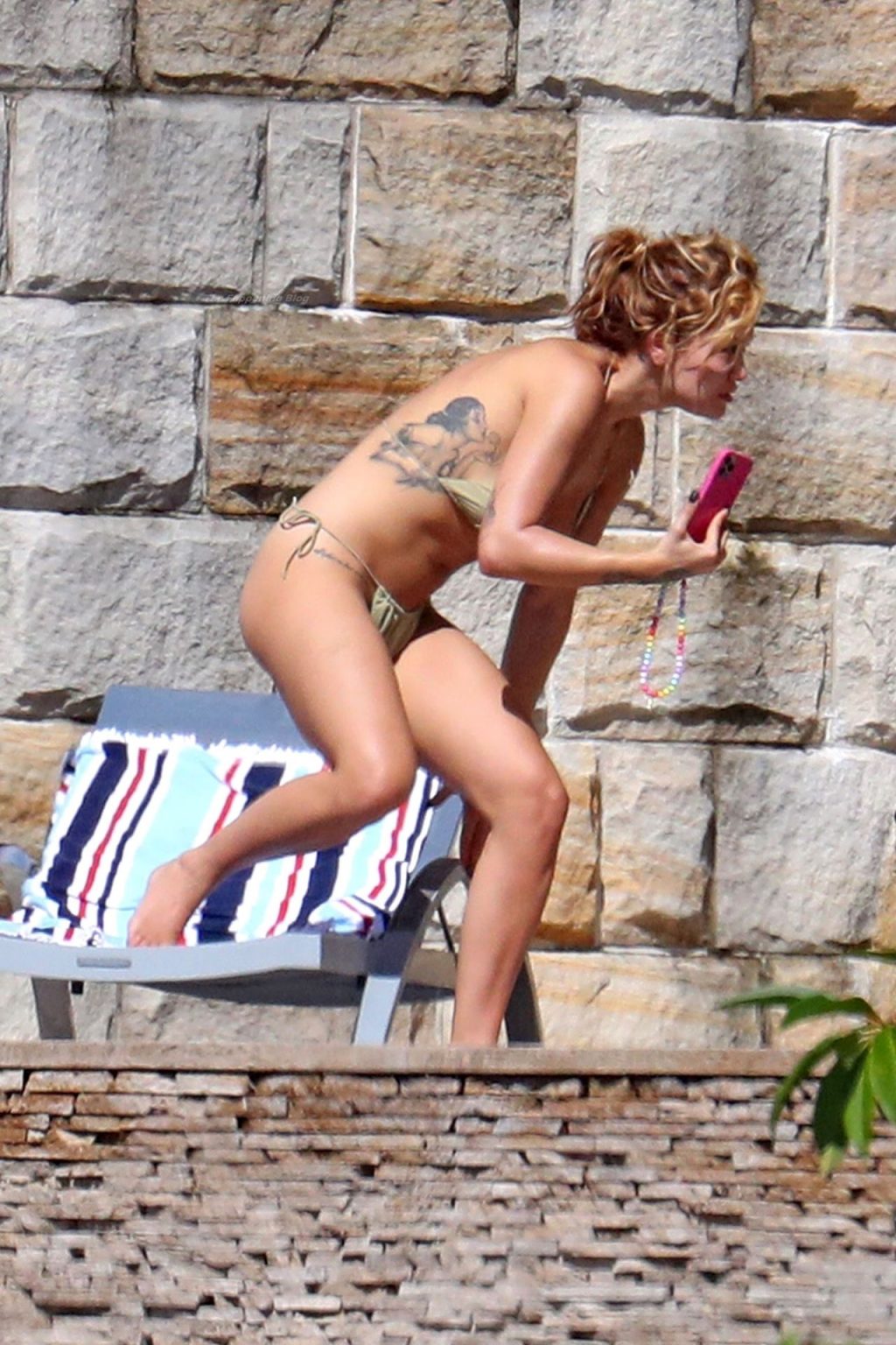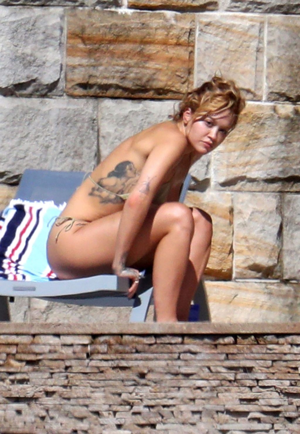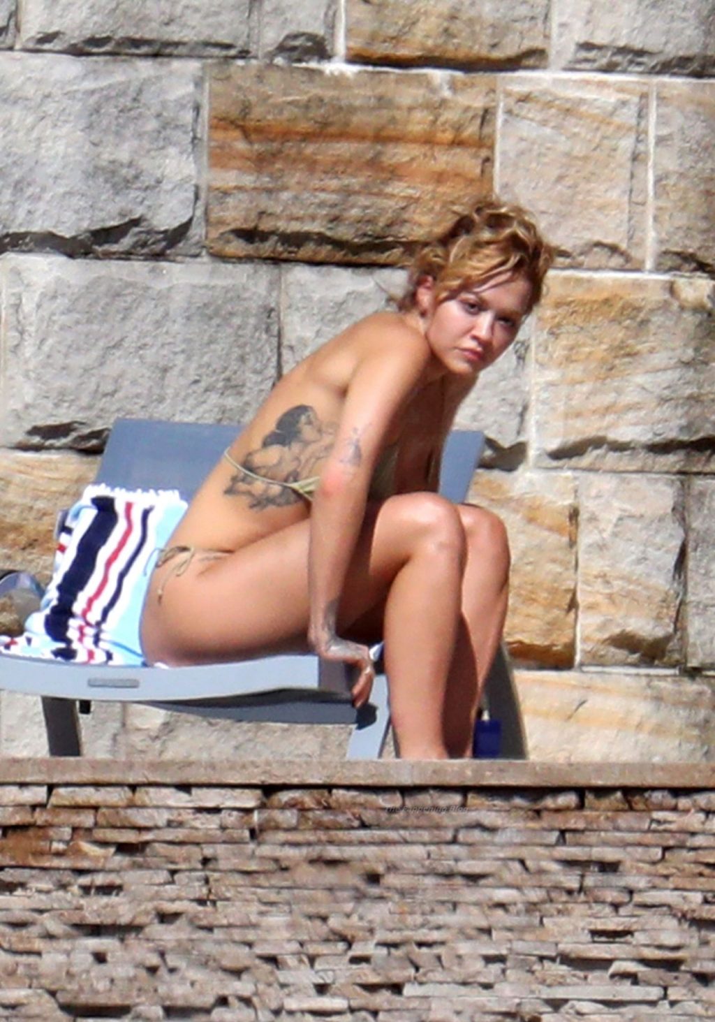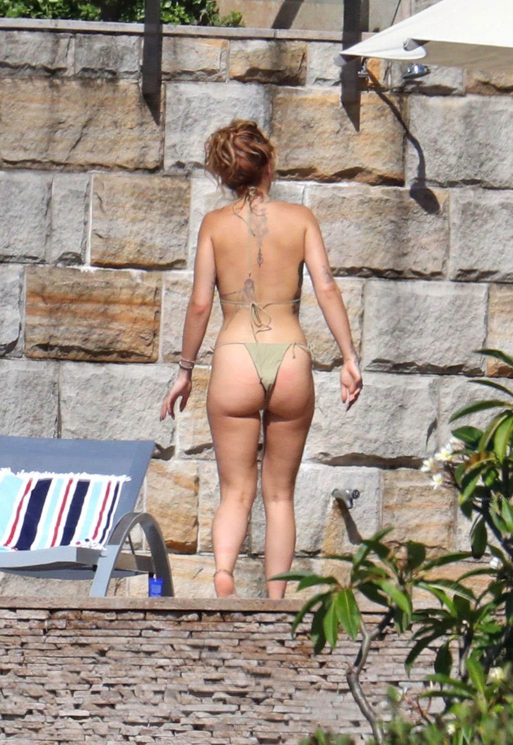 Cantora Rita Ora está ‘Quente Agora’ enquanto relaxa à beira da piscina usando um biquíni verde e mostrando seus seios nus para nós – Sydney, 31/03/2021.