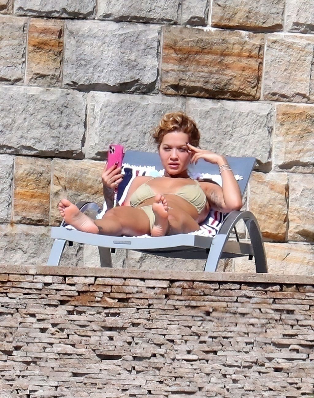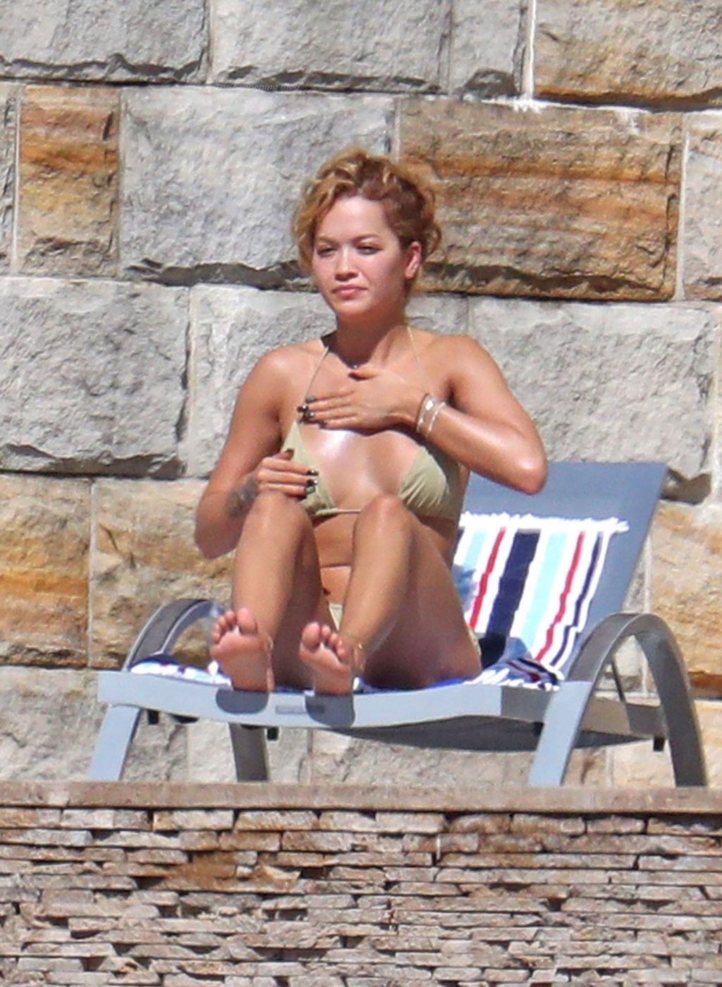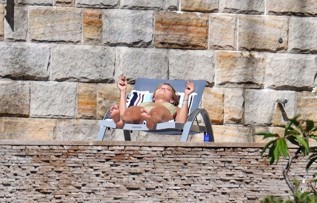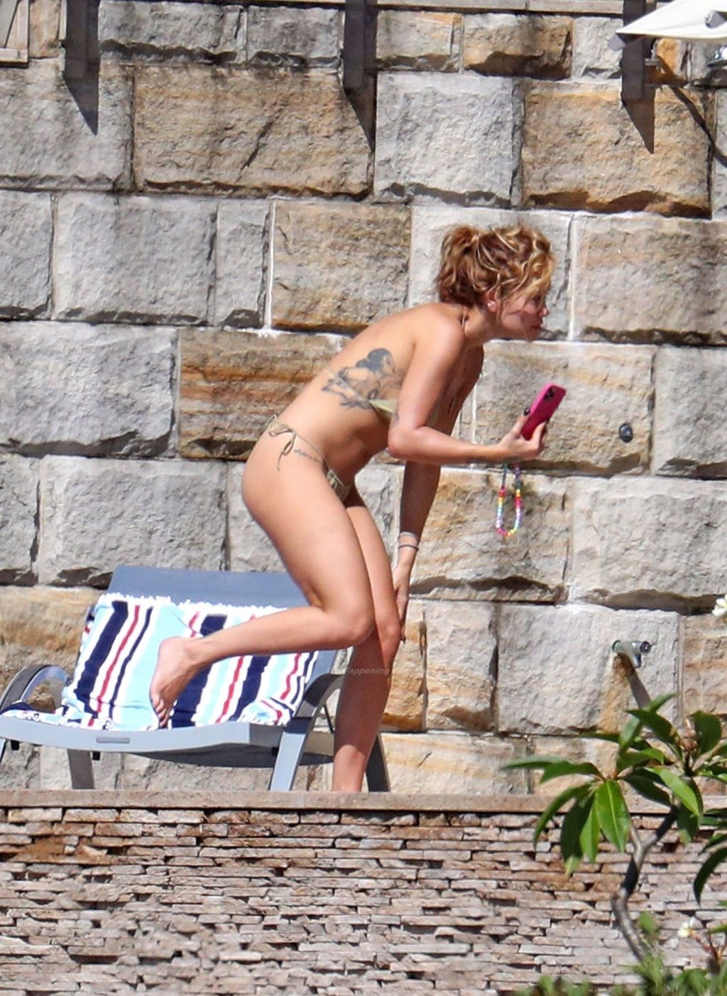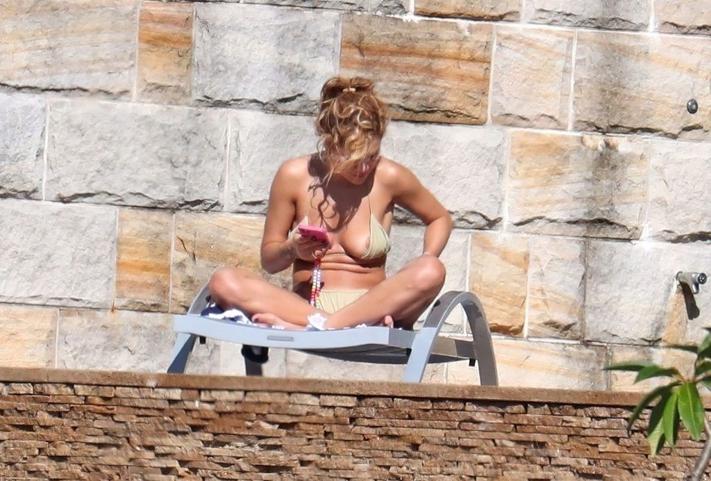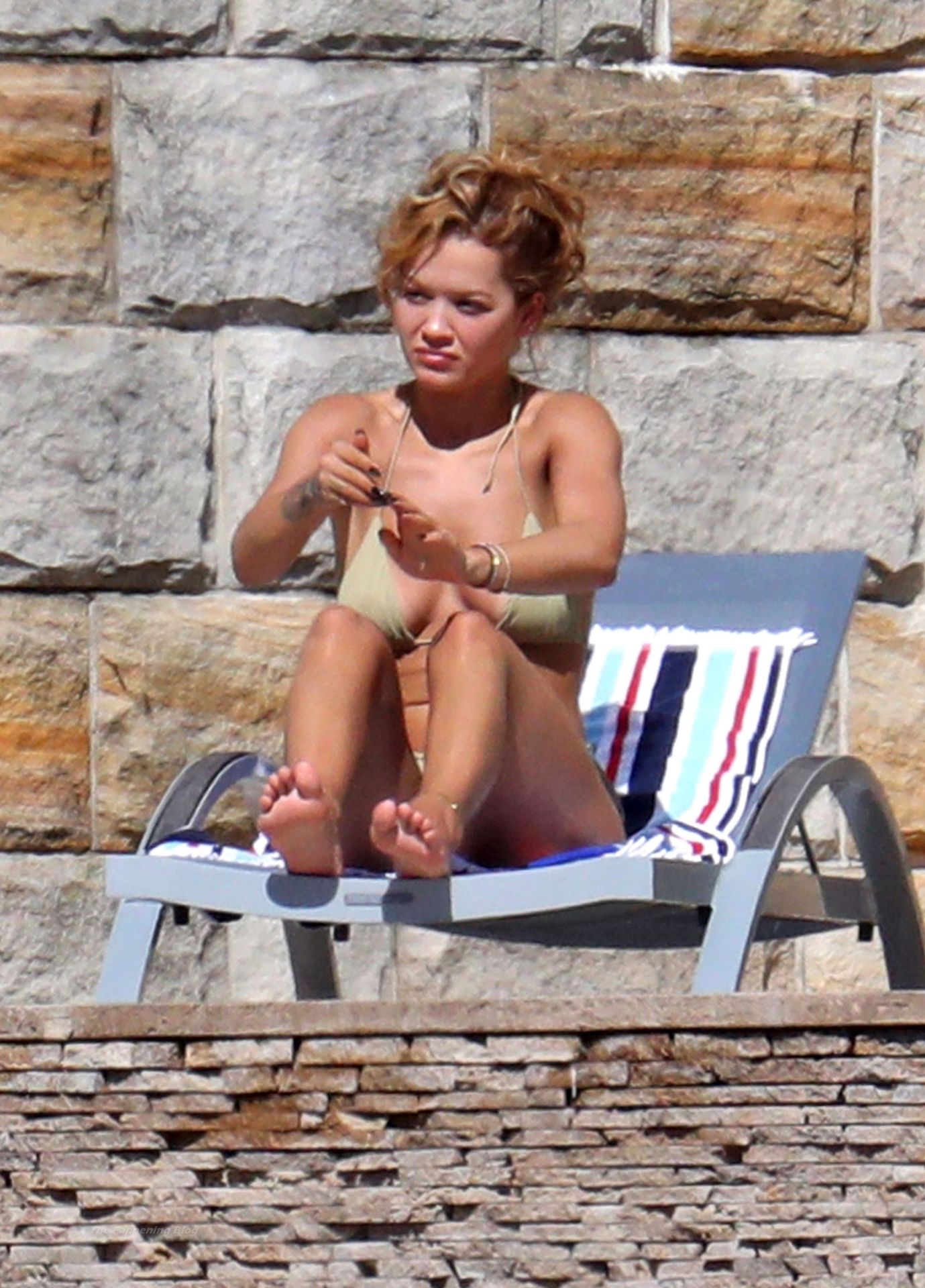 Cantora Rita Ora está ‘Quente Agora’ enquanto relaxa à beira da piscina usando um biquíni verde e mostrando seus seios nus para nós – Sydney, 31/03/2021.