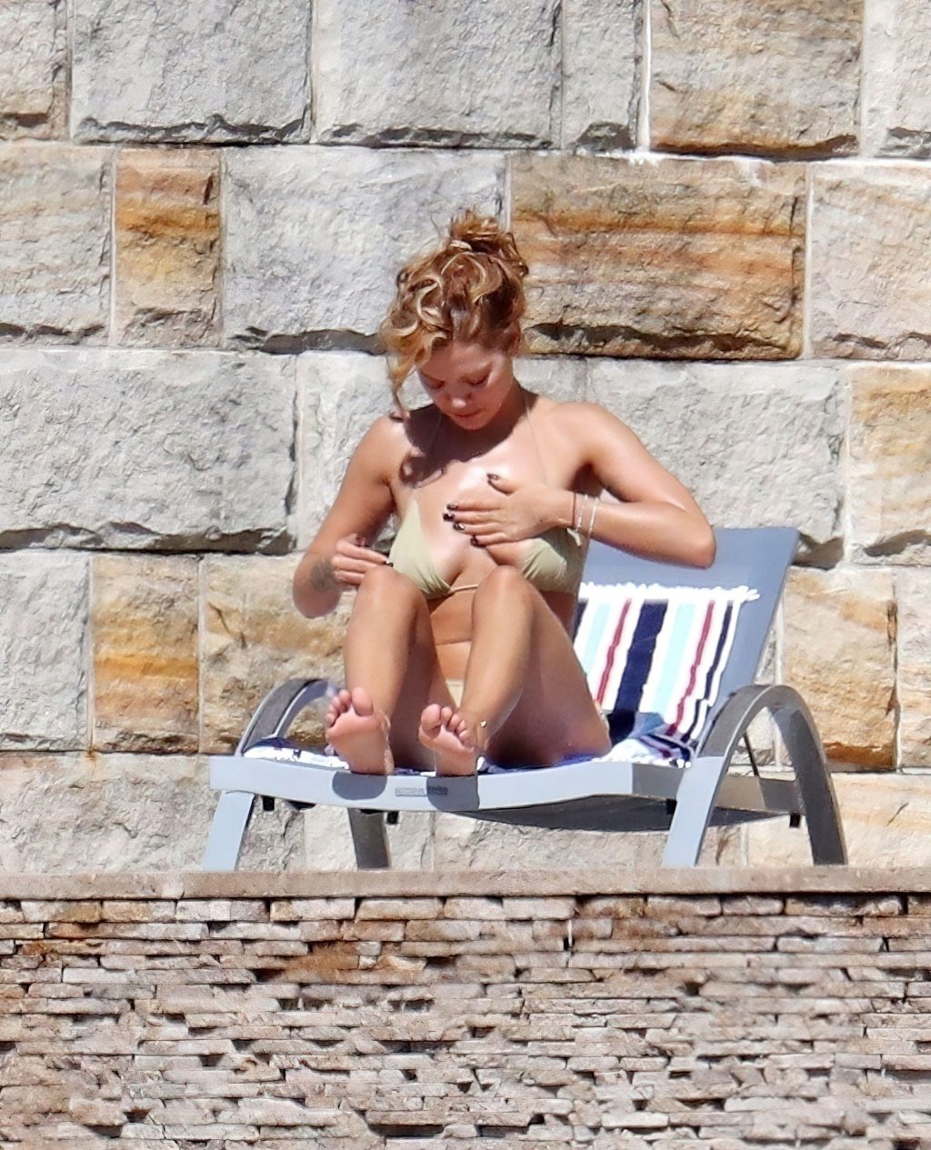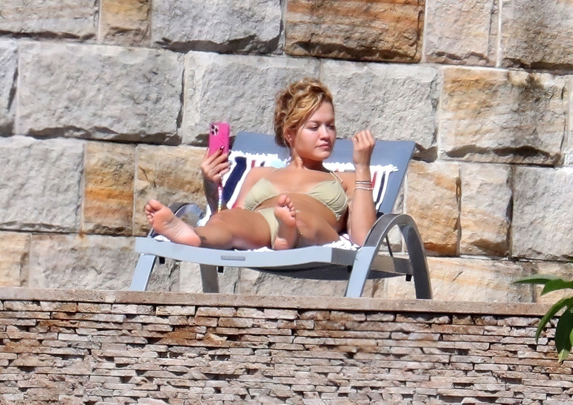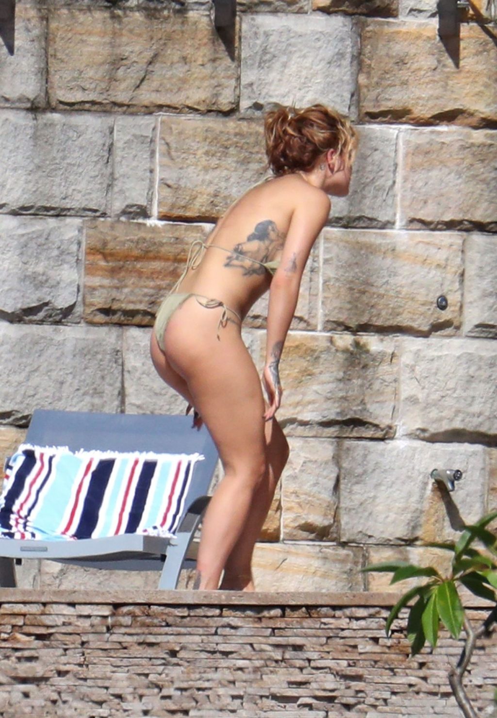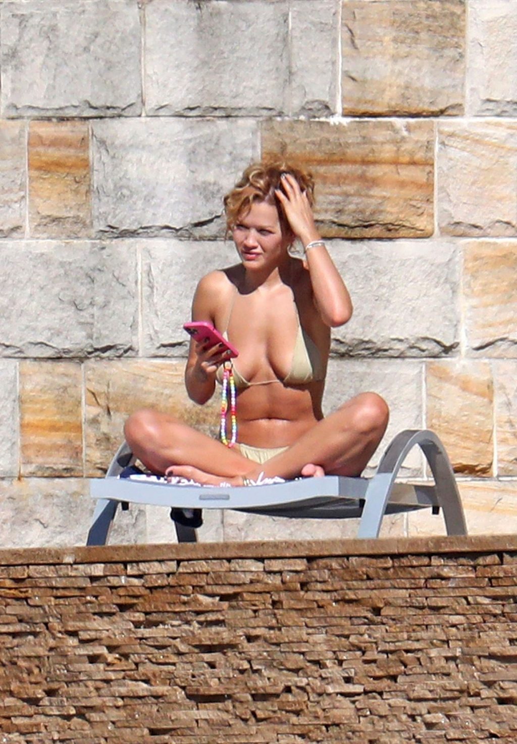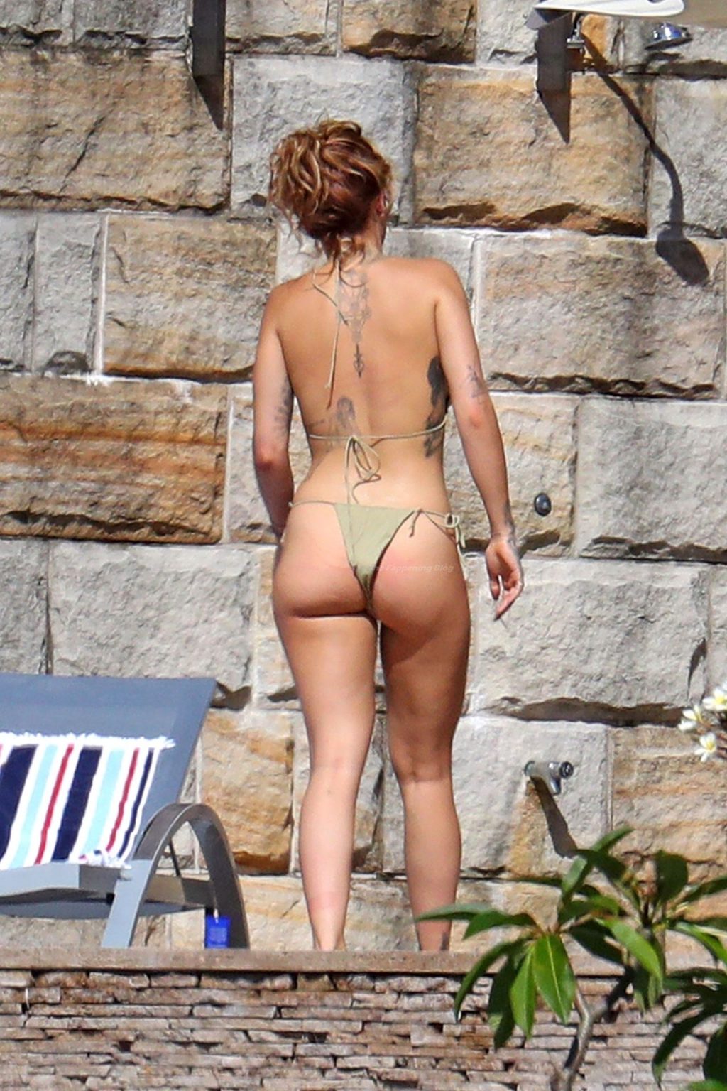 Cantora Rita Ora está ‘Quente Agora’ enquanto relaxa à beira da piscina usando um biquíni verde e mostrando seus seios nus para nós – Sydney, 31/03/2021.