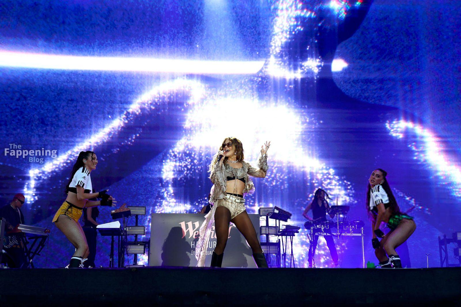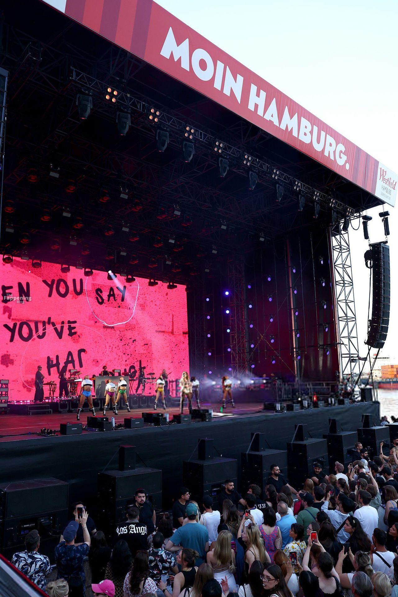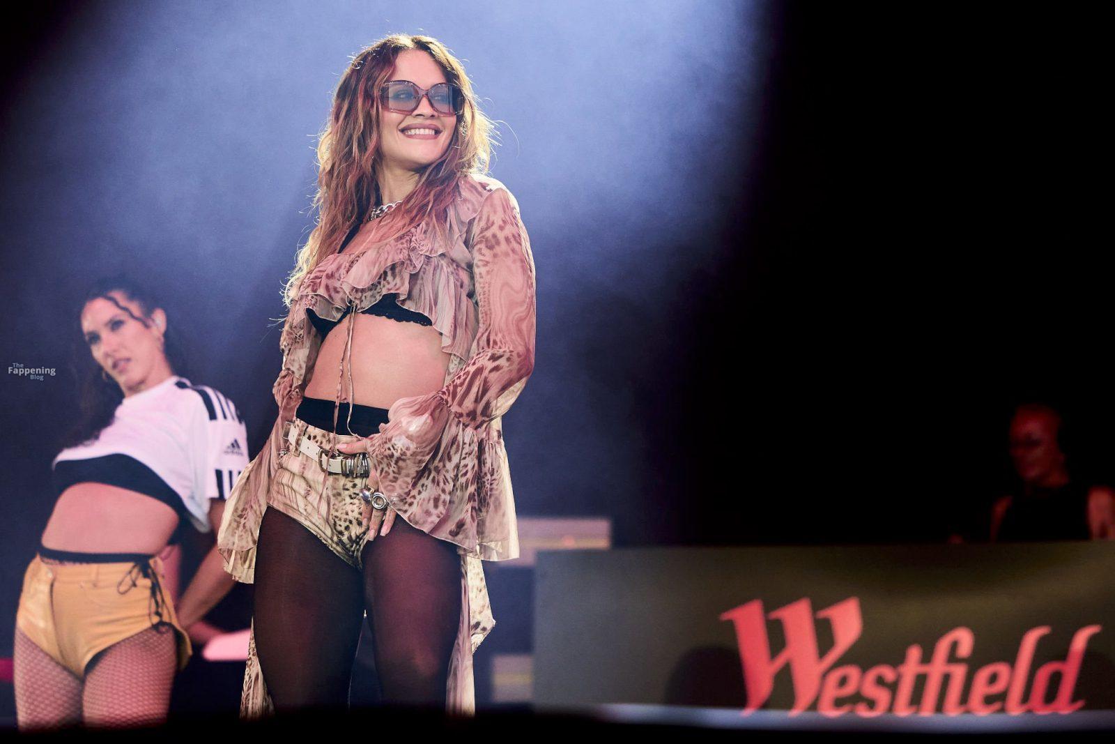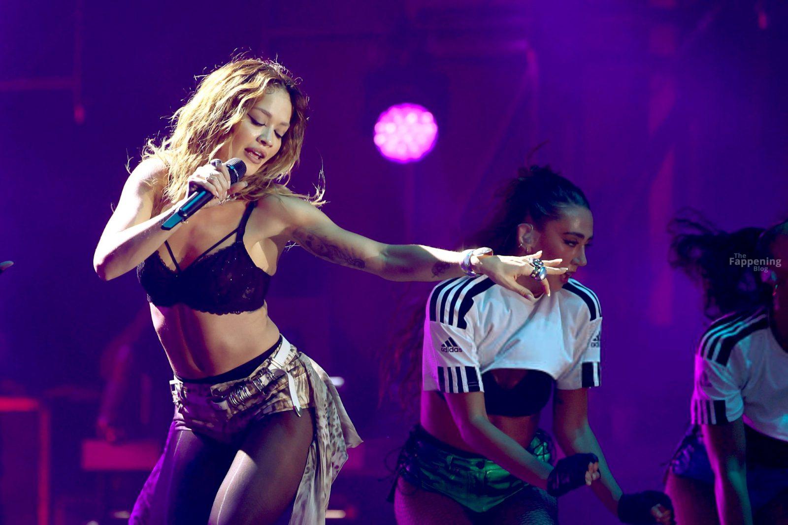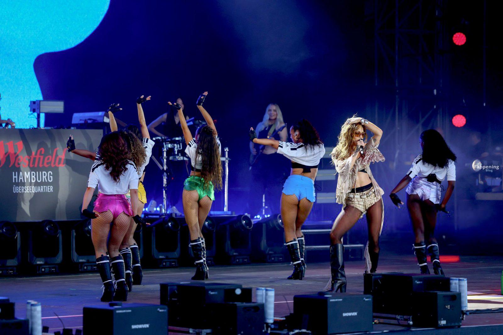 Rita Ora exibe suas pernas sexy e figura no palco em Hamburgo. A cantora de 34 anos usou um sutiã de renda preta e shorts curtíssimos enquanto animava o início da temporada no Westfield Hamburg-Überseequartier.