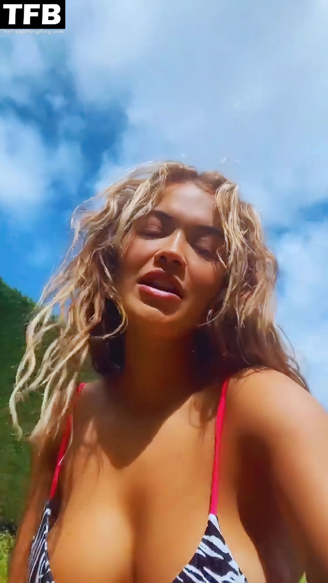 A cantora Rita Ora nos provoca com seus lindos seios naturais, mostrando sua aréola, posando em um biquíni minúsculo no novo vídeo do Instagram abaixo (2021).