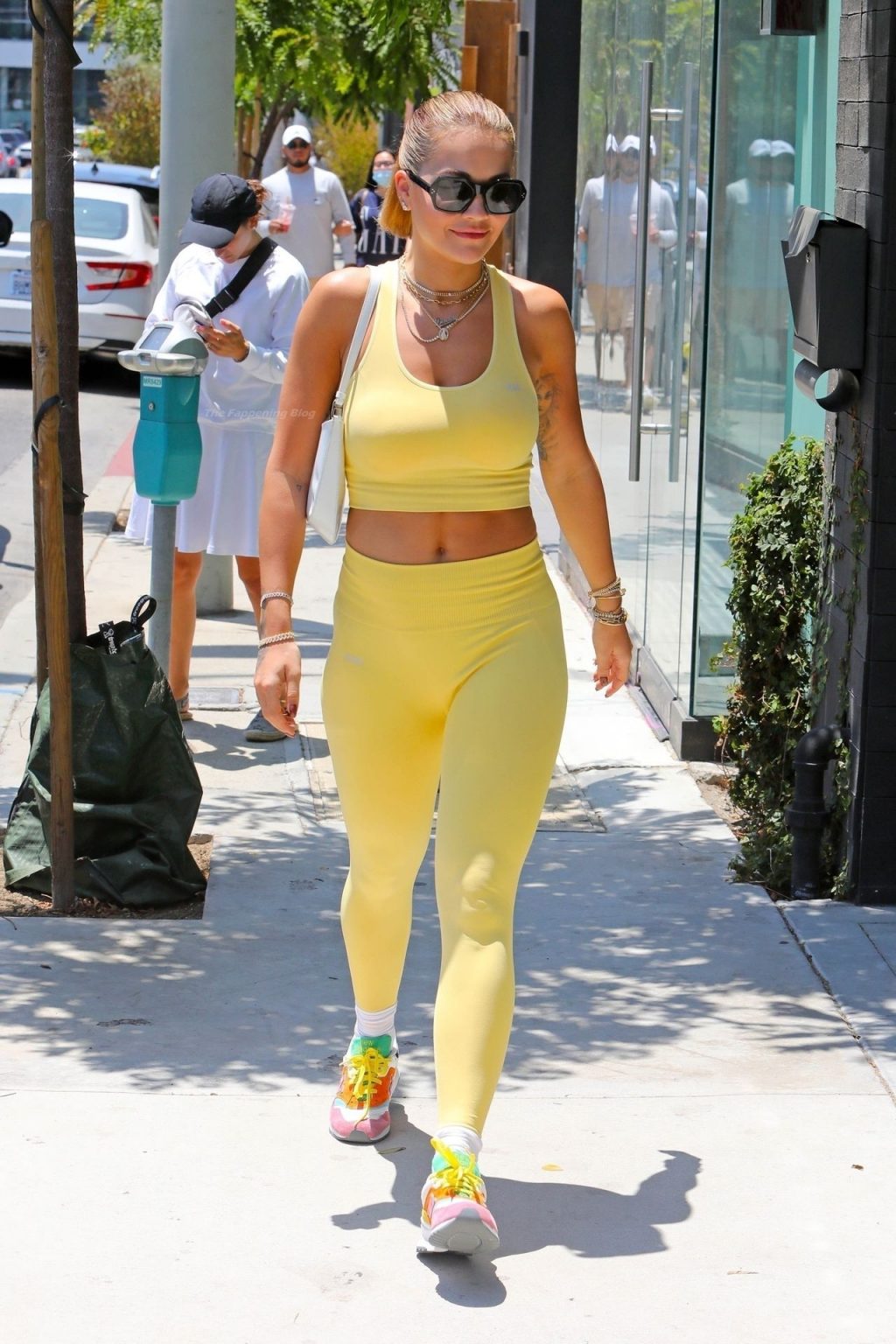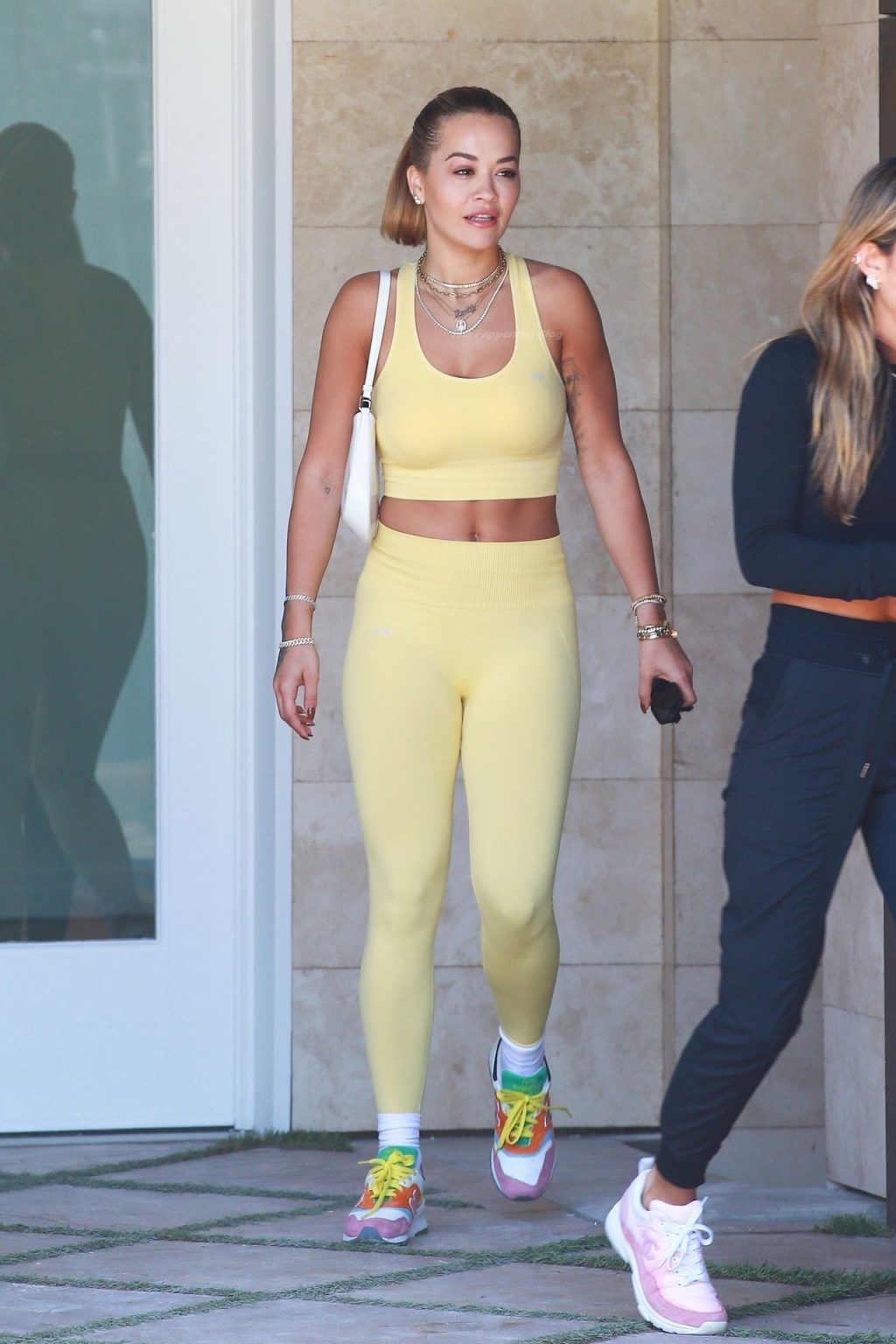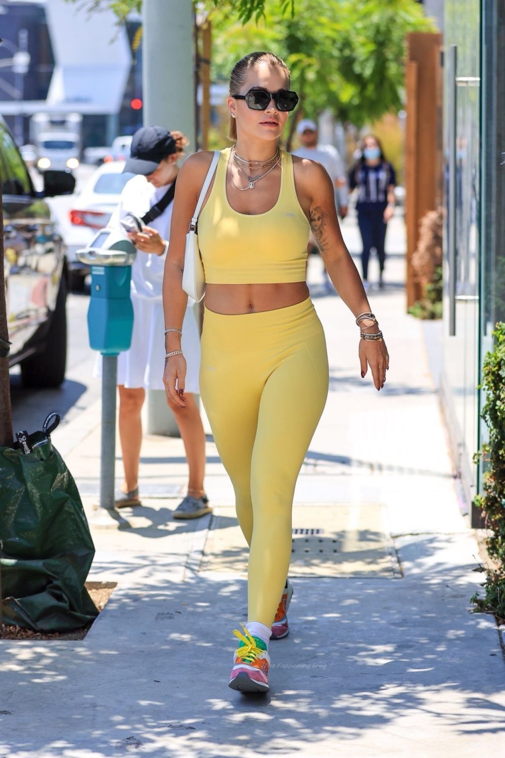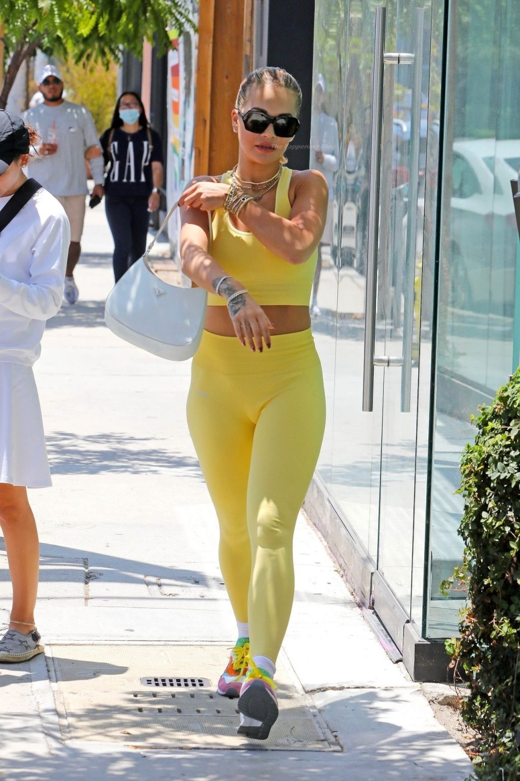 A cantora britânica Rita Ora impressiona com um look amarelo enquanto vai para a aula de Pilates segurando uma bolsa Prada em L.A. esta tarde.