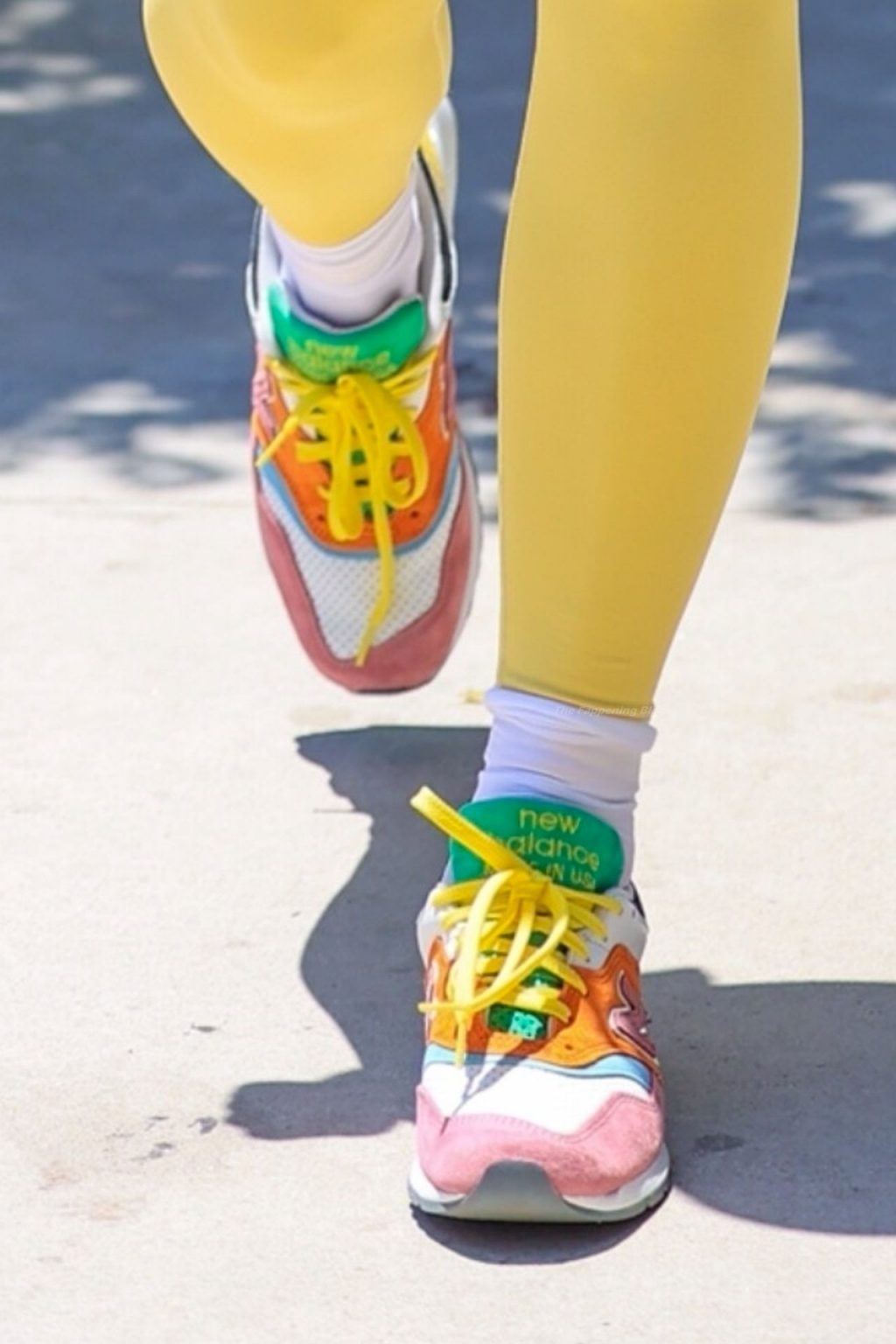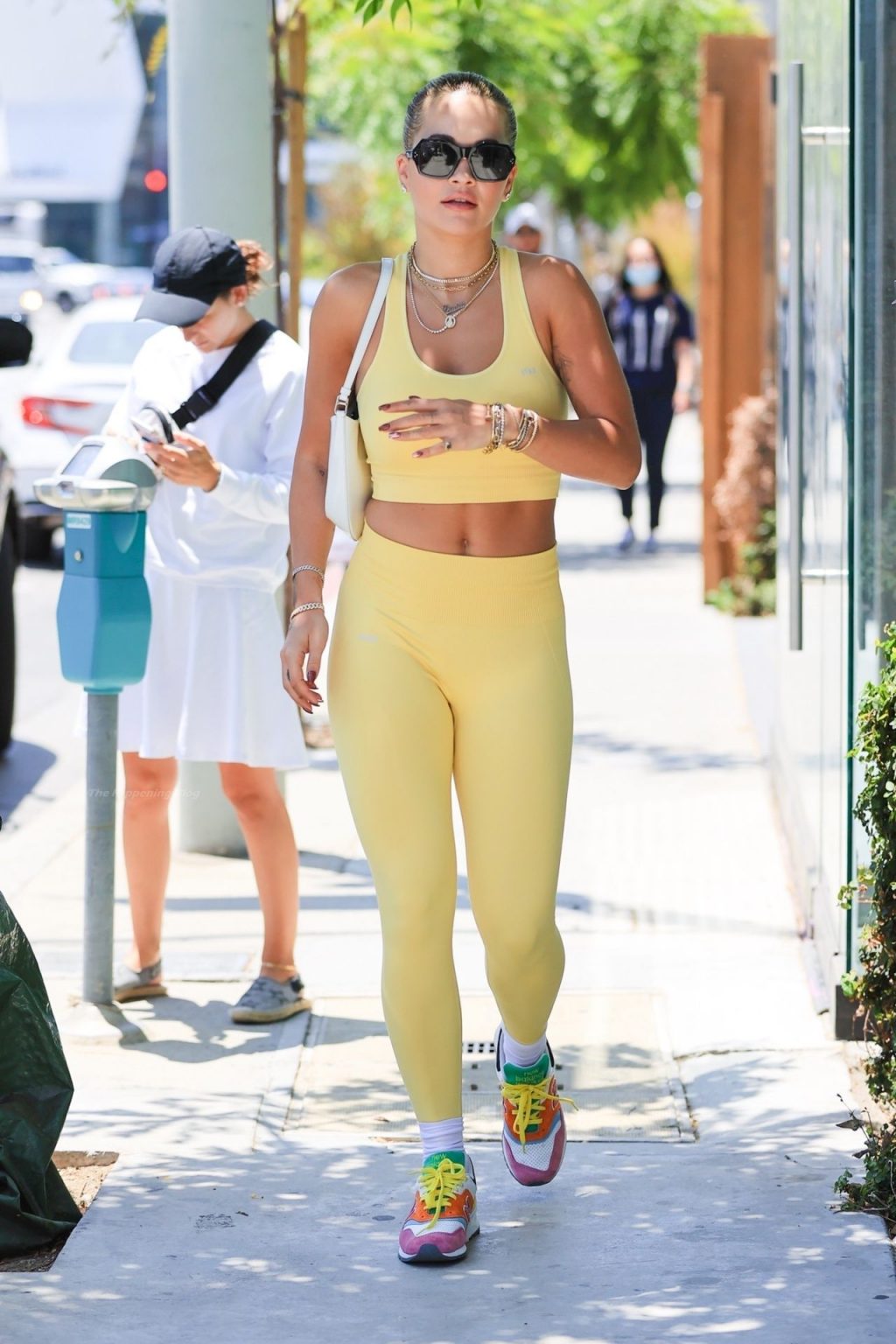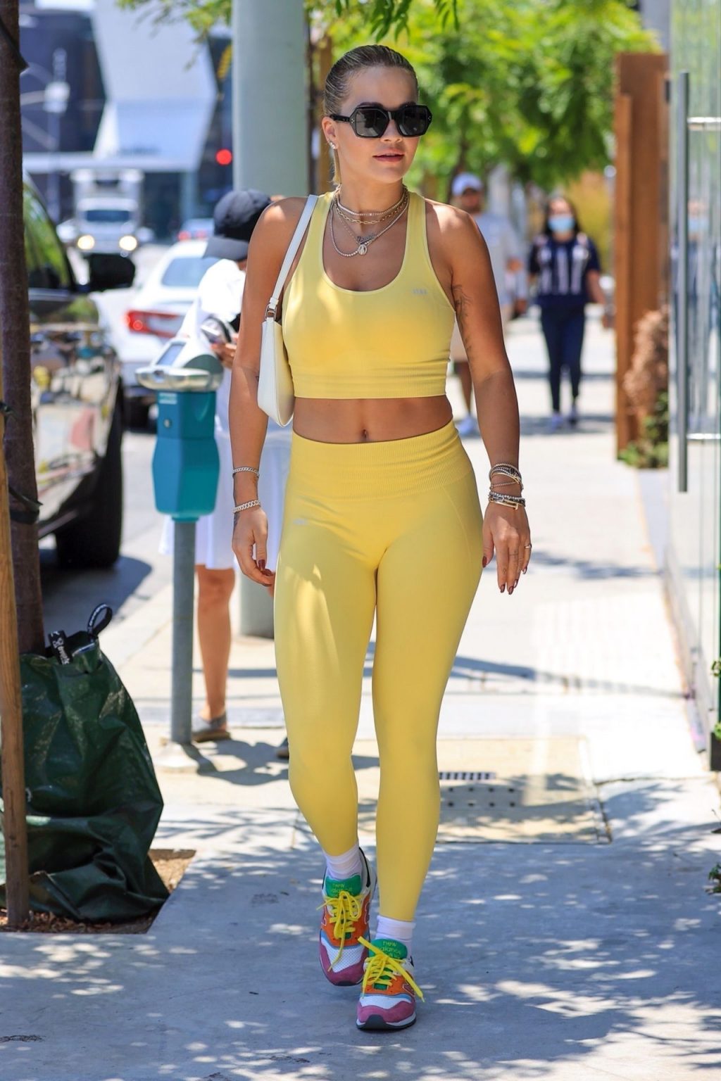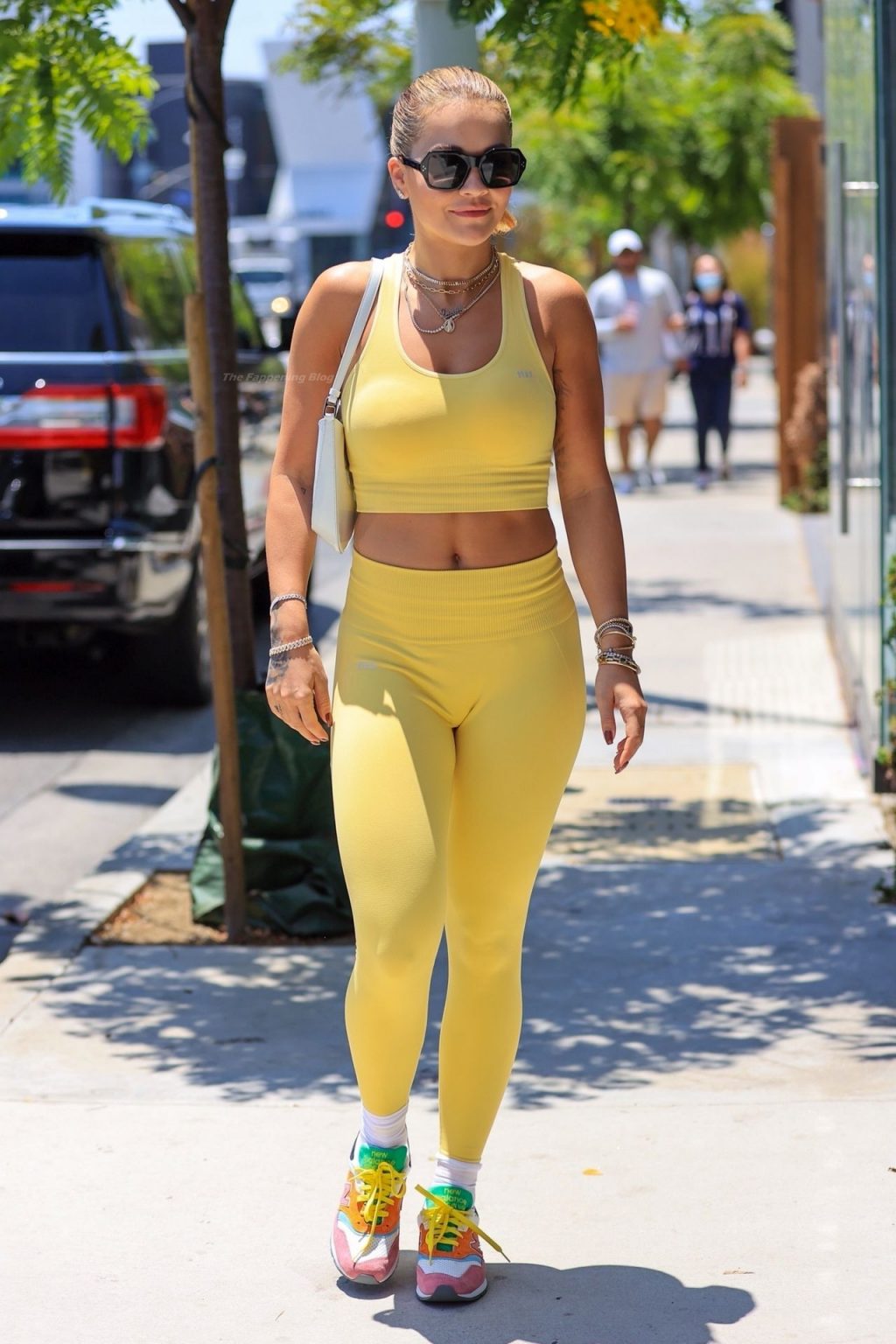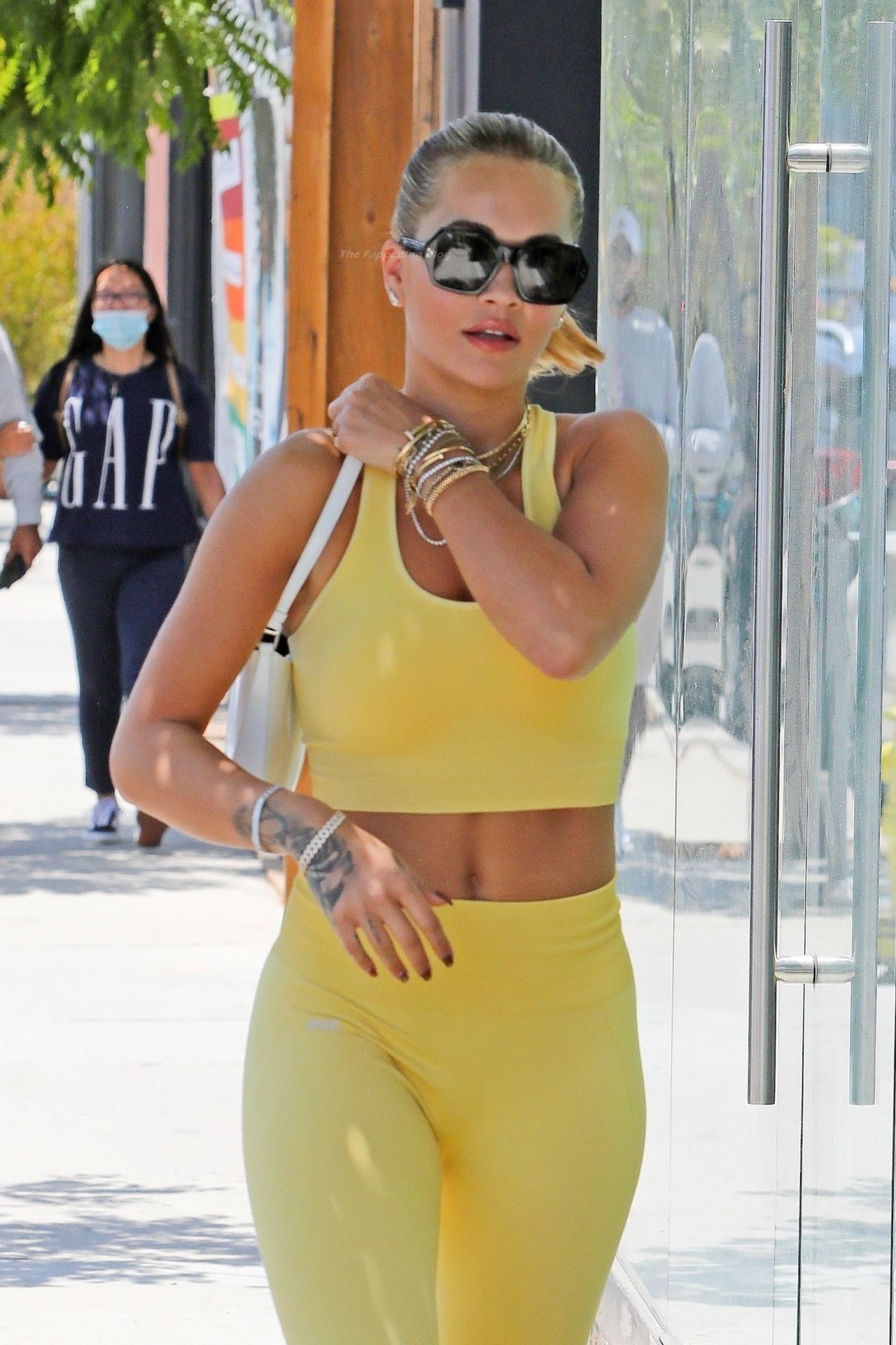 A cantora britânica Rita Ora impressiona com um look amarelo enquanto vai para a aula de Pilates segurando uma bolsa Prada em L.A. esta tarde.