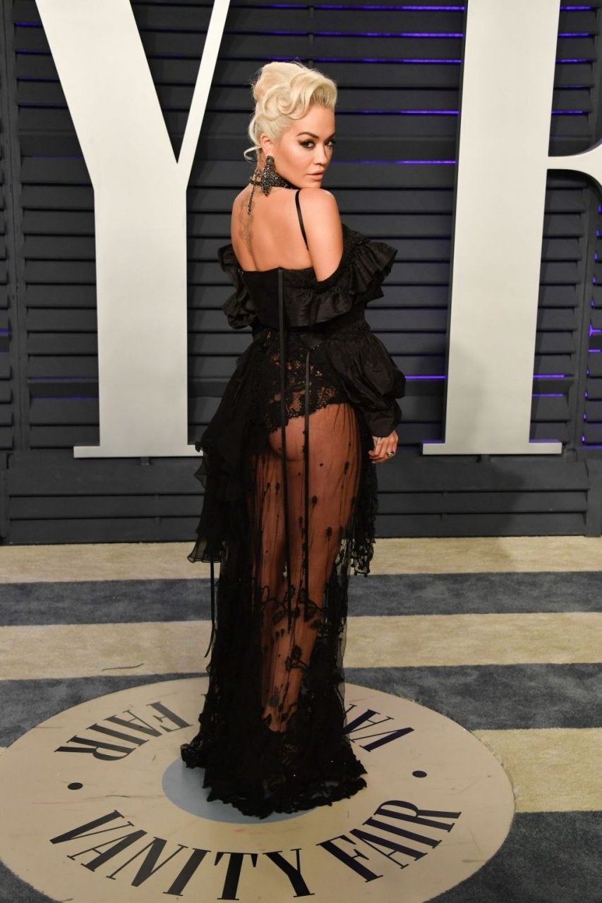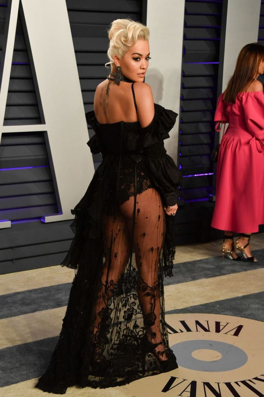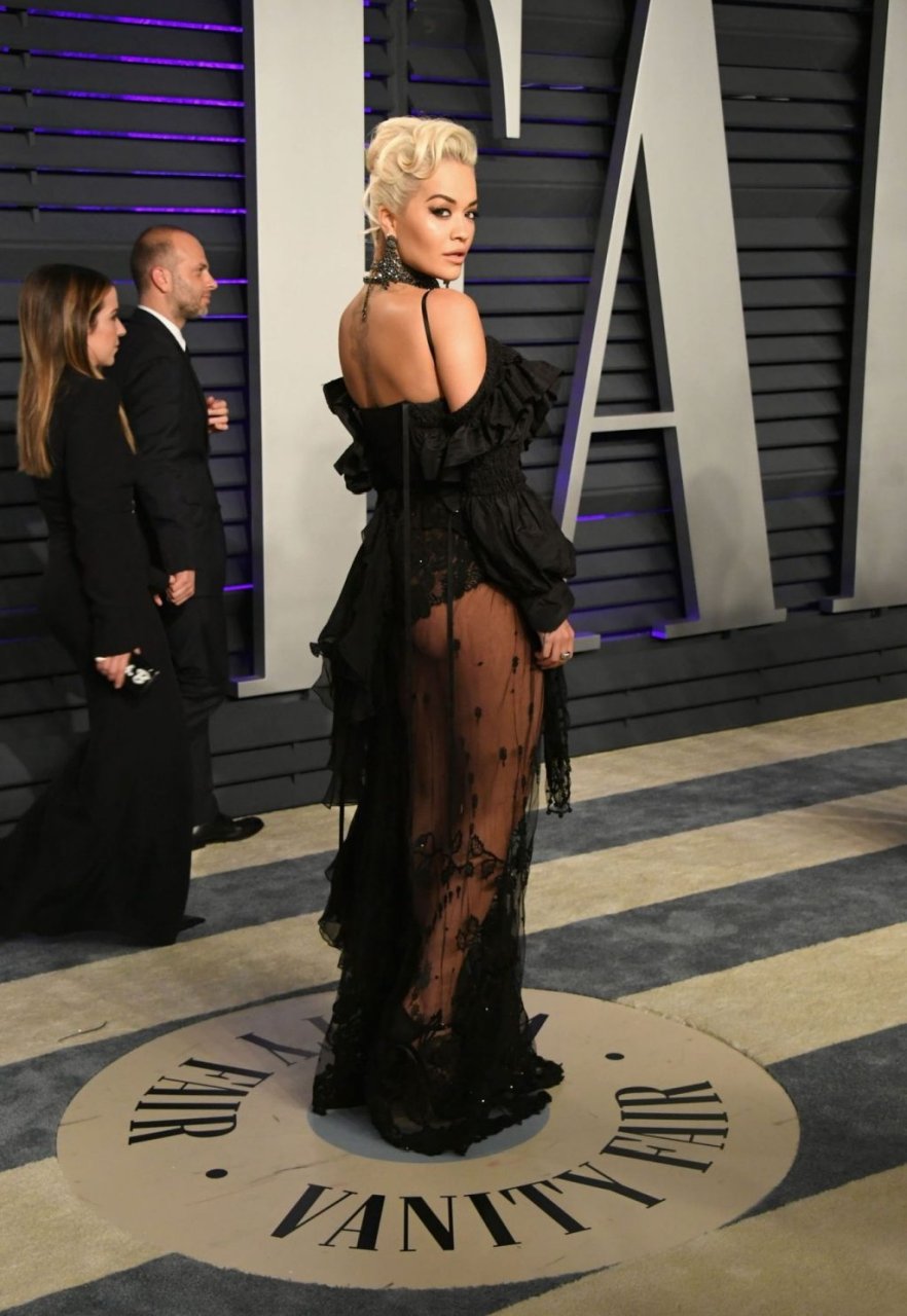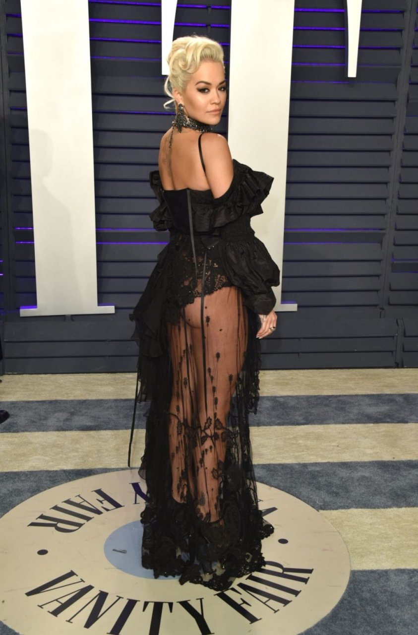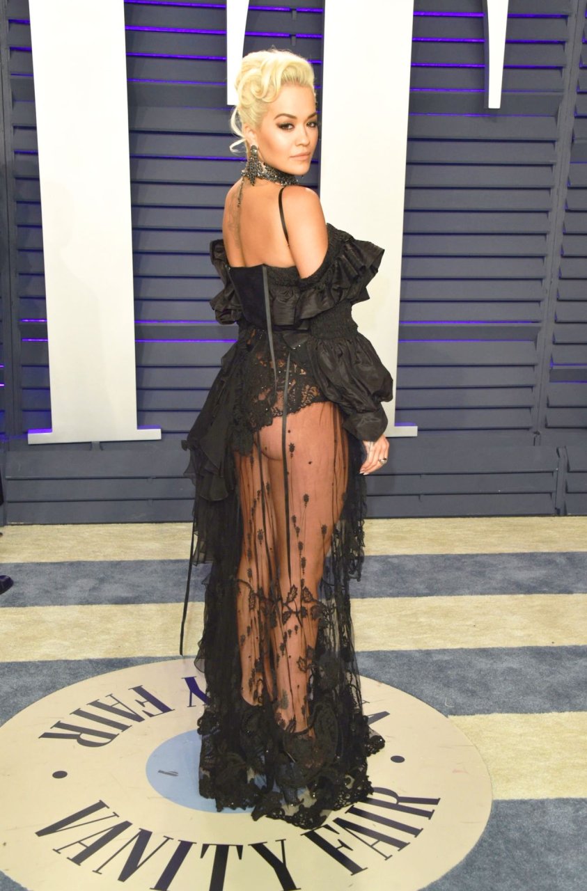 Superstar Rita Ora mostra seu decote e bumbum usando um vestido preto com lingerie de renda na festa Vanity Fair Oscar de 2019 em Beverly Hills, 24/02/2019.