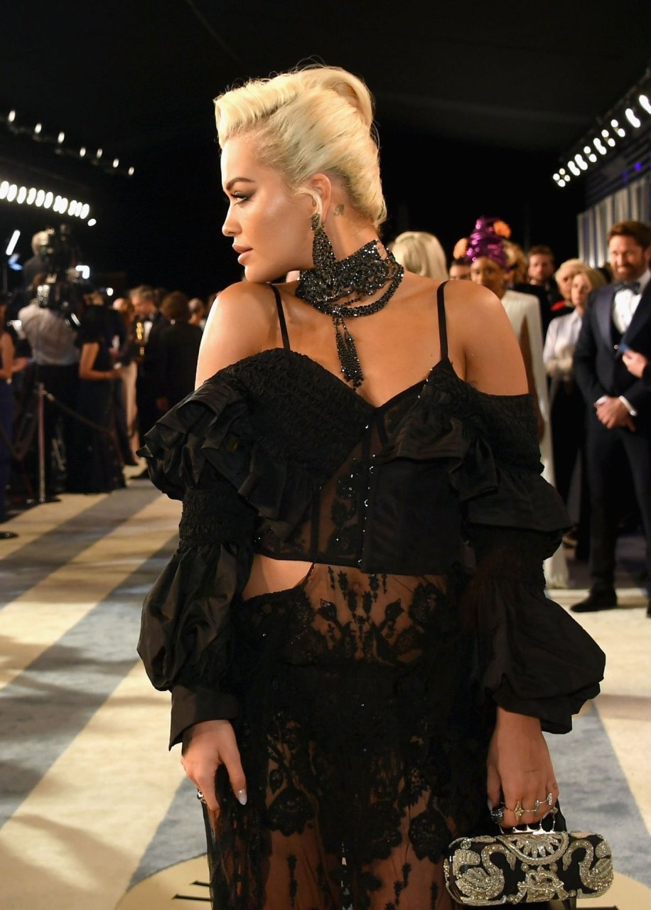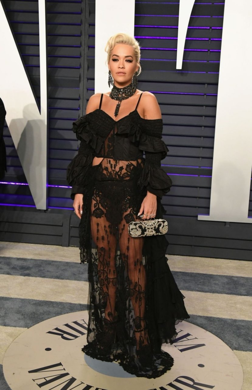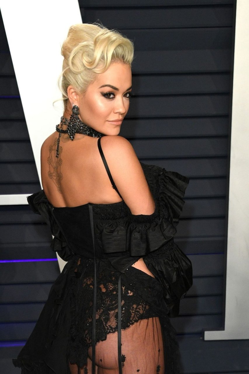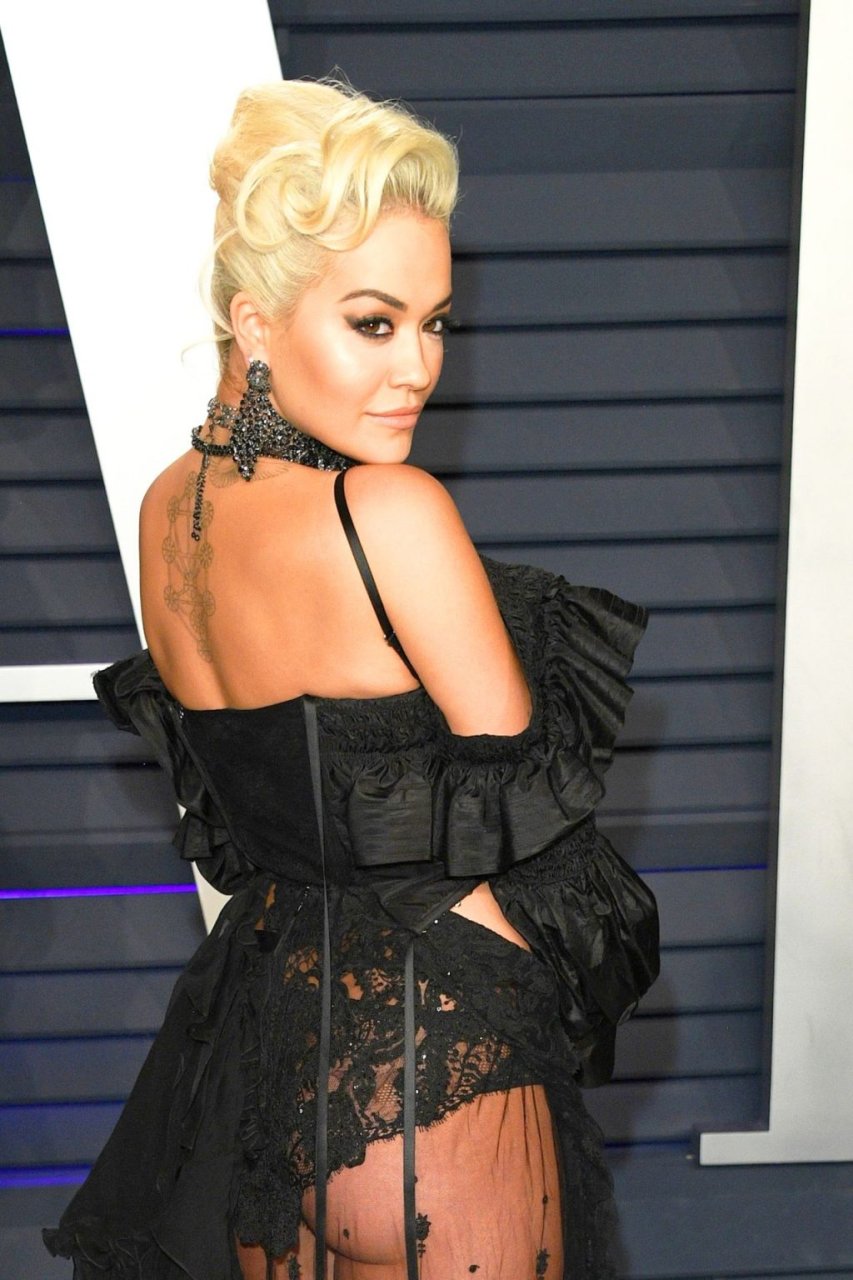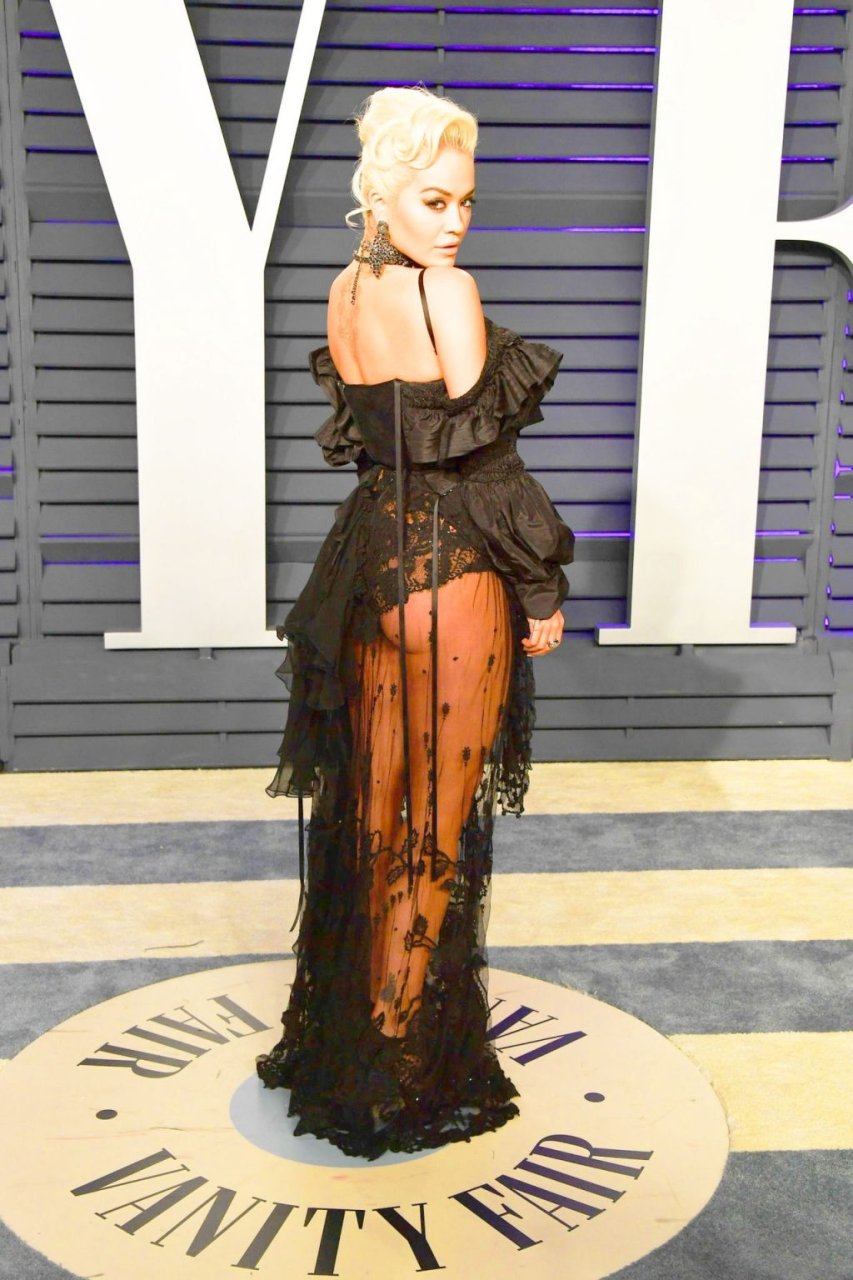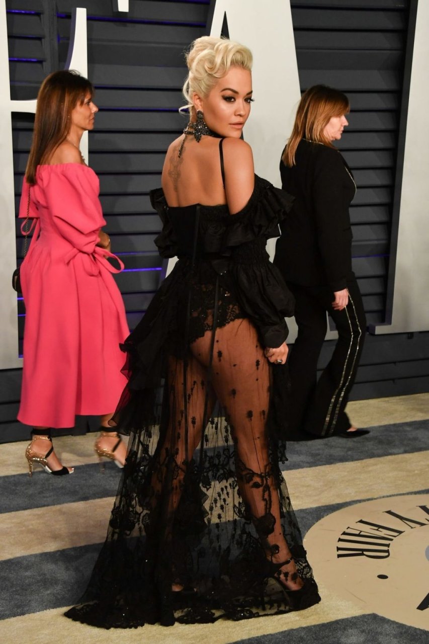 Superstar Rita Ora mostra seu decote e bumbum usando um vestido preto com lingerie de renda na festa Vanity Fair Oscar de 2019 em Beverly Hills, 24/02/2019.