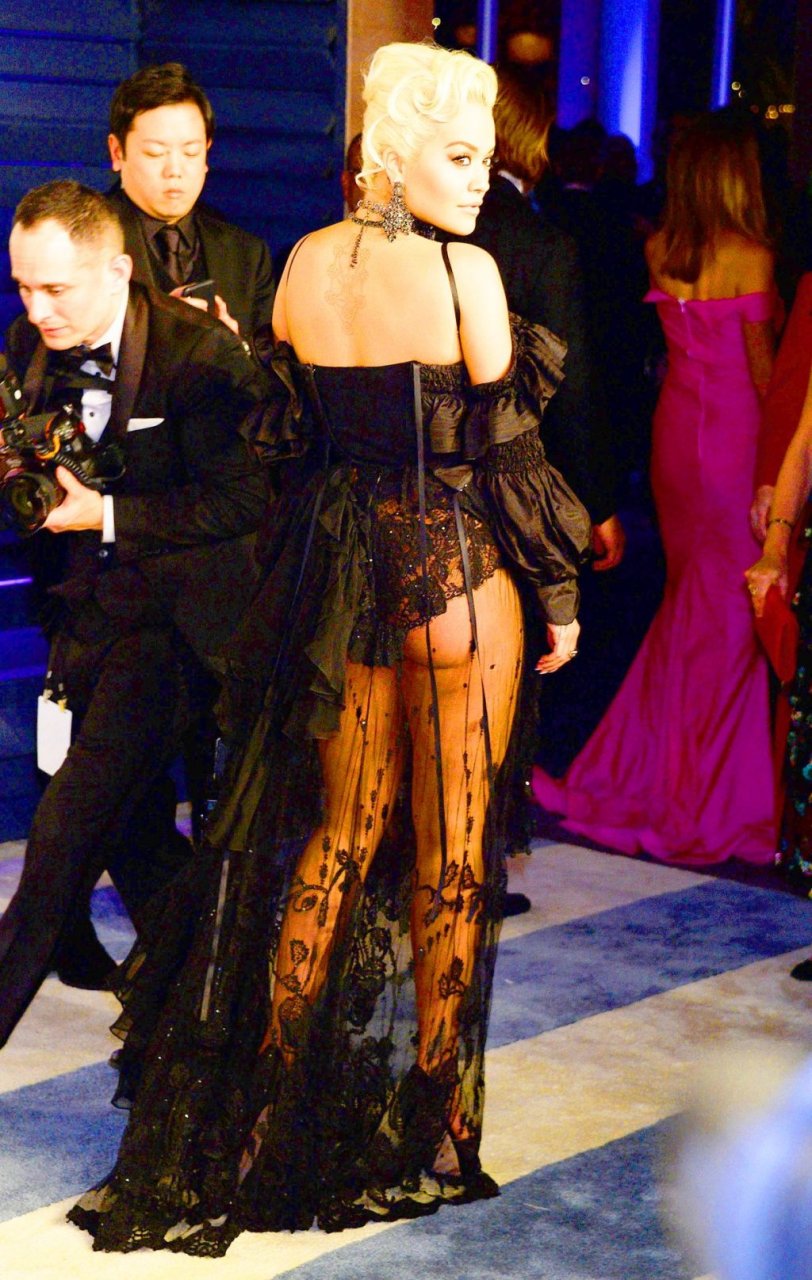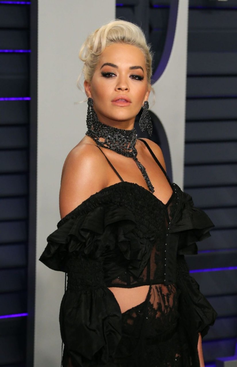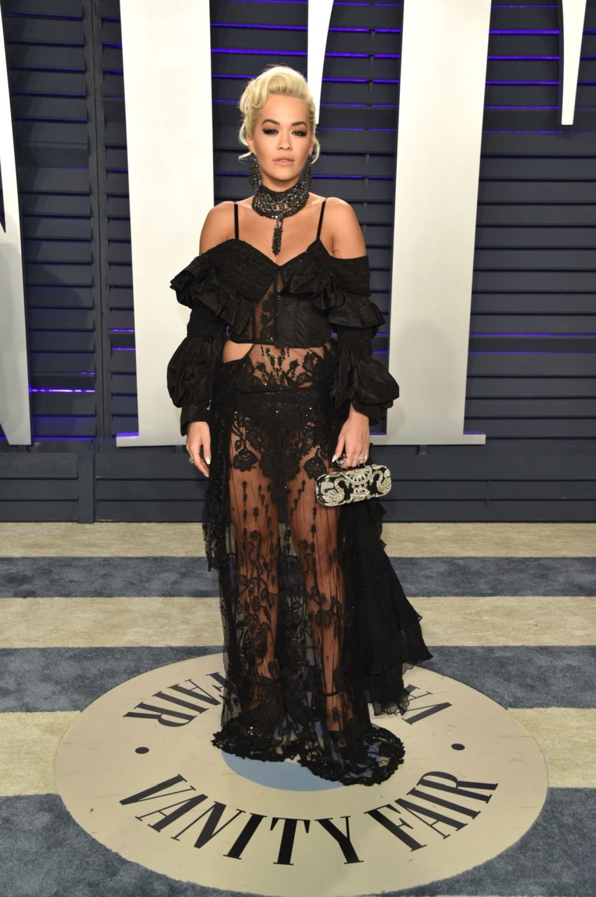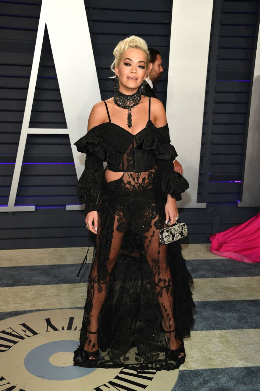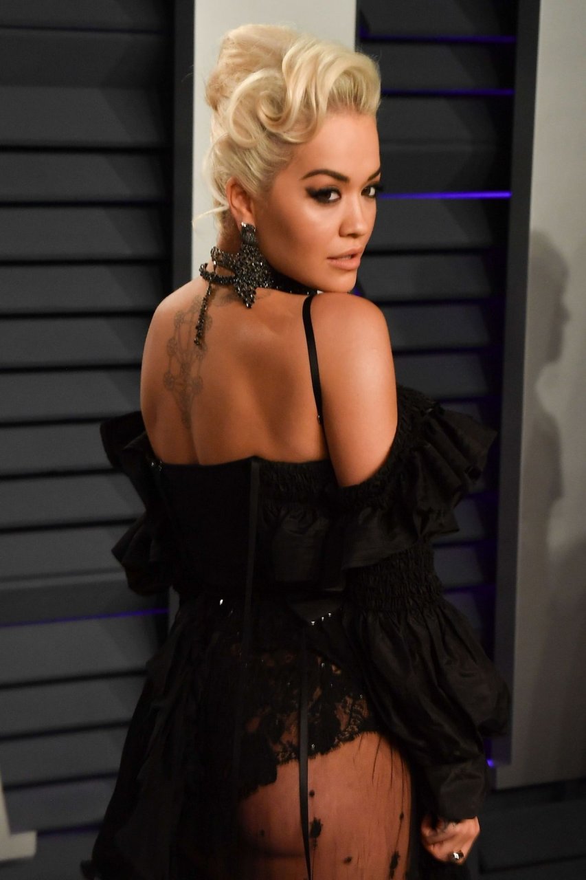 Superstar Rita Ora mostra seu decote e bumbum usando um vestido preto com lingerie de renda na festa Vanity Fair Oscar de 2019 em Beverly Hills, 24/02/2019.