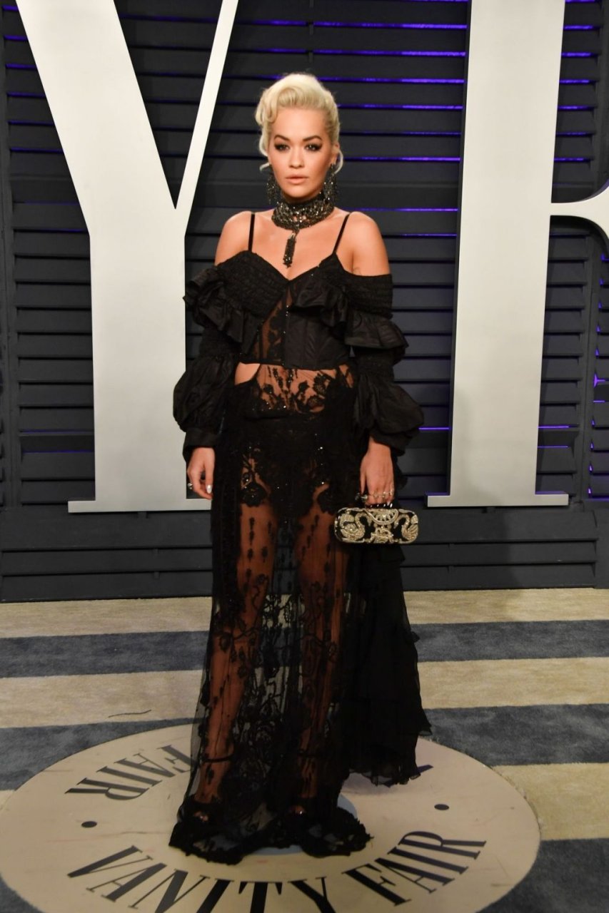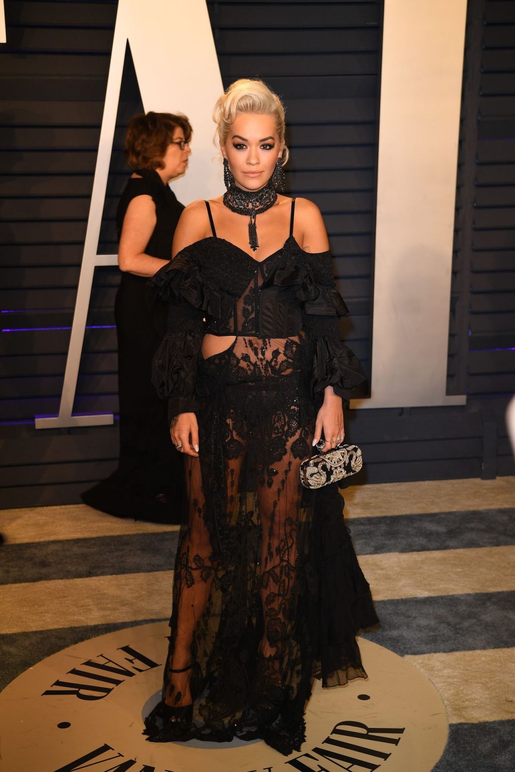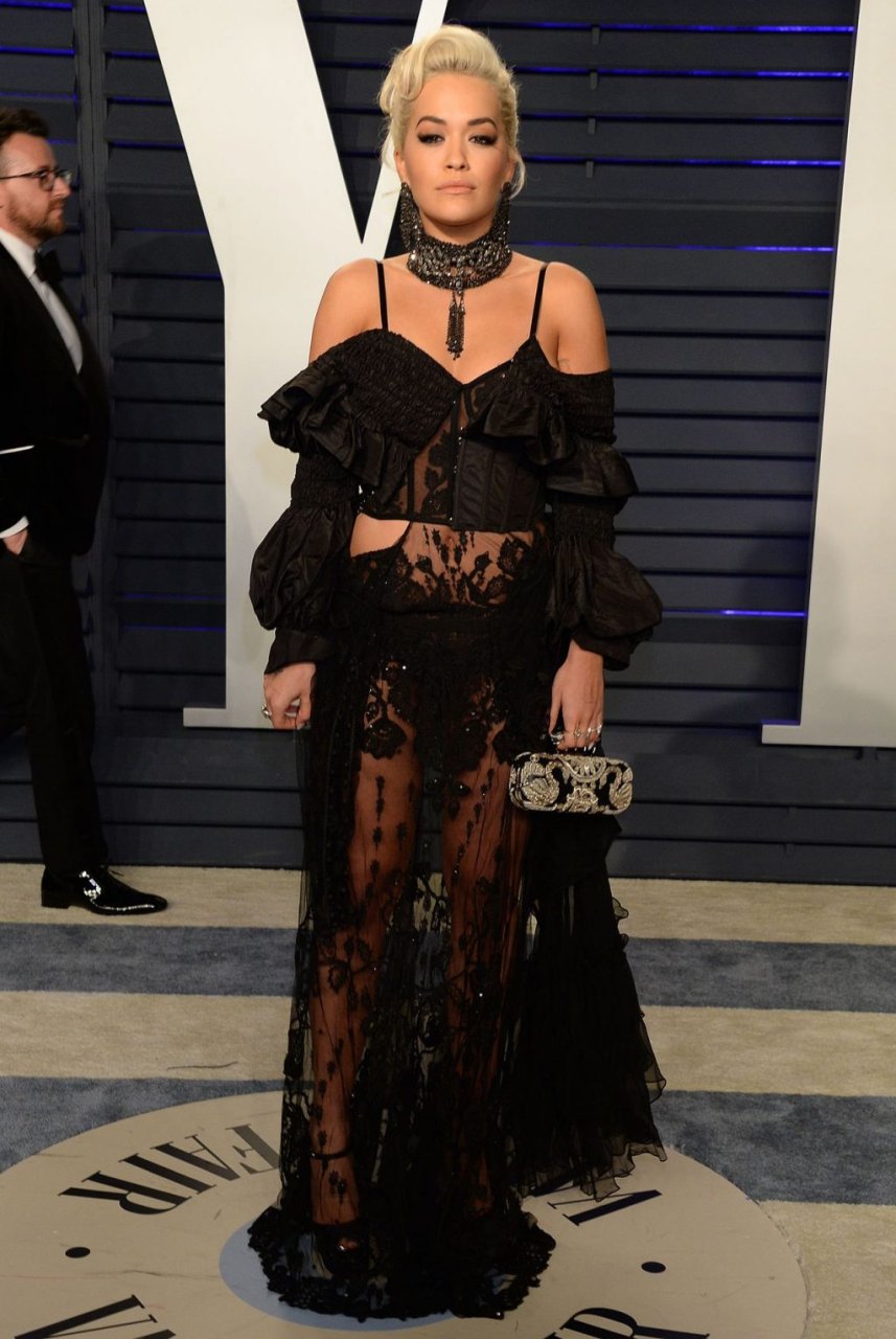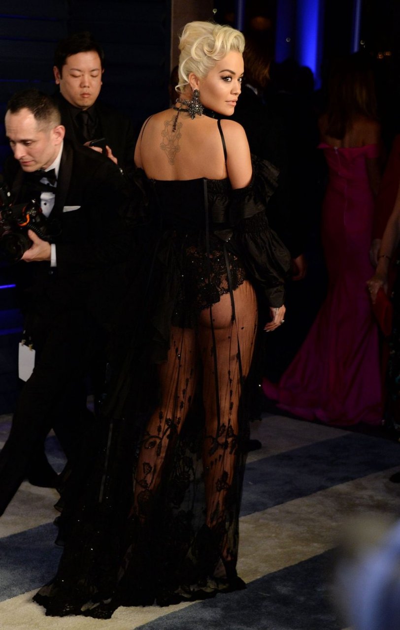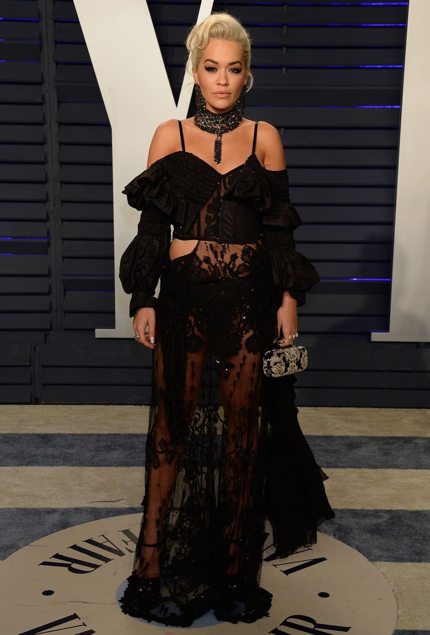 Superstar Rita Ora mostra seu decote e bumbum usando um vestido preto com lingerie de renda na festa Vanity Fair Oscar de 2019 em Beverly Hills, 24/02/2019.