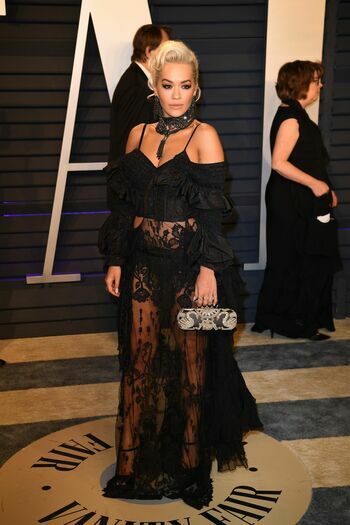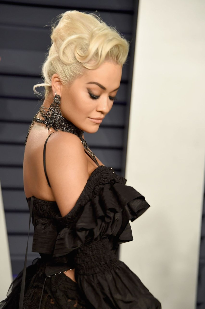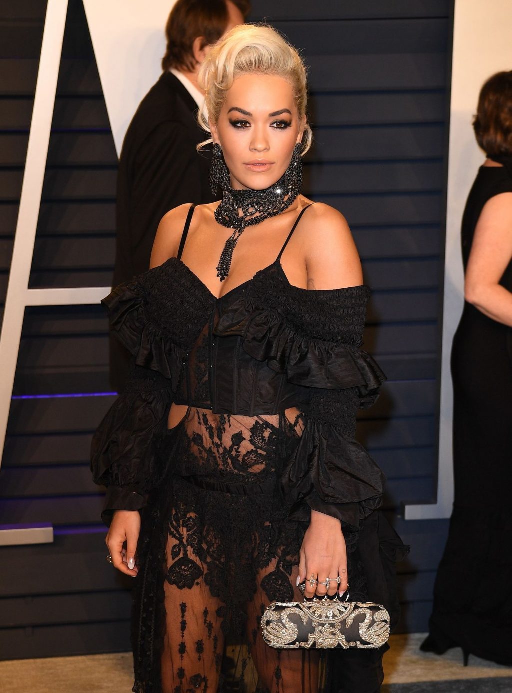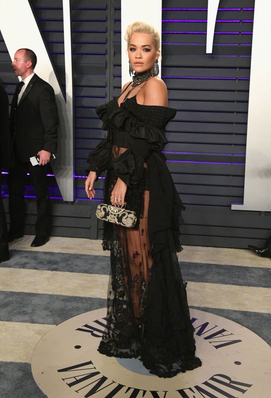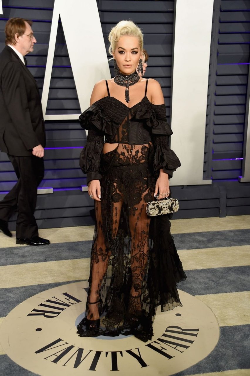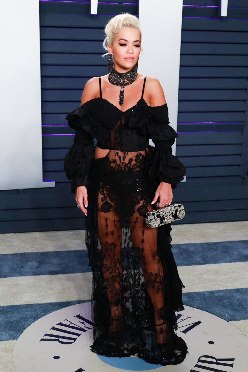 Superstar Rita Ora mostra seu decote e bumbum usando um vestido preto com lingerie de renda na festa Vanity Fair Oscar de 2019 em Beverly Hills, 24/02/2019.