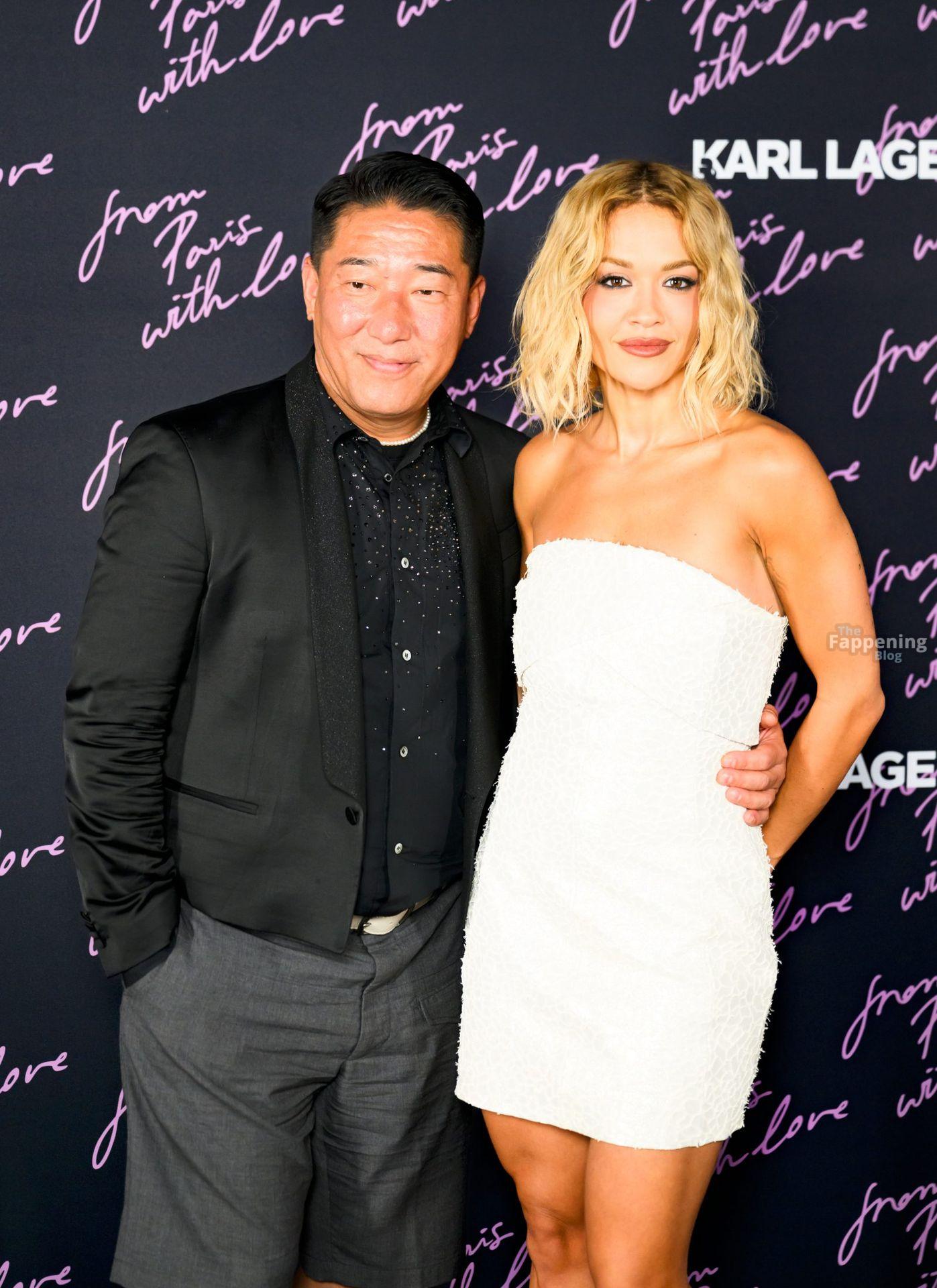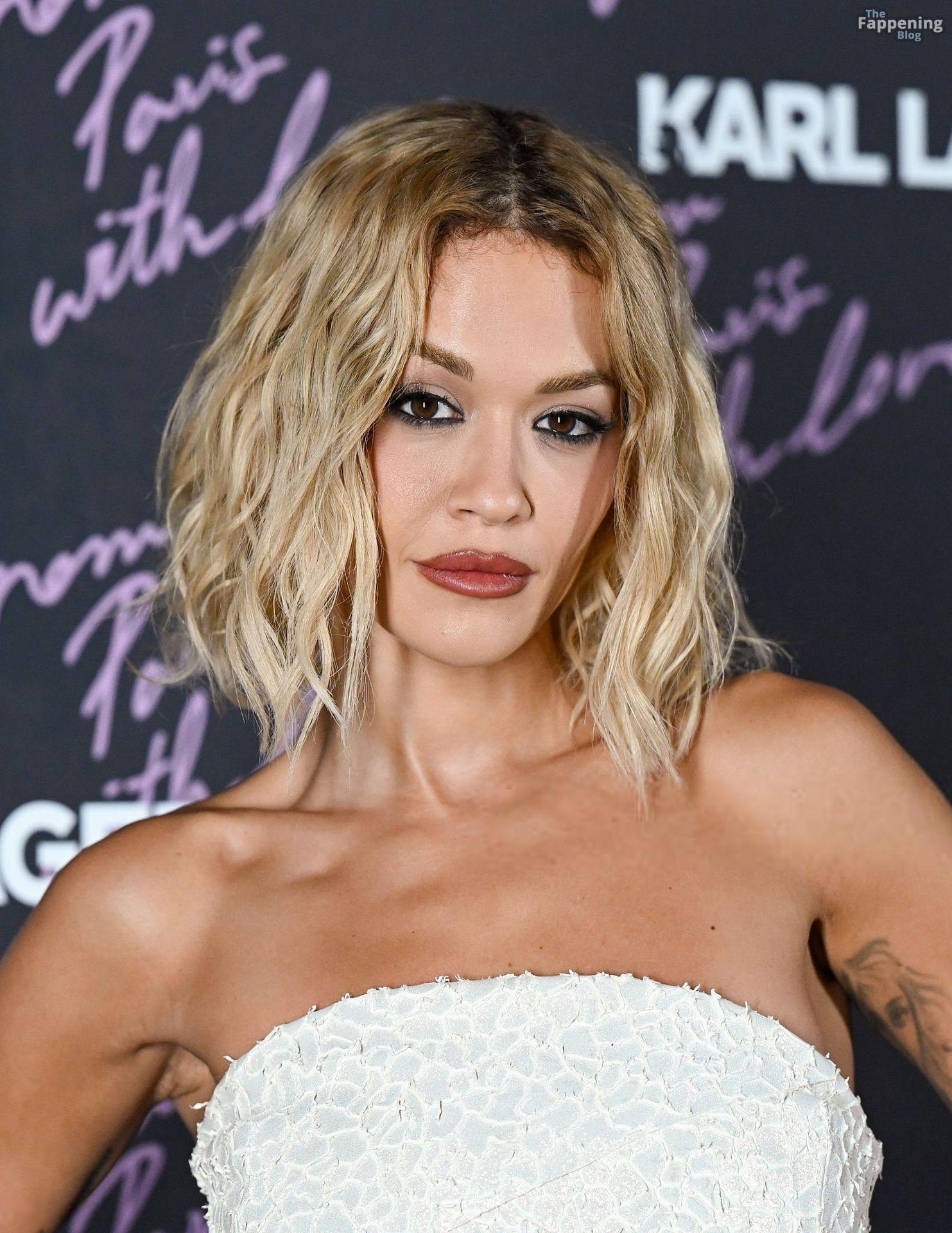 Rita Ora impressionou na festa de Karl Lagerfeld em Paris com um vestido curto branco sem alças. Ela exibiu suas pernas tonificadas e um pouco de pele.