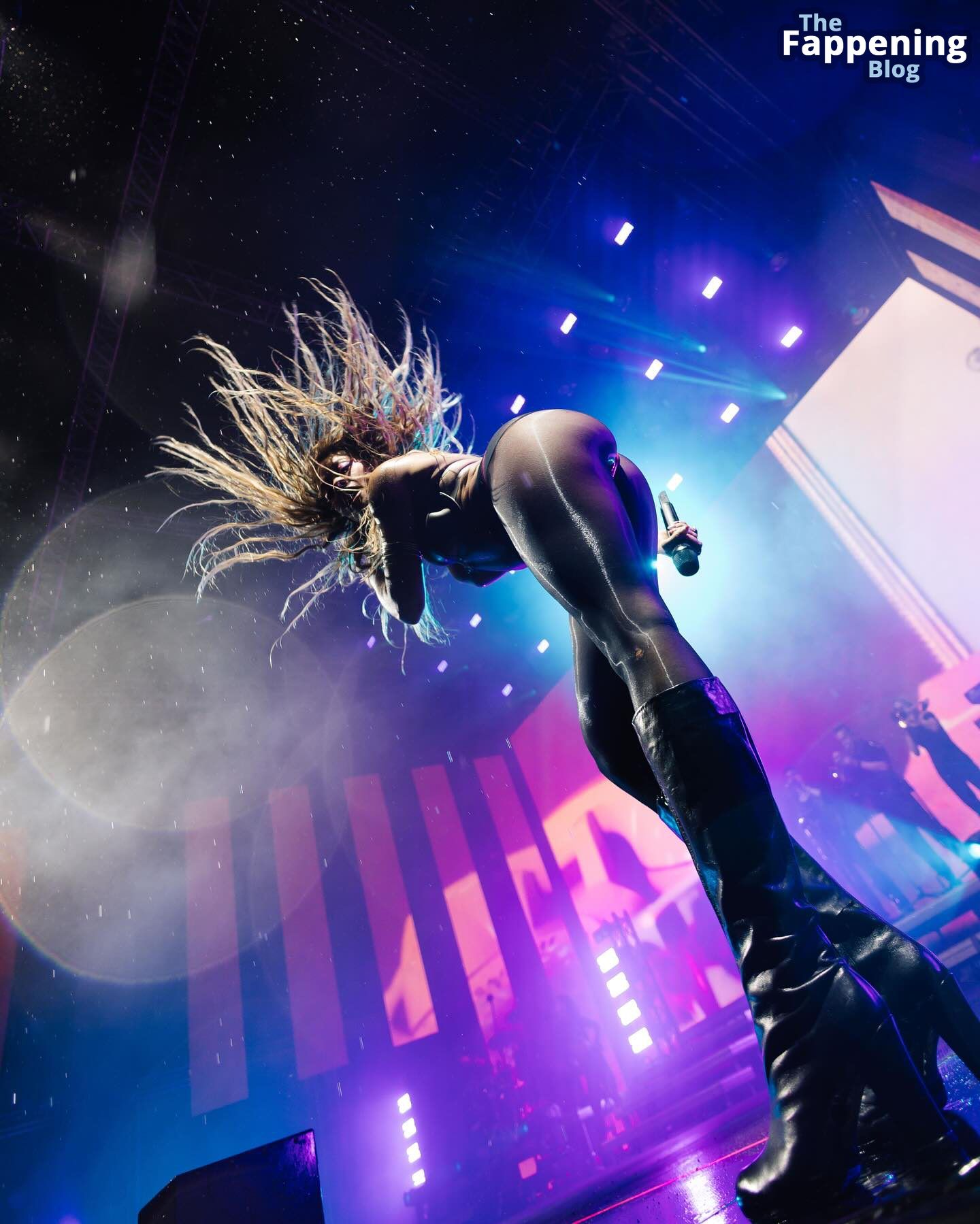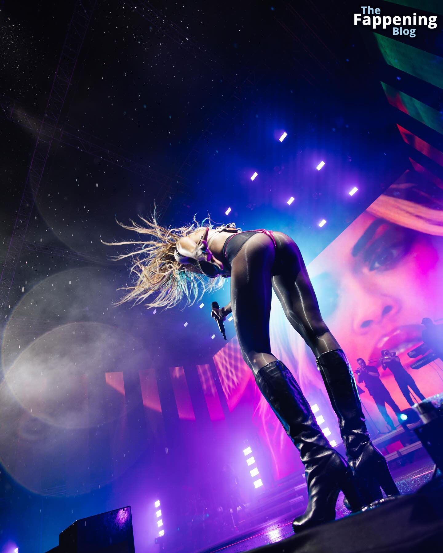 Cantora Rita Ora aparece em um ensaio de show, exibindo suas curvas de meia-calça e sutiã.