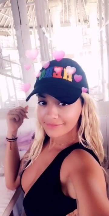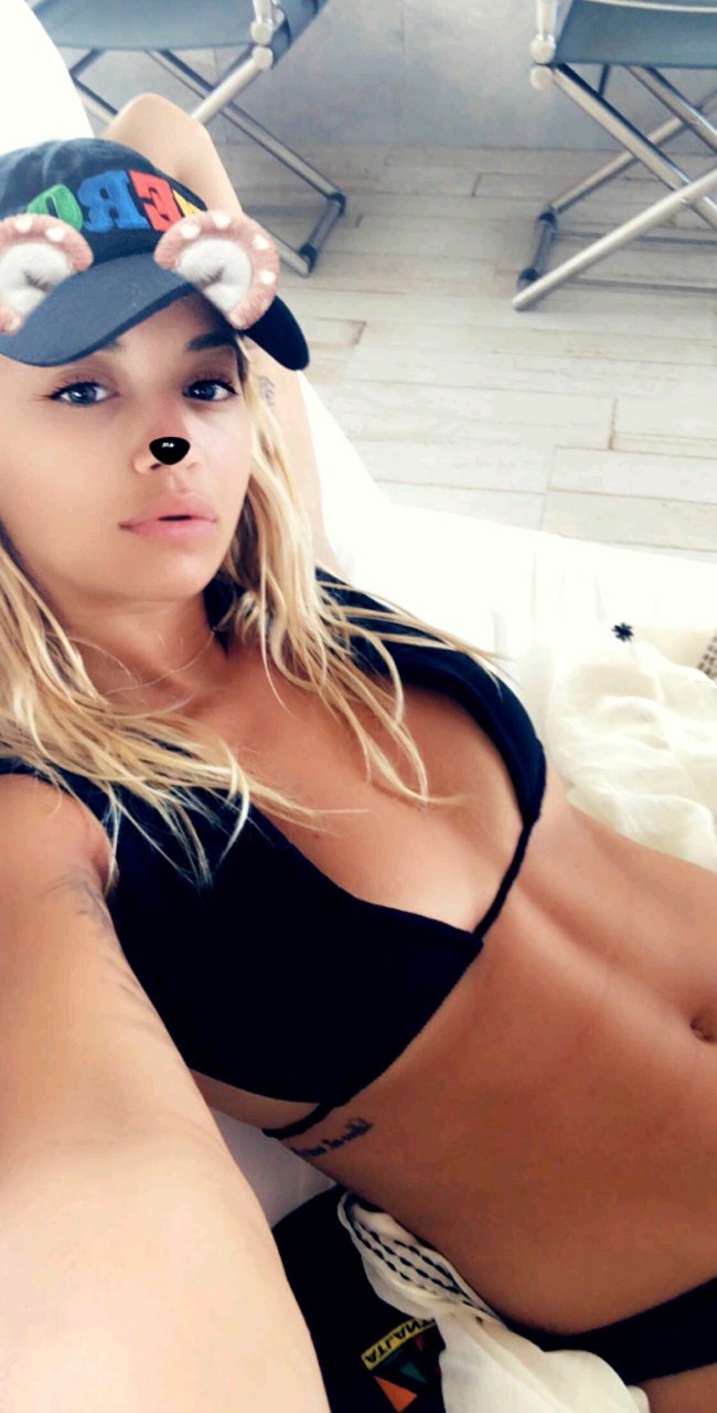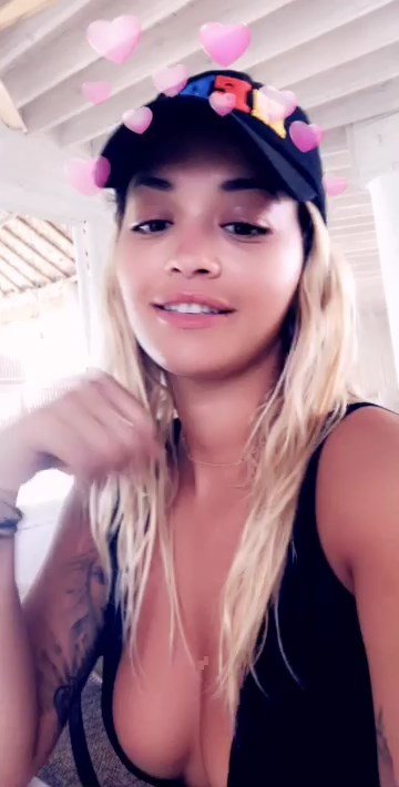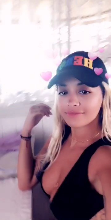 Cantora e atriz Rita Ora, 27, mostra seus seios em um biquíni preto – Instagram, Snapchat, 12/02/2018.