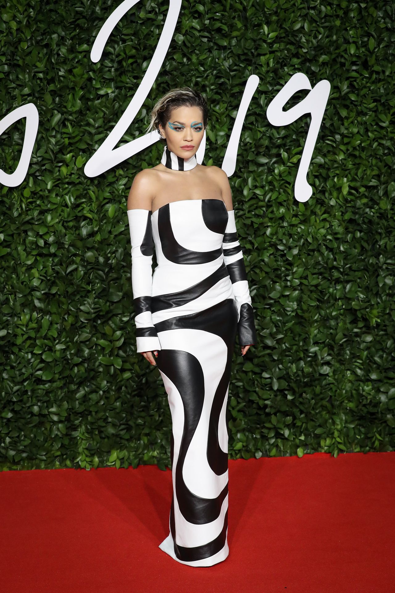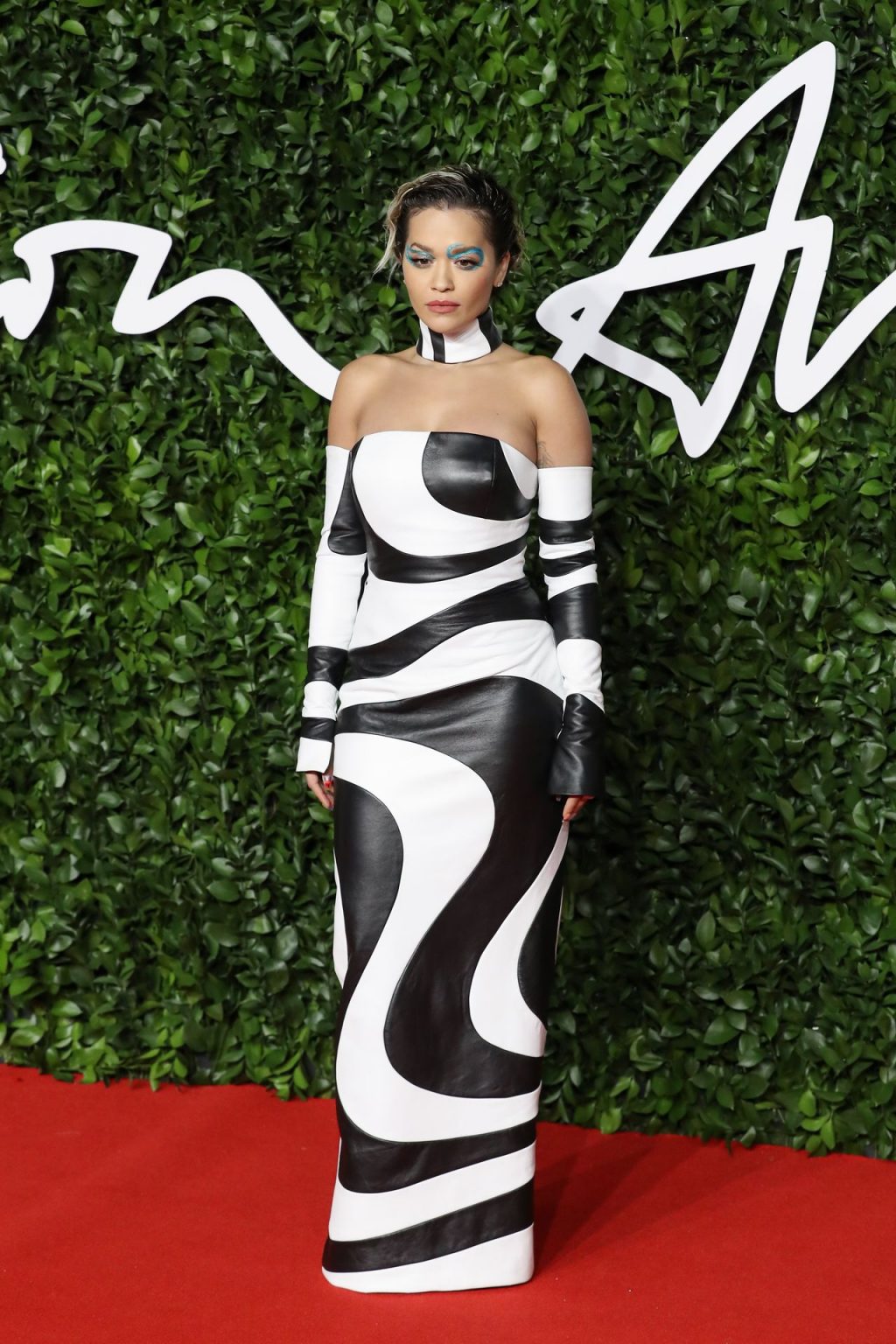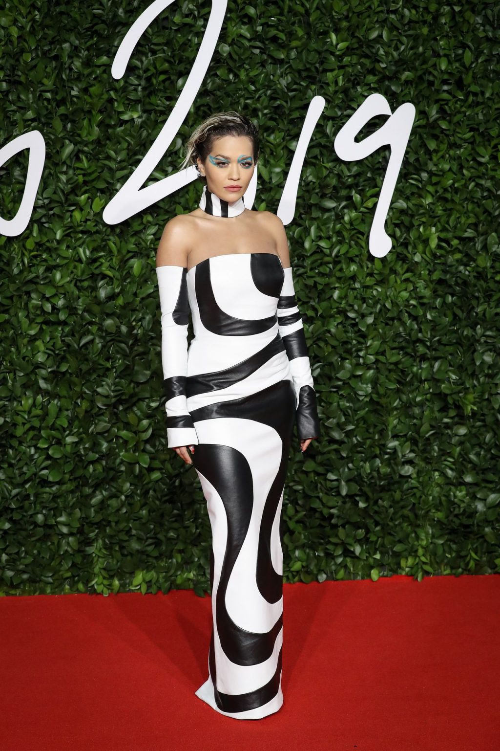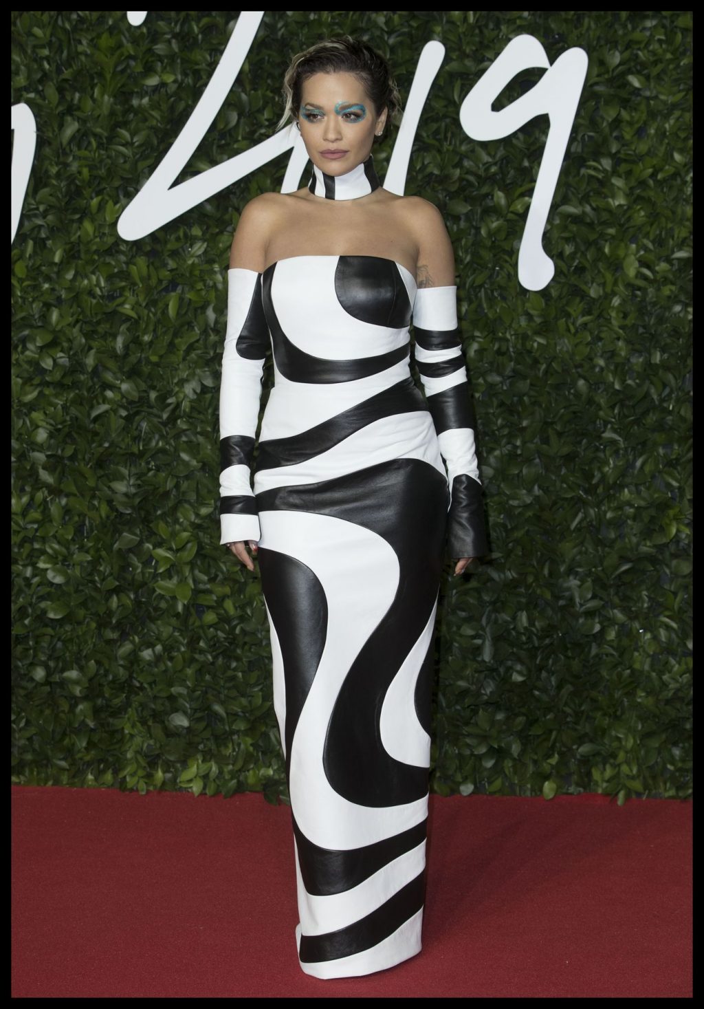 Rita Ora foi fotografada no tapete vermelho do The Fashion Awards 2019 no Royal Albert Hall, Londres, 02/12/2019. A cantora escolheu para o evento um vestido de couro louco com estampa de zebra que adicionou uma dúzia de quilos extras ao seu peso.