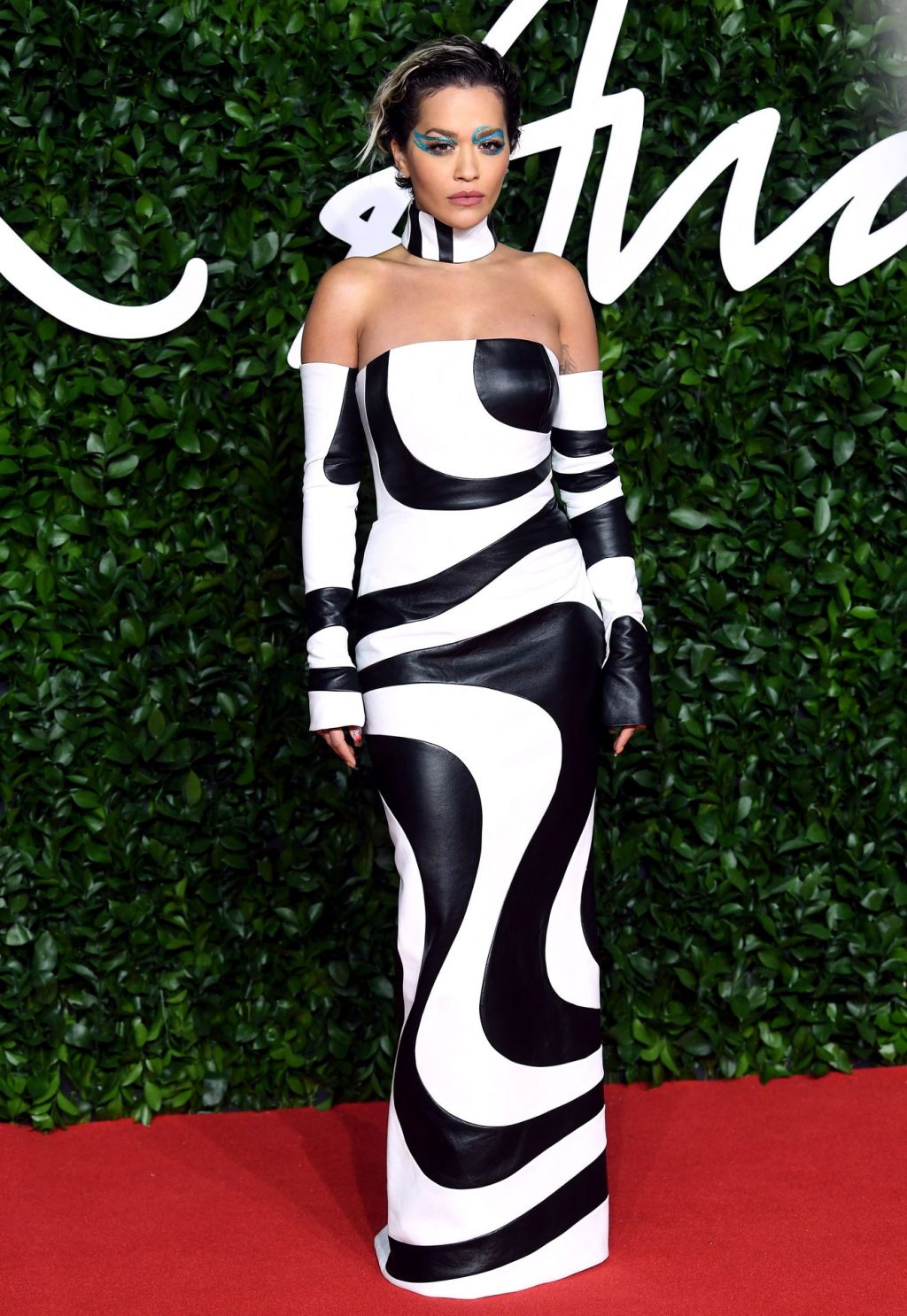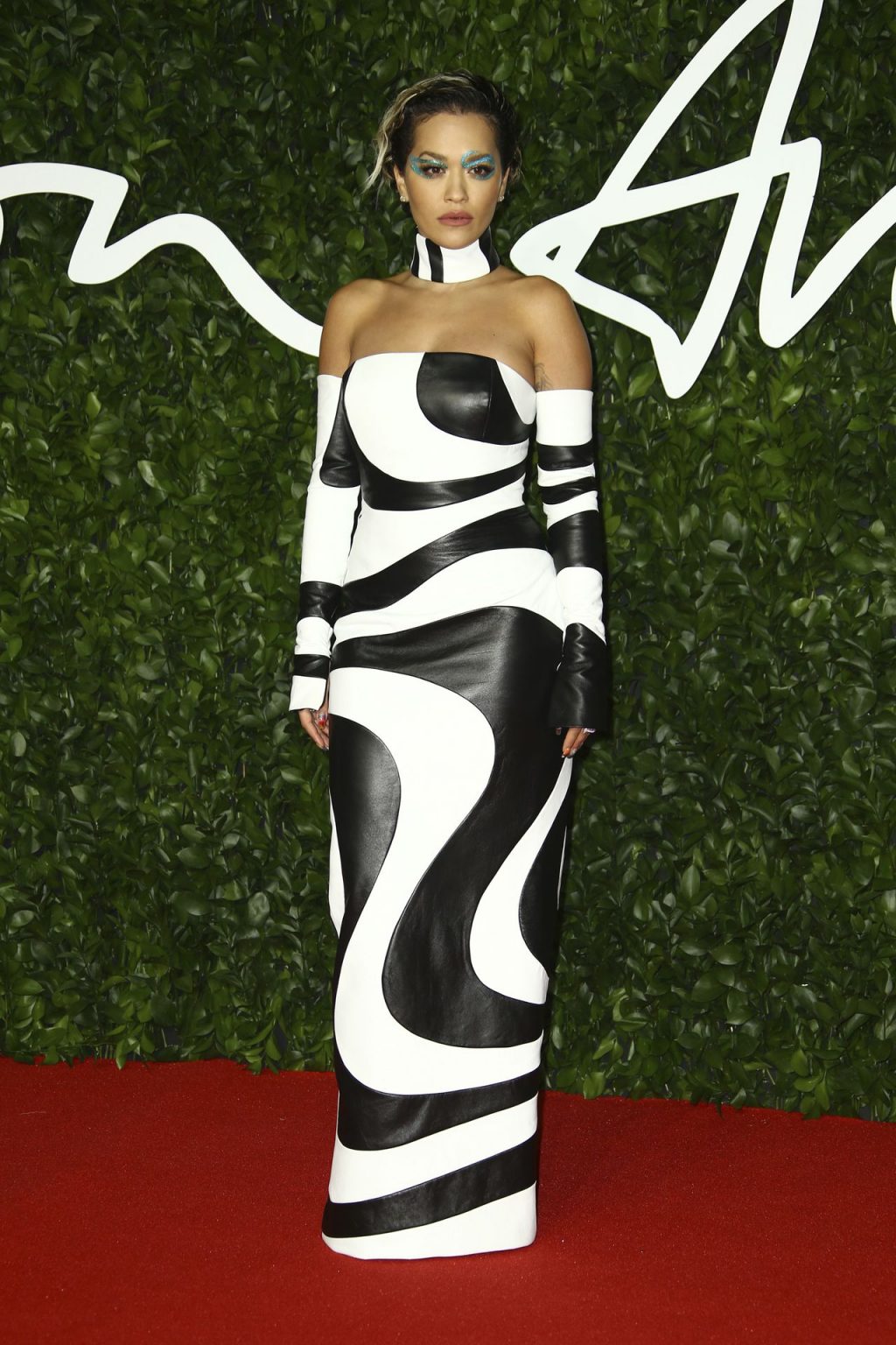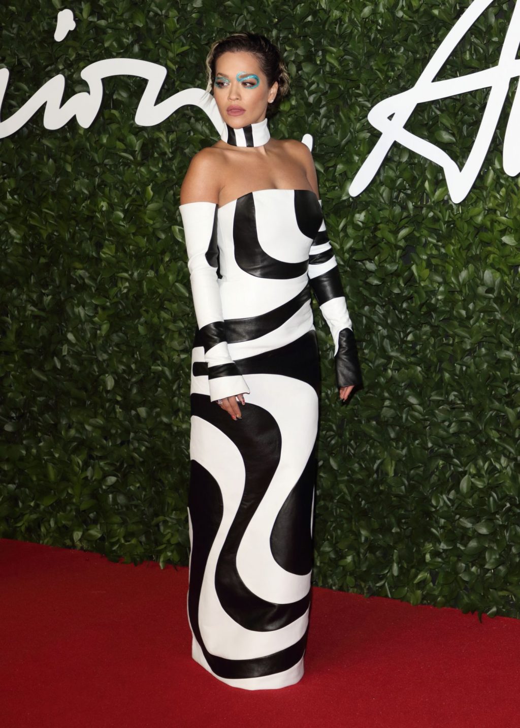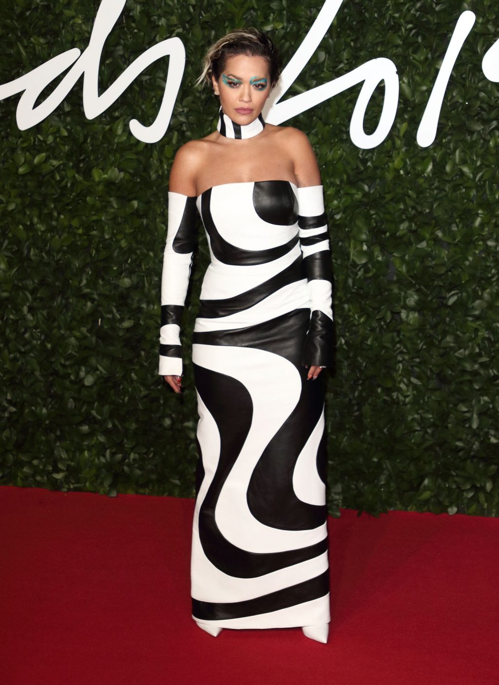 Rita Ora foi fotografada no tapete vermelho do The Fashion Awards 2019 no Royal Albert Hall, Londres, 02/12/2019. A cantora escolheu para o evento um vestido de couro louco com estampa de zebra que adicionou uma dúzia de quilos extras ao seu peso.