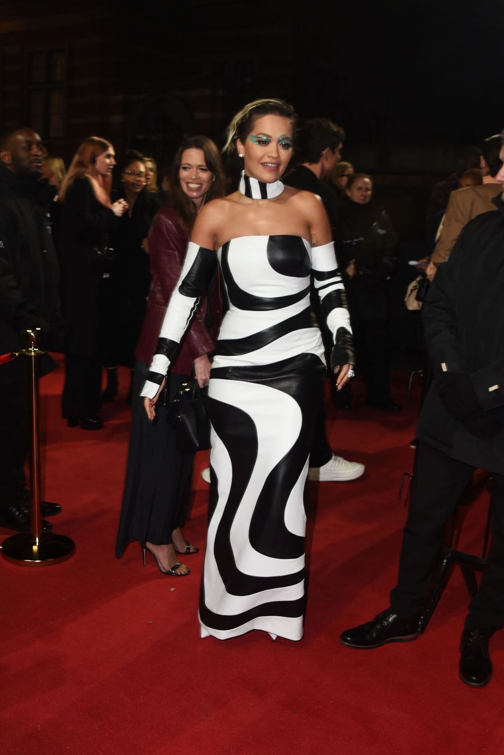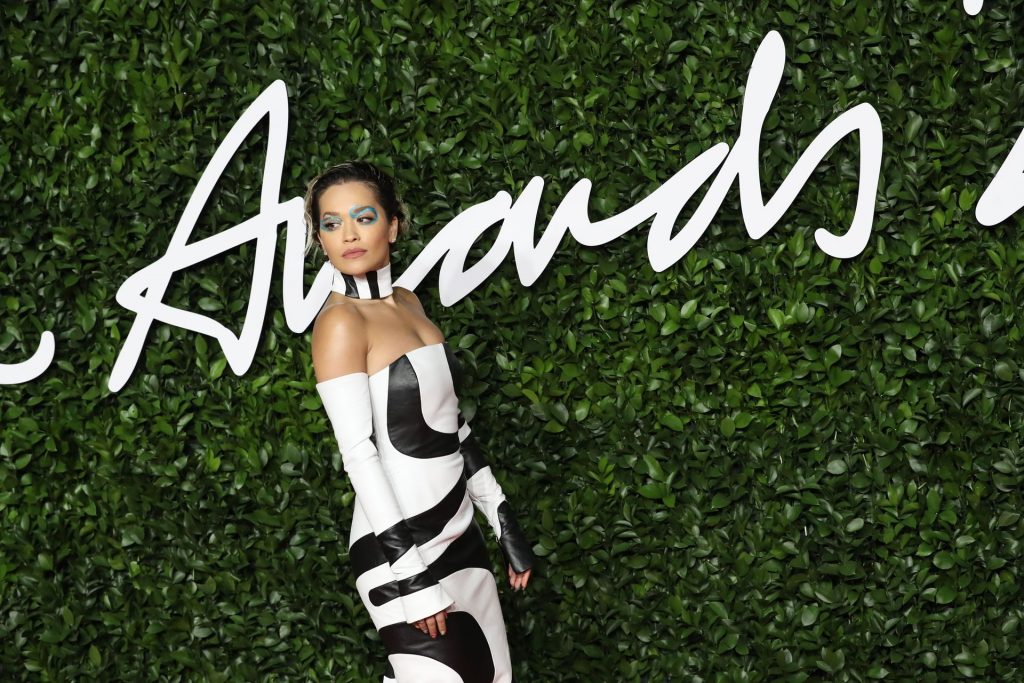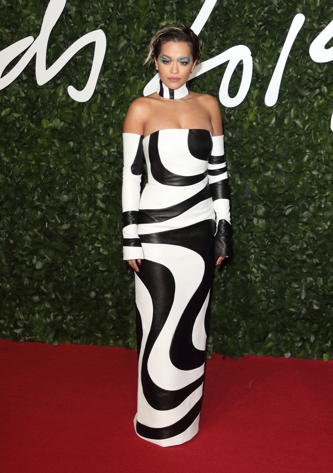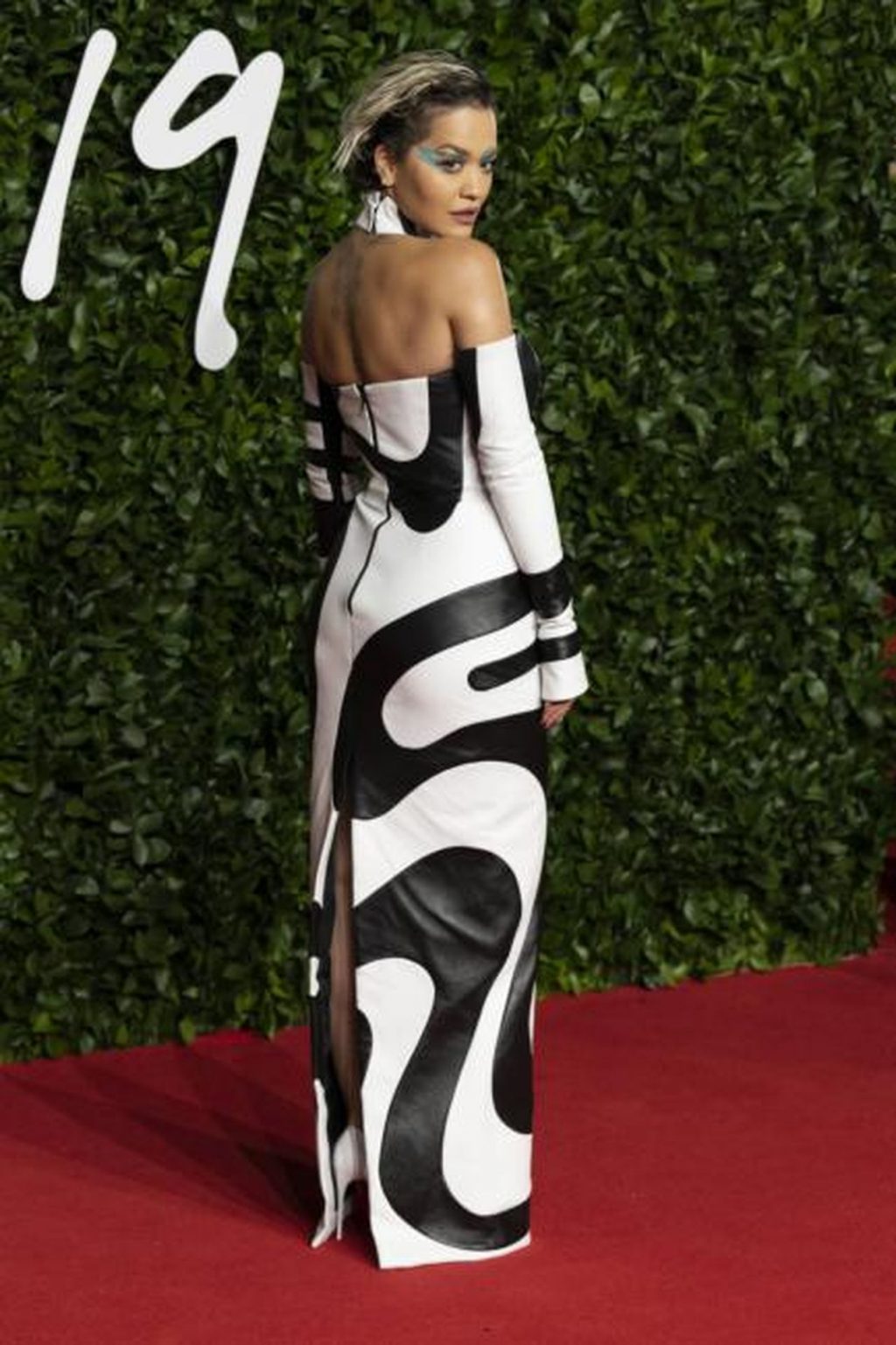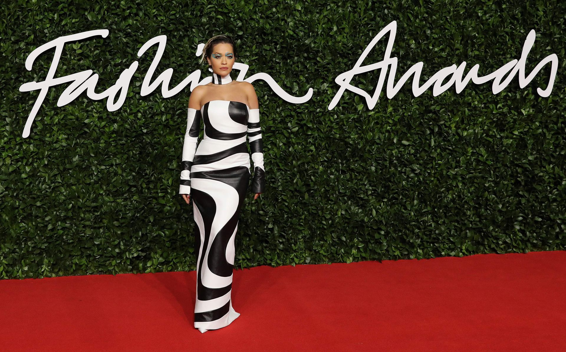 Rita Ora foi fotografada no tapete vermelho do The Fashion Awards 2019 no Royal Albert Hall, Londres, 02/12/2019. A cantora escolheu para o evento um vestido de couro louco com estampa de zebra que adicionou uma dúzia de quilos extras ao seu peso.