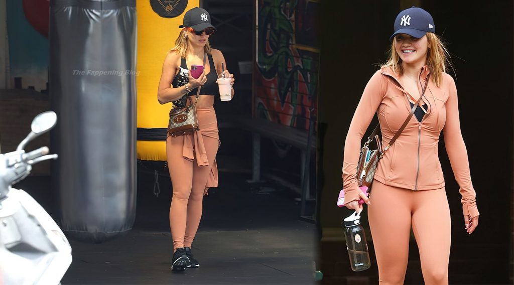 A cantora Rita Ora exibe sua barriga tonificada com top esportivo e roupa de treino nude justa enquanto vai para a academia em Sydney.