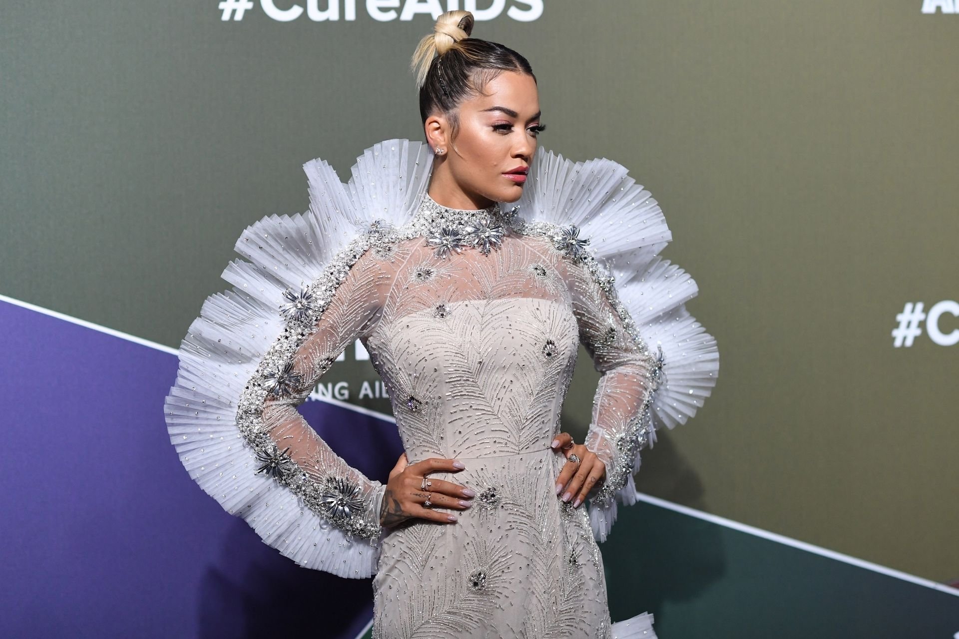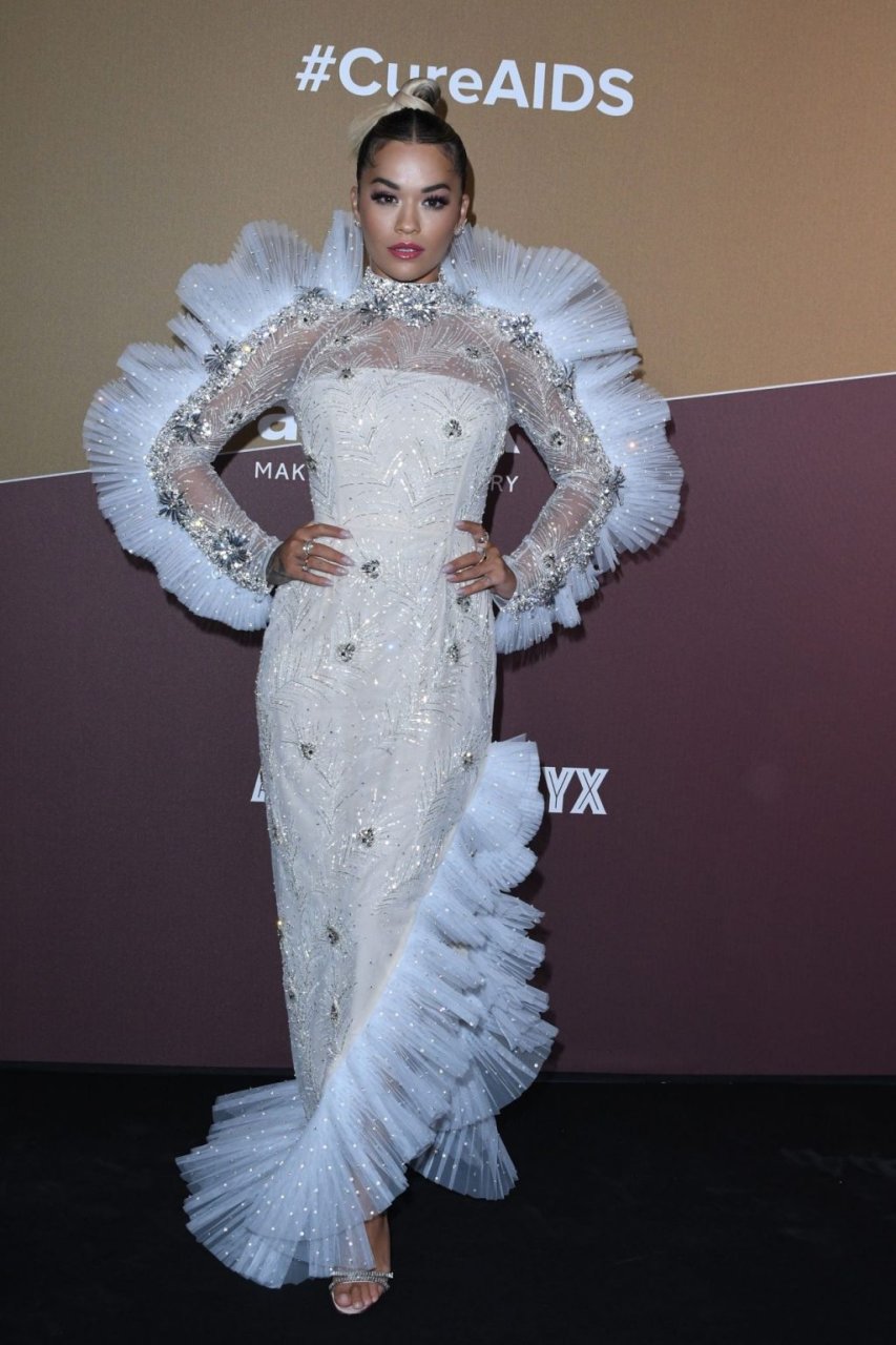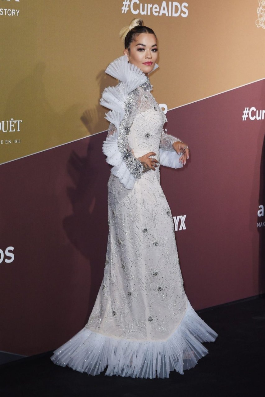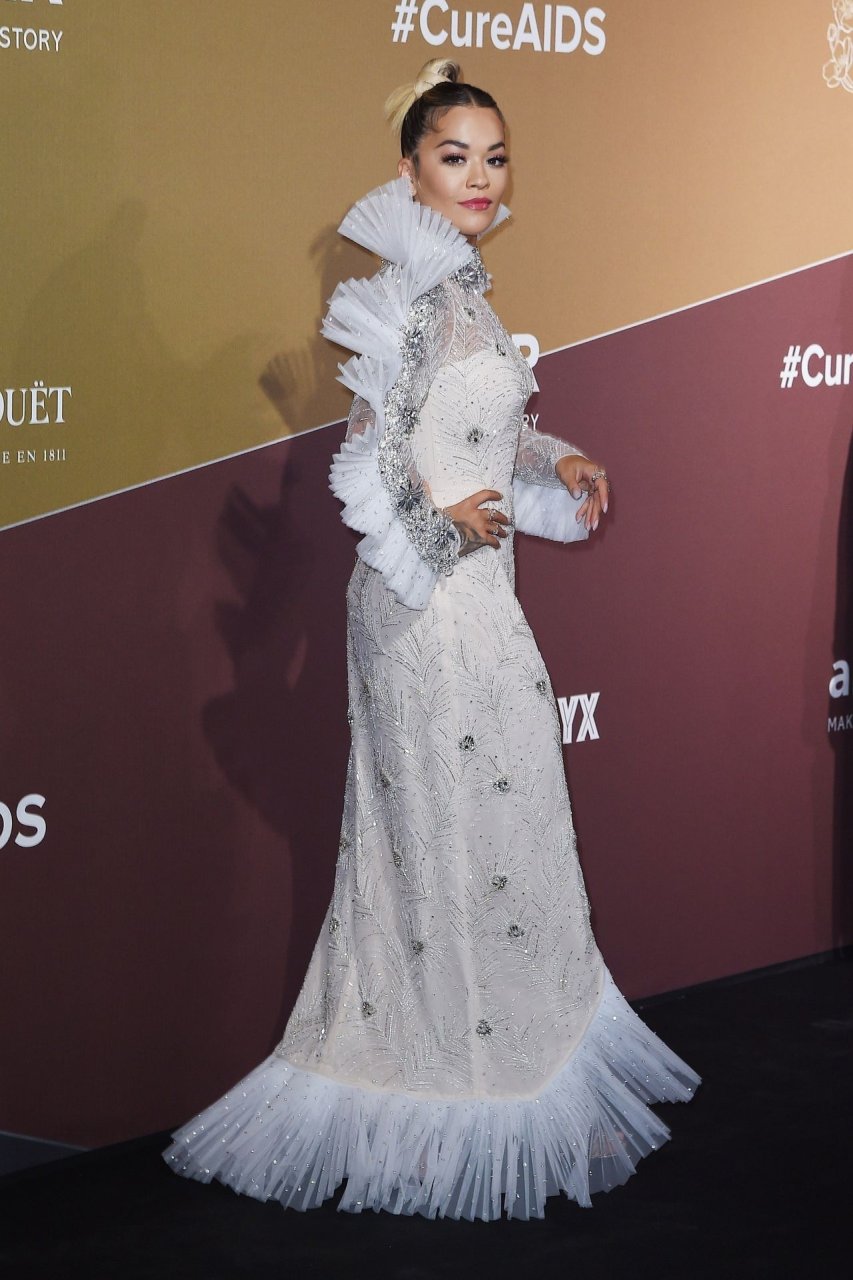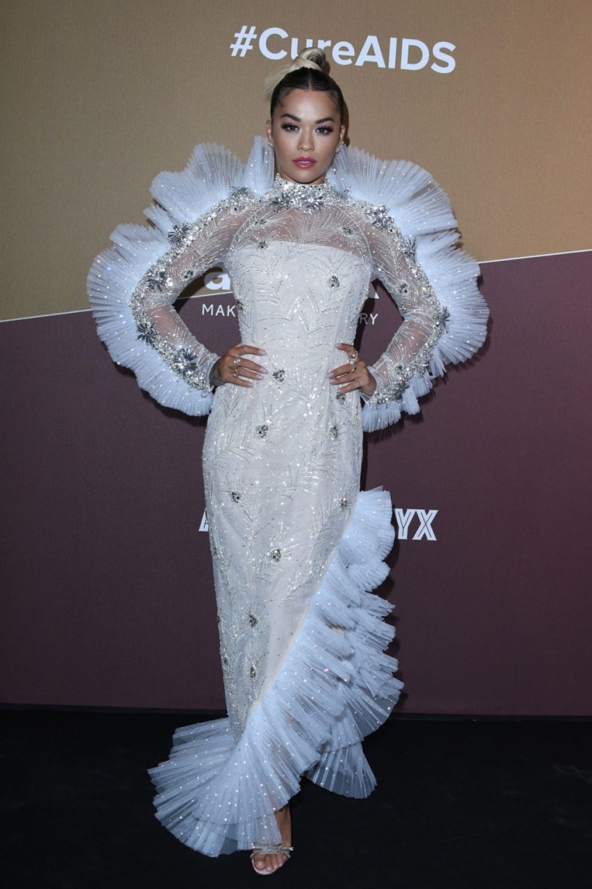 A cantora Rita Ora impressiona com um lindo vestido branco no amfAR Gala Milano 2019 no Palazzo Mezzanotte em Milão, Itália, 22/09/2019.