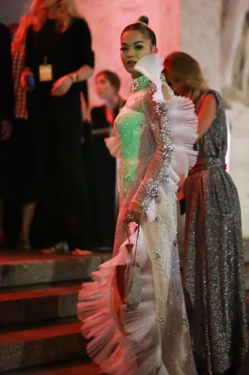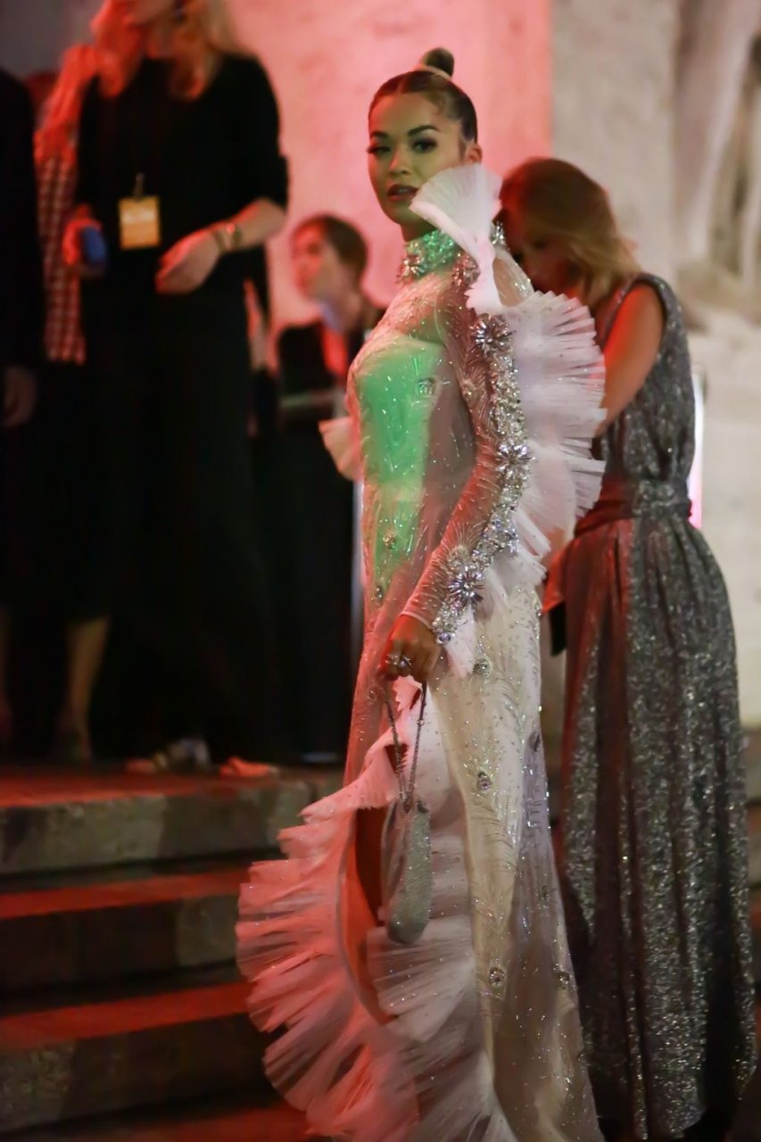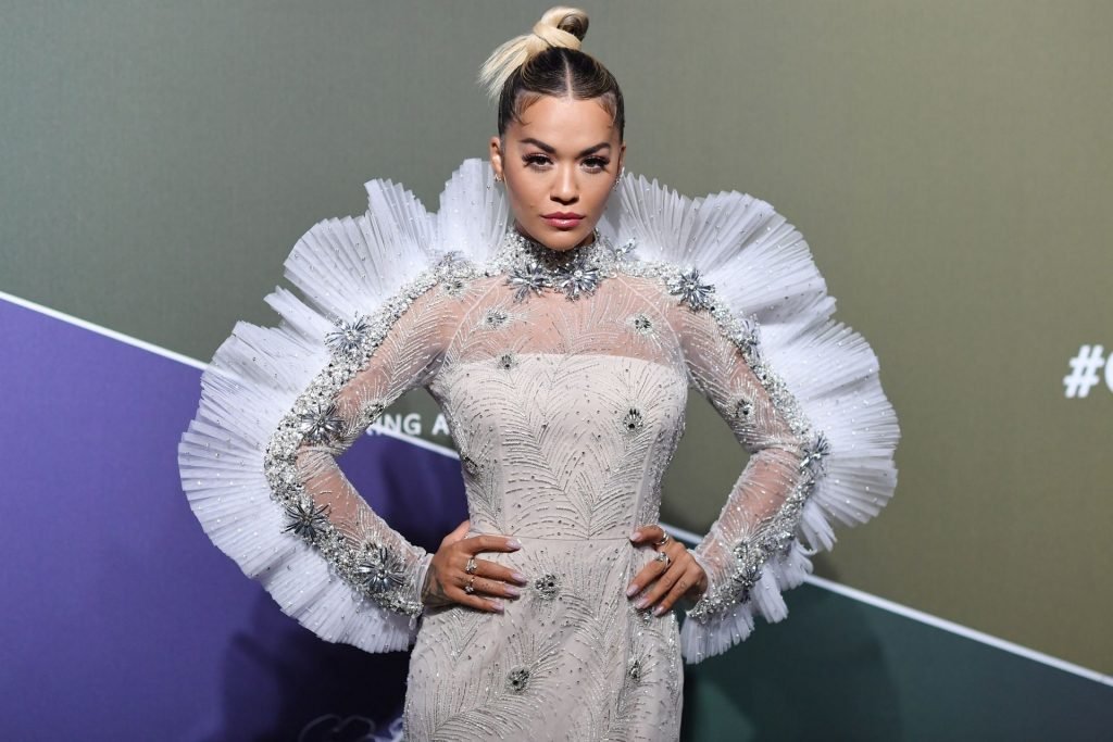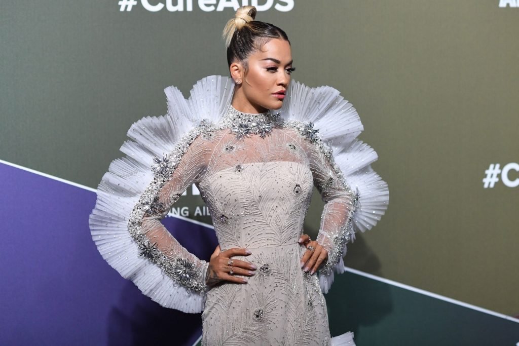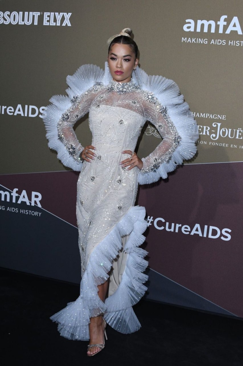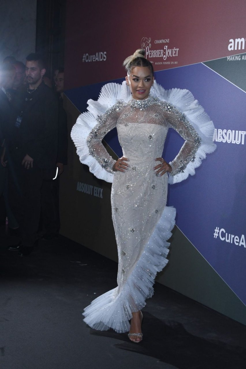 A cantora Rita Ora impressiona com um lindo vestido branco no amfAR Gala Milano 2019 no Palazzo Mezzanotte em Milão, Itália, 22/09/2019.