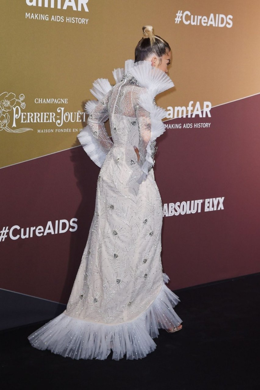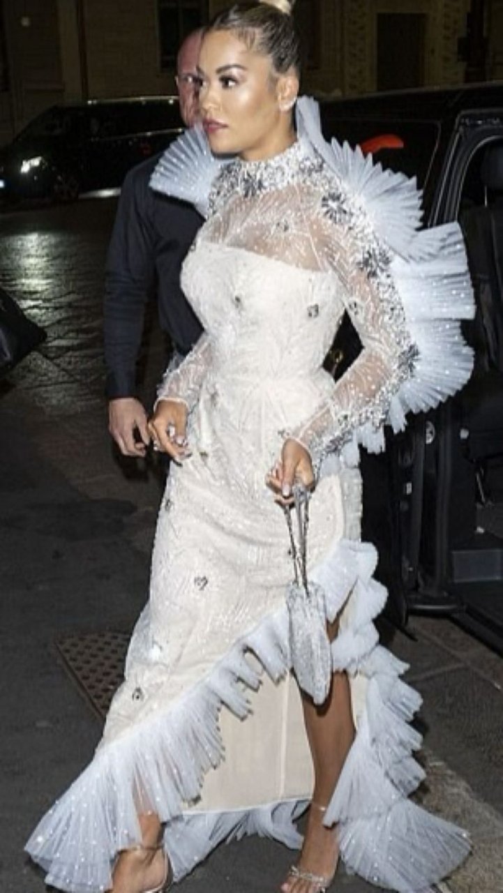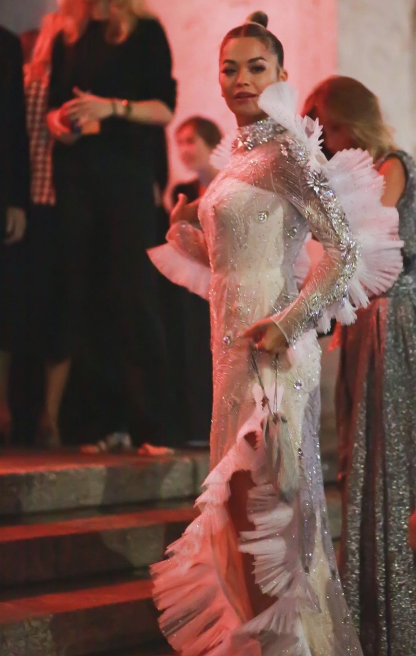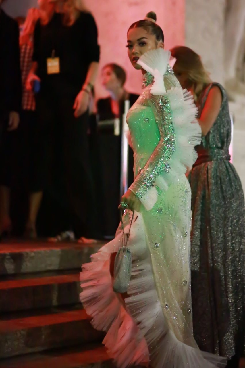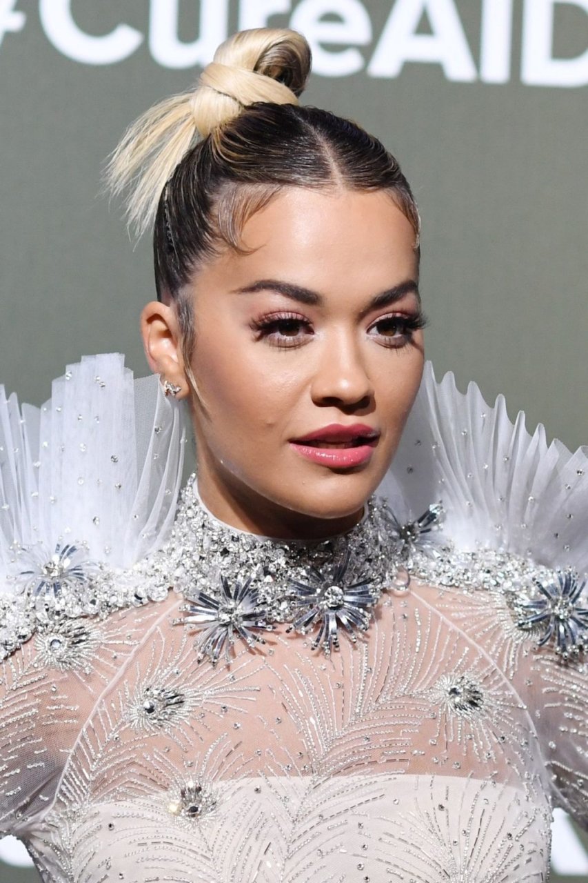 A cantora Rita Ora impressiona com um lindo vestido branco no amfAR Gala Milano 2019 no Palazzo Mezzanotte em Milão, Itália, 22/09/2019.