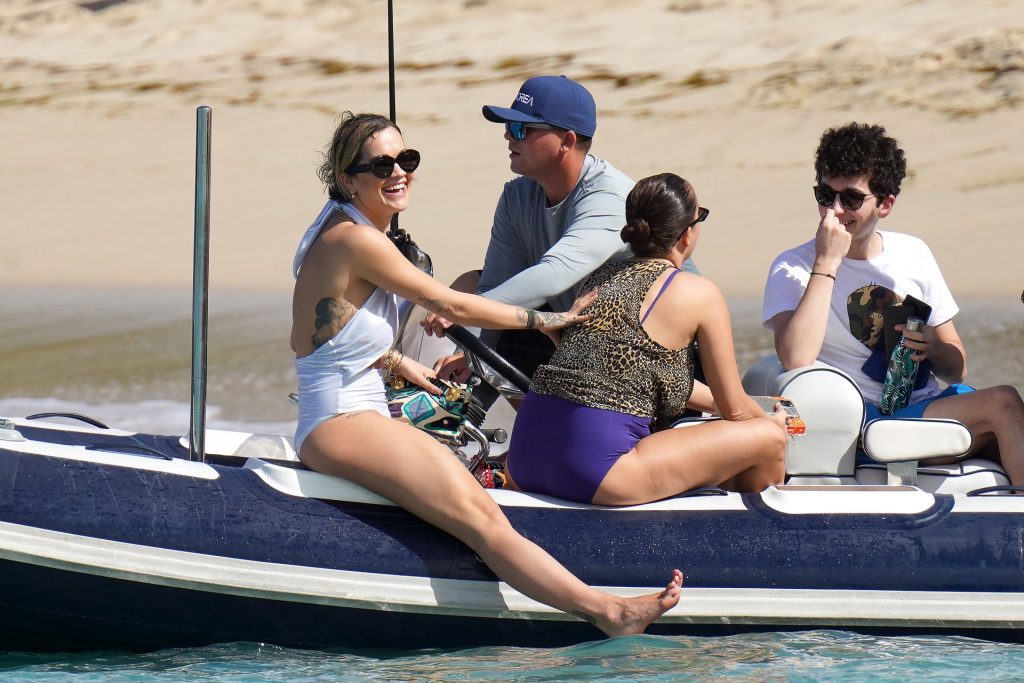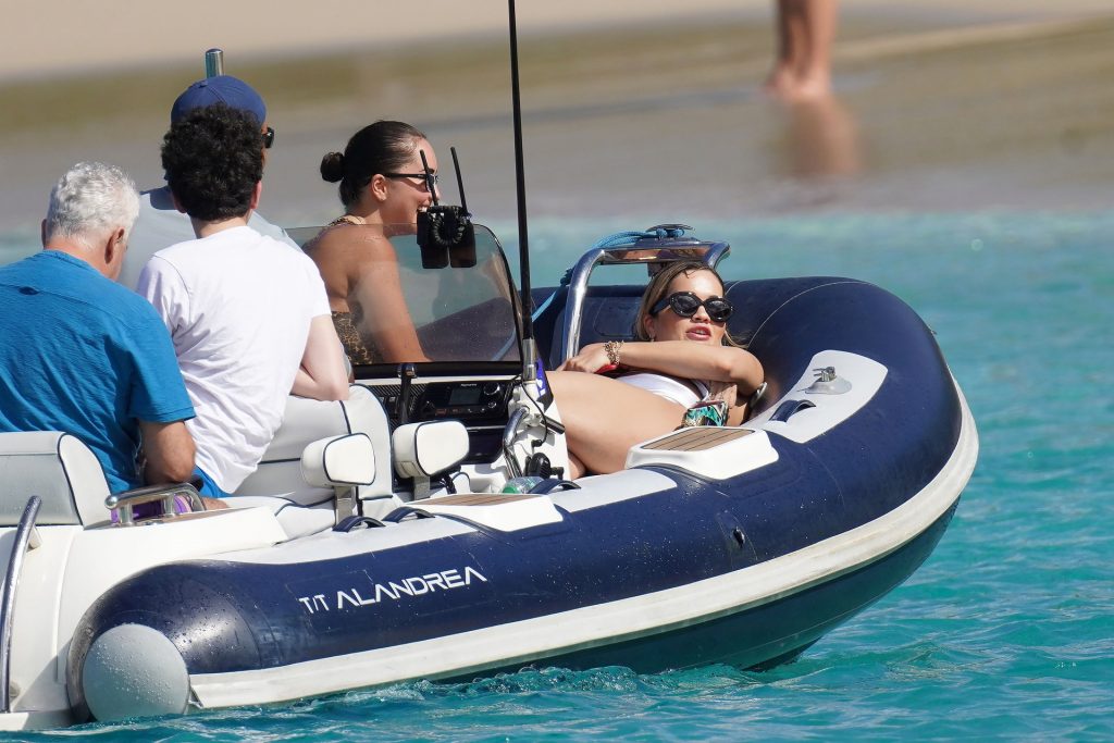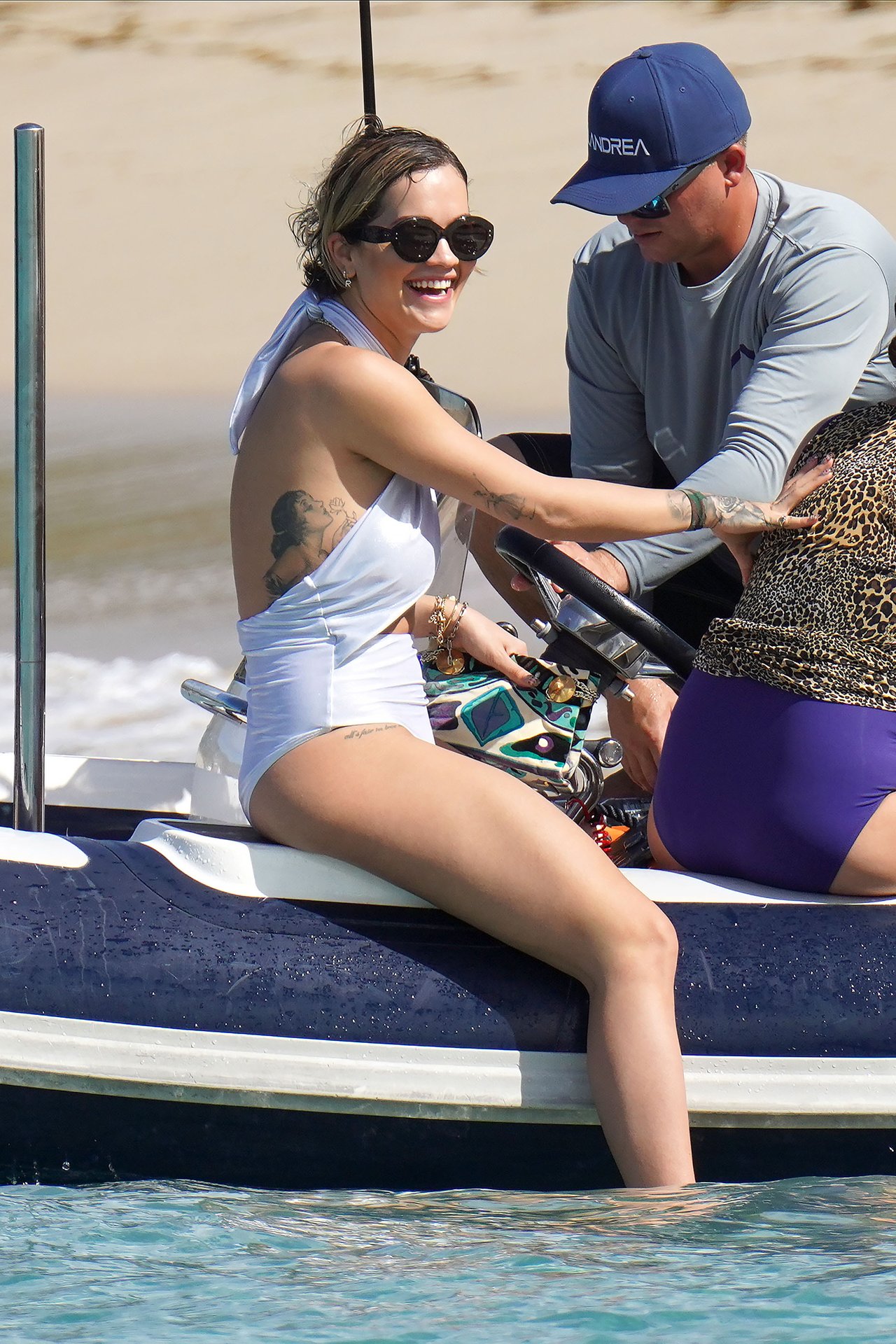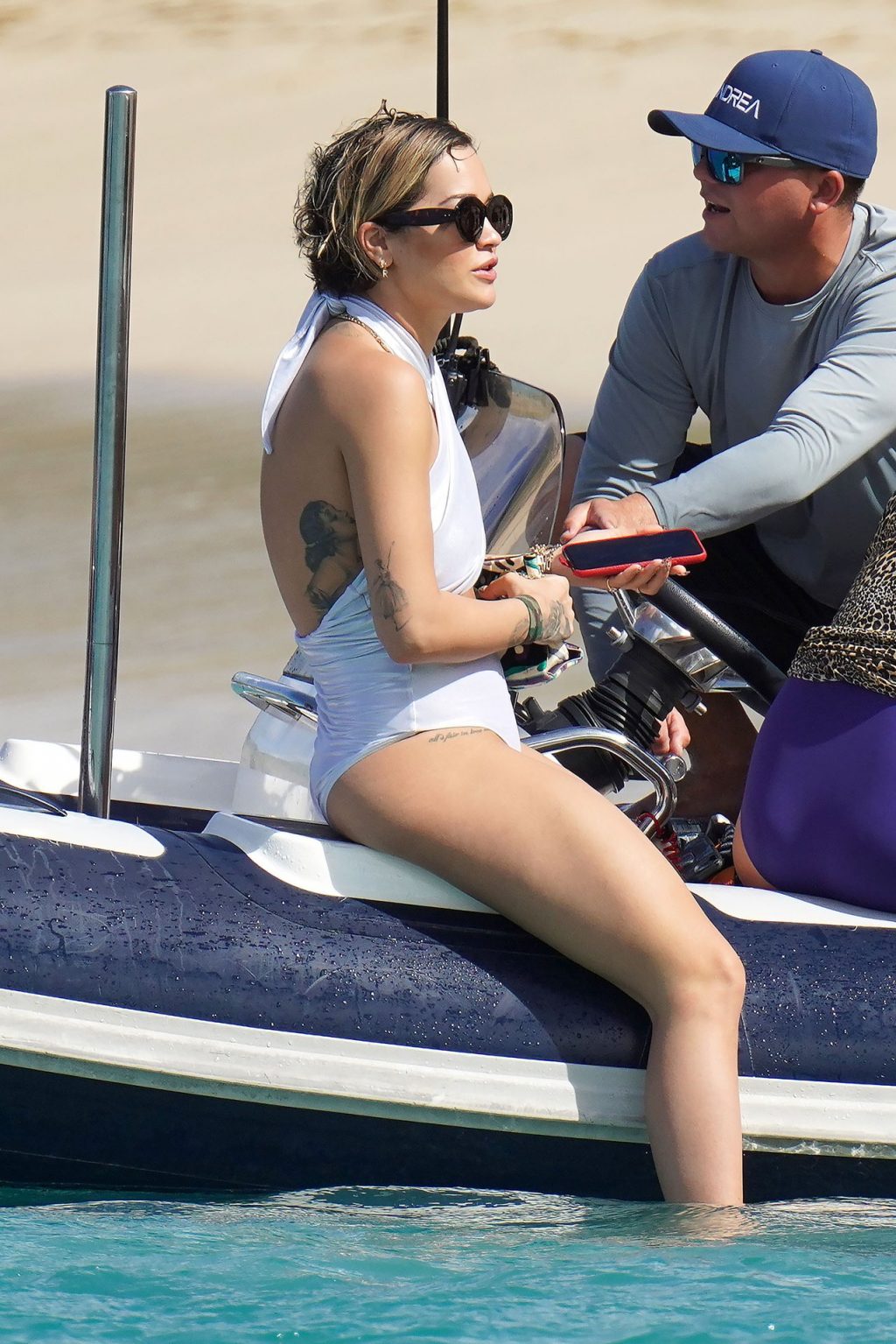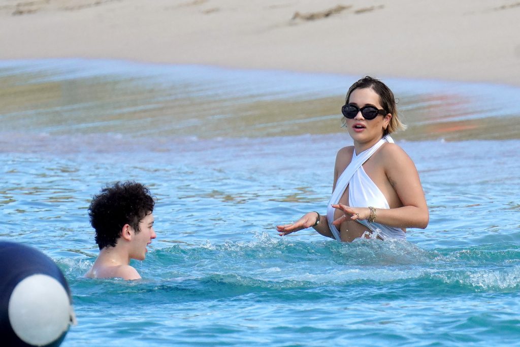 Singer Rita Ora foi vista usando um maiô branco estilo envelope, passando a temporada de férias com sua família em St. Barth, 21/12/2019.