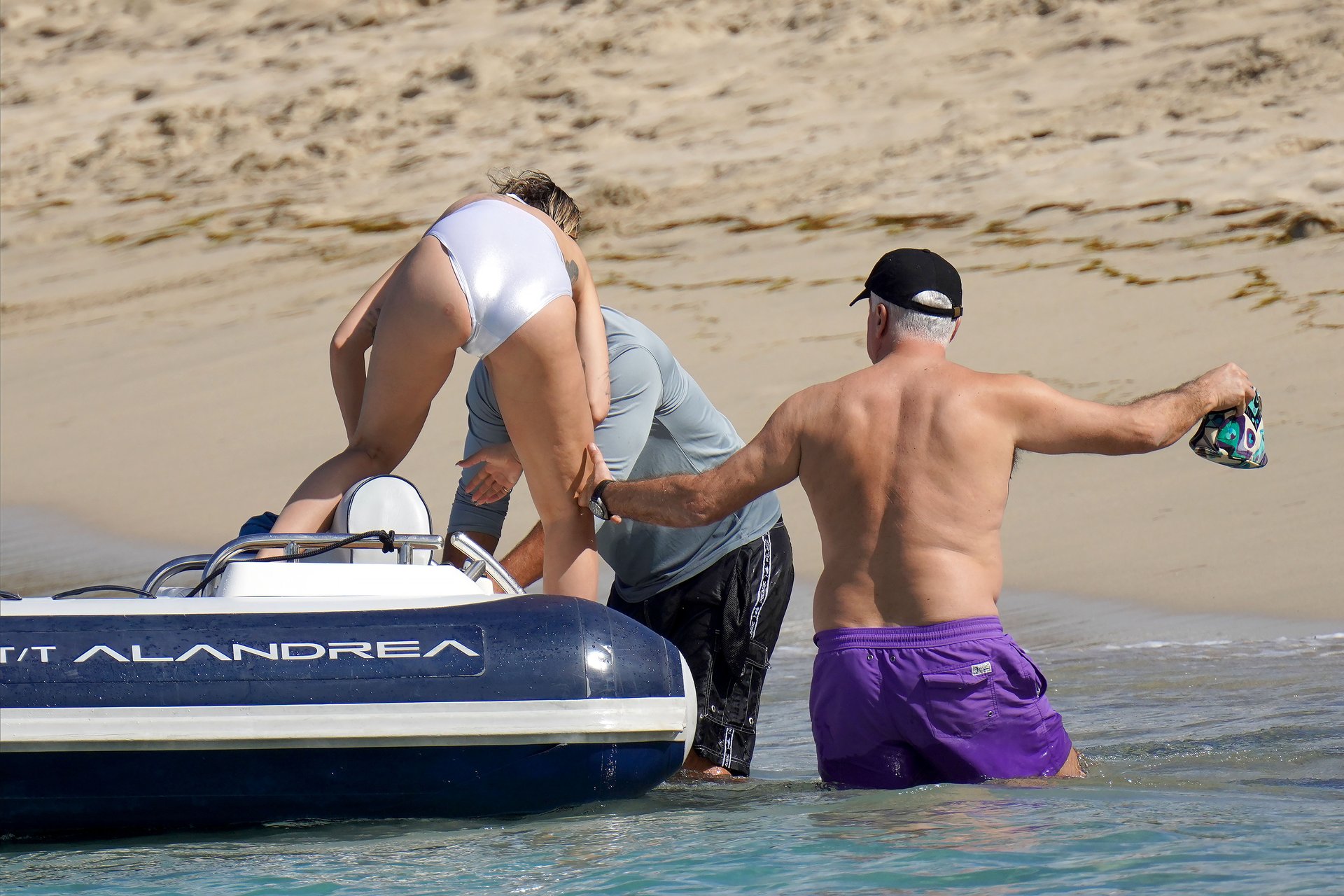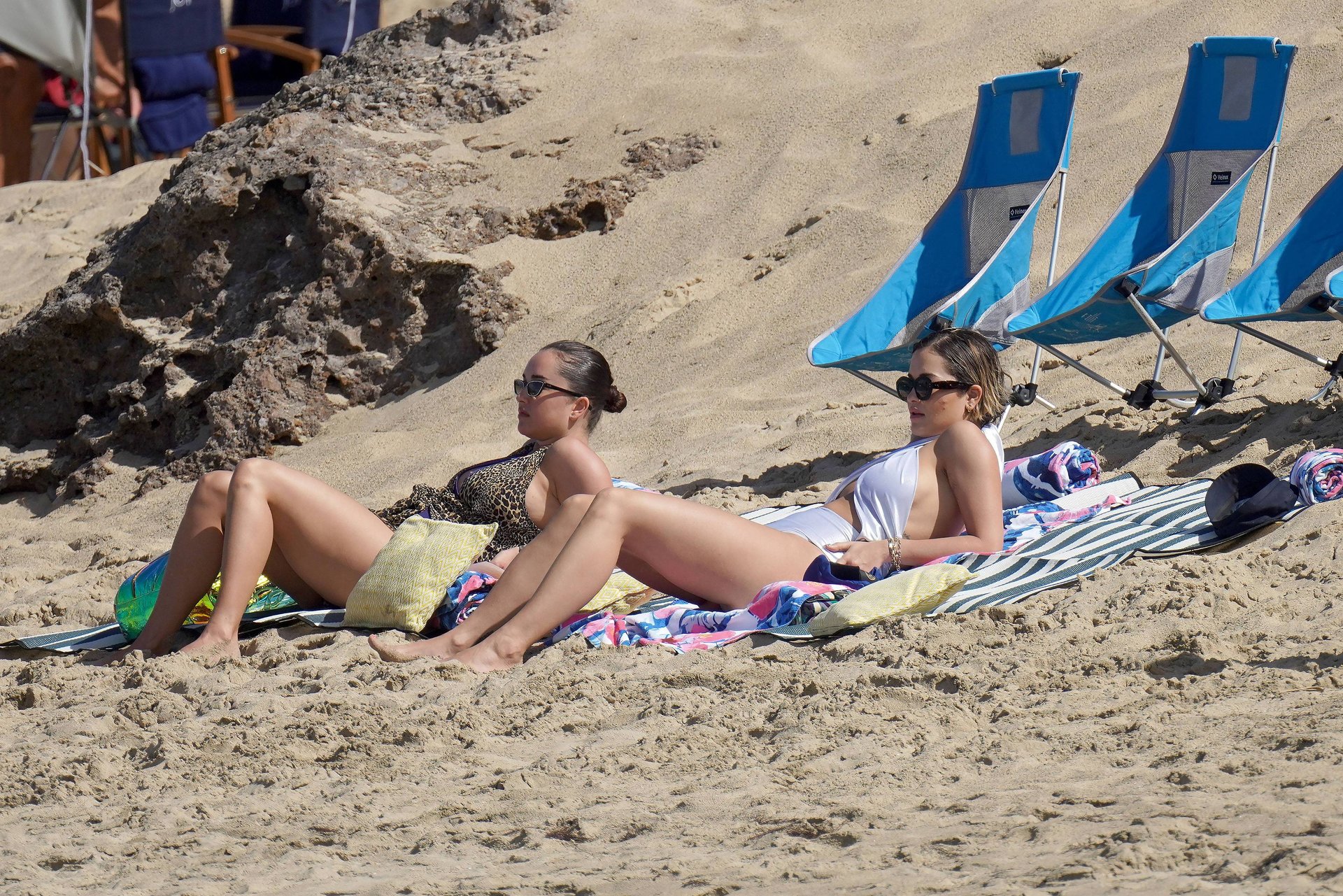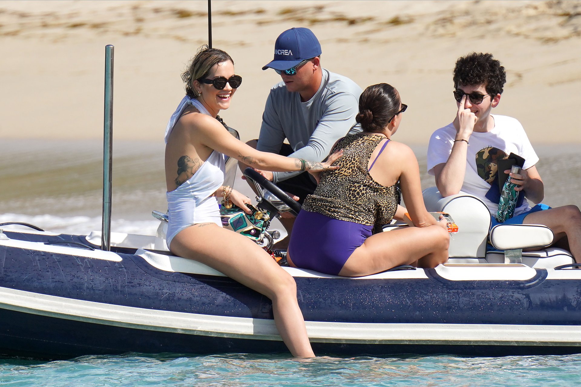 Singer Rita Ora foi vista usando um maiô branco estilo envelope, passando a temporada de férias com sua família em St. Barth, 21/12/2019.