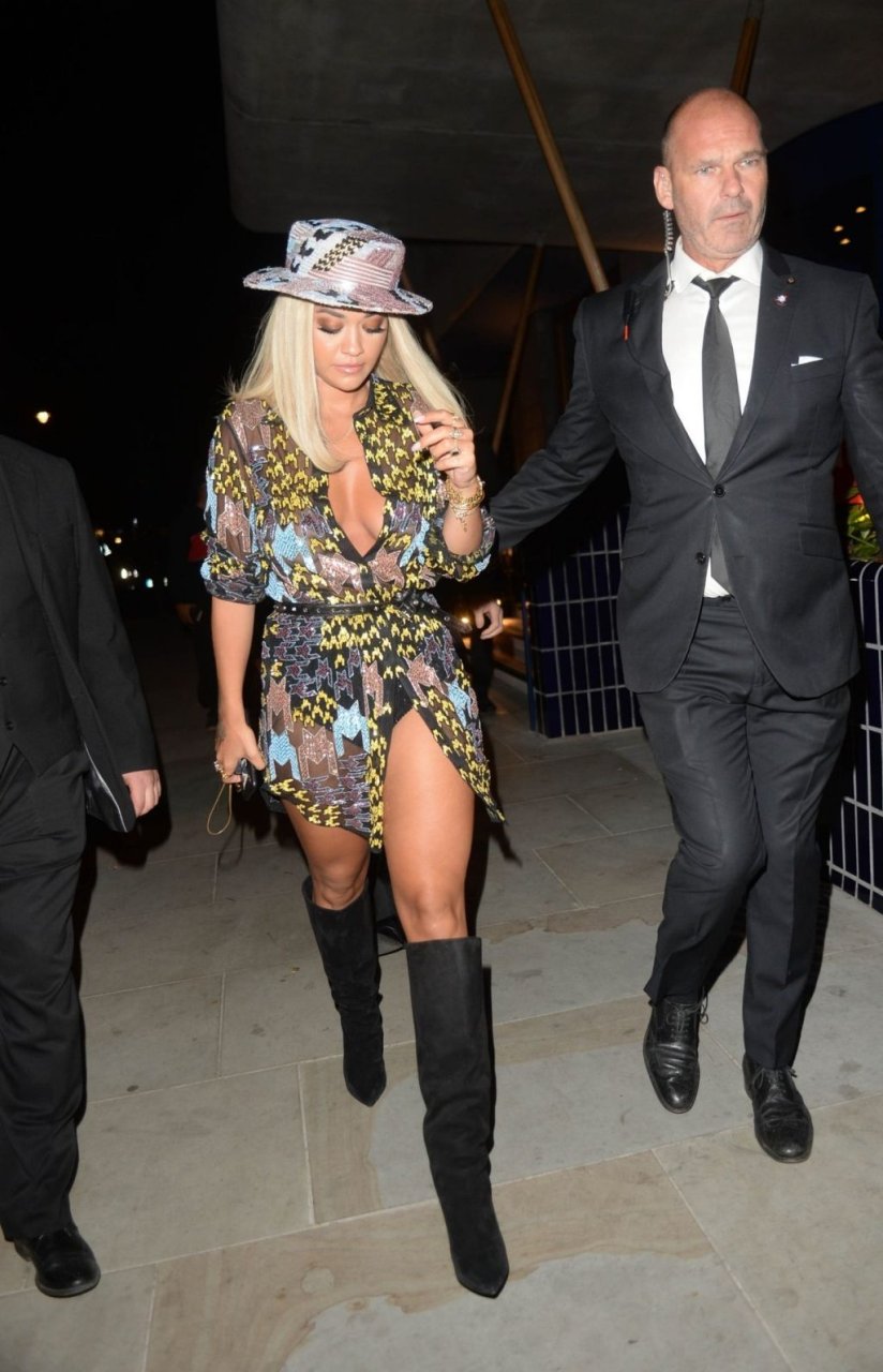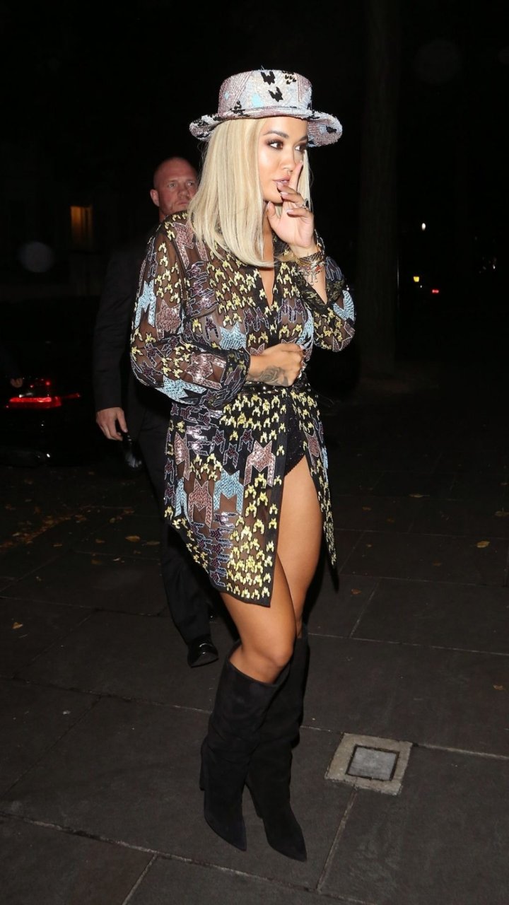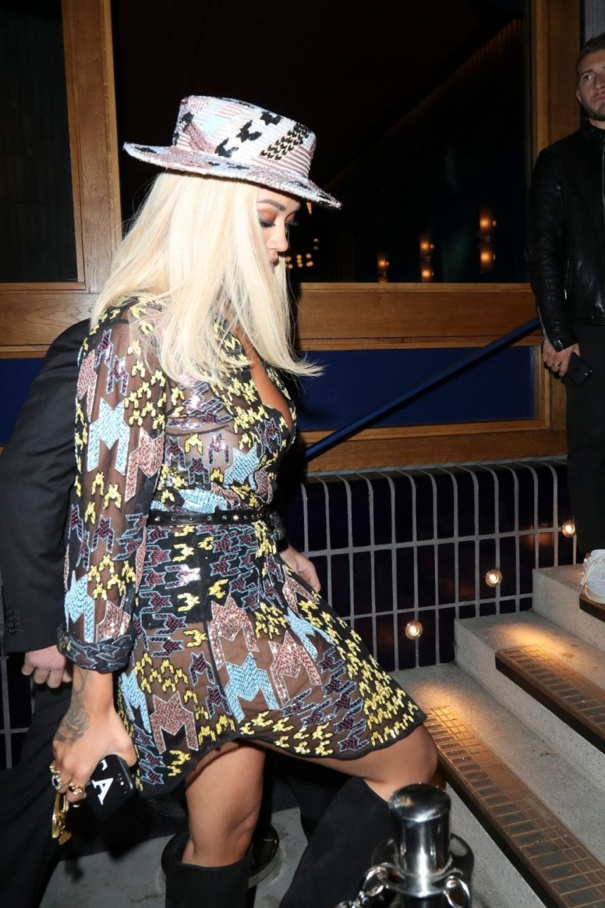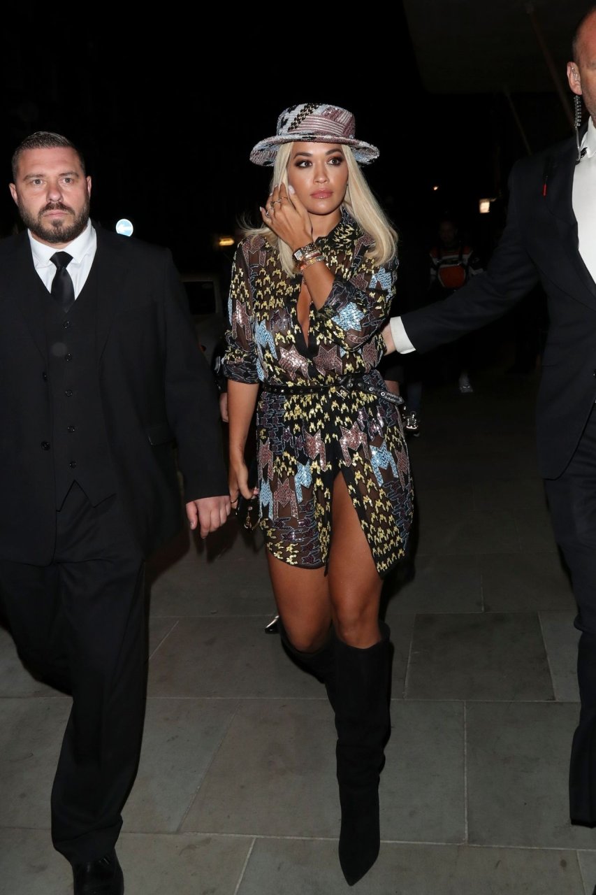 Rita Ora deixa a festa LFW Love Magazine e Youtube no The Standard em Londres, 16/09/2019. Rita estava usando um vestido mini colorido com um chapéu de aba larga e botas pretas de camurça até o joelho.