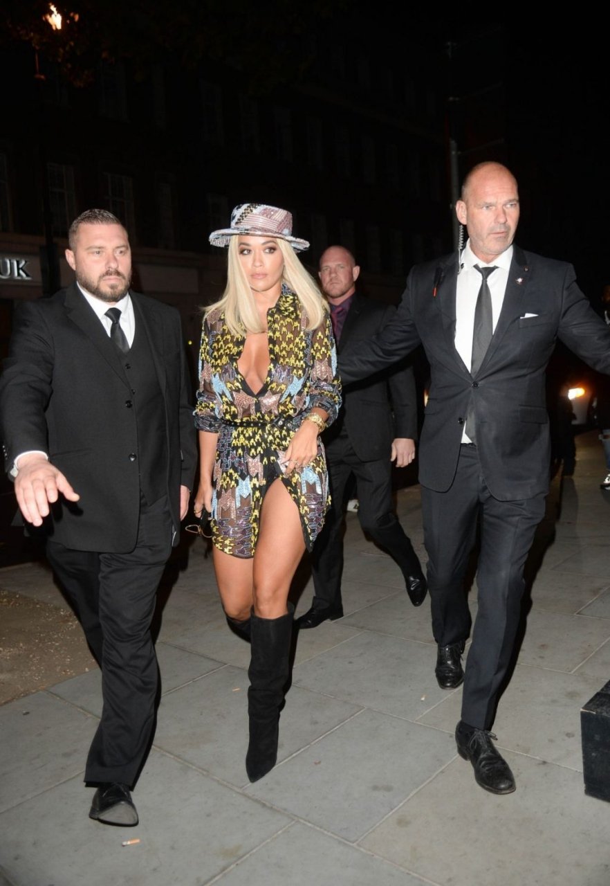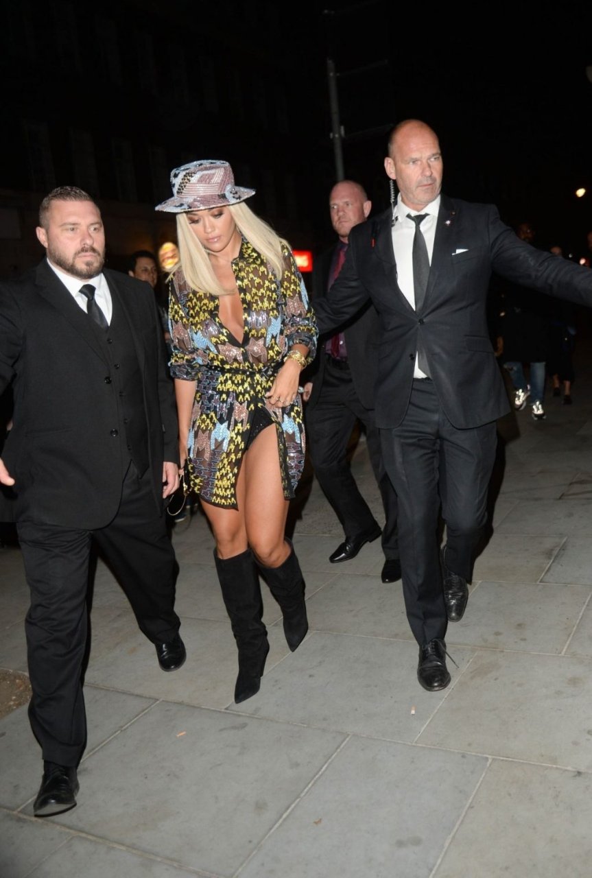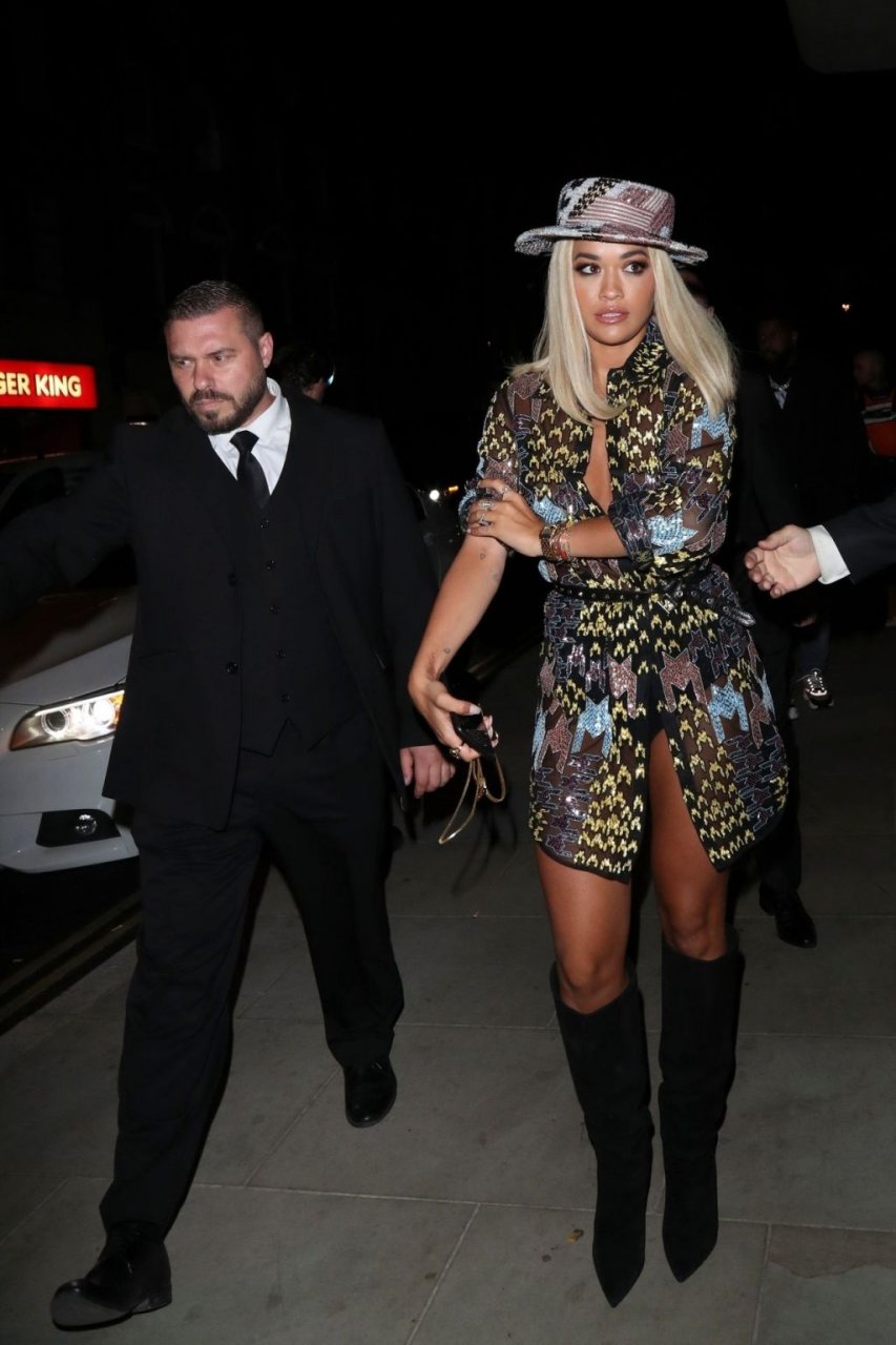 Rita Ora deixa a festa LFW Love Magazine e Youtube no The Standard em Londres, 16/09/2019. Rita estava usando um vestido mini colorido com um chapéu de aba larga e botas pretas de camurça até o joelho.