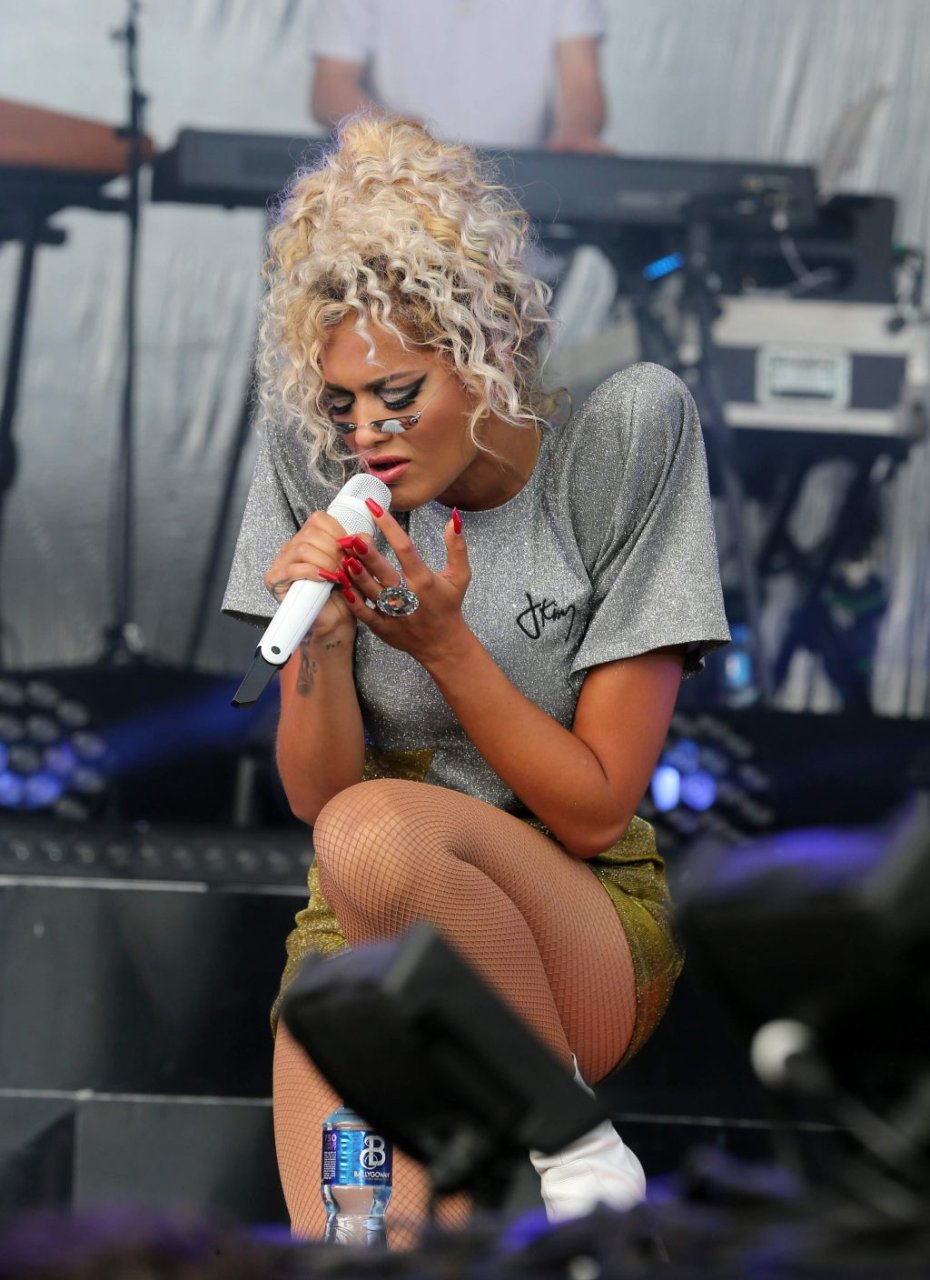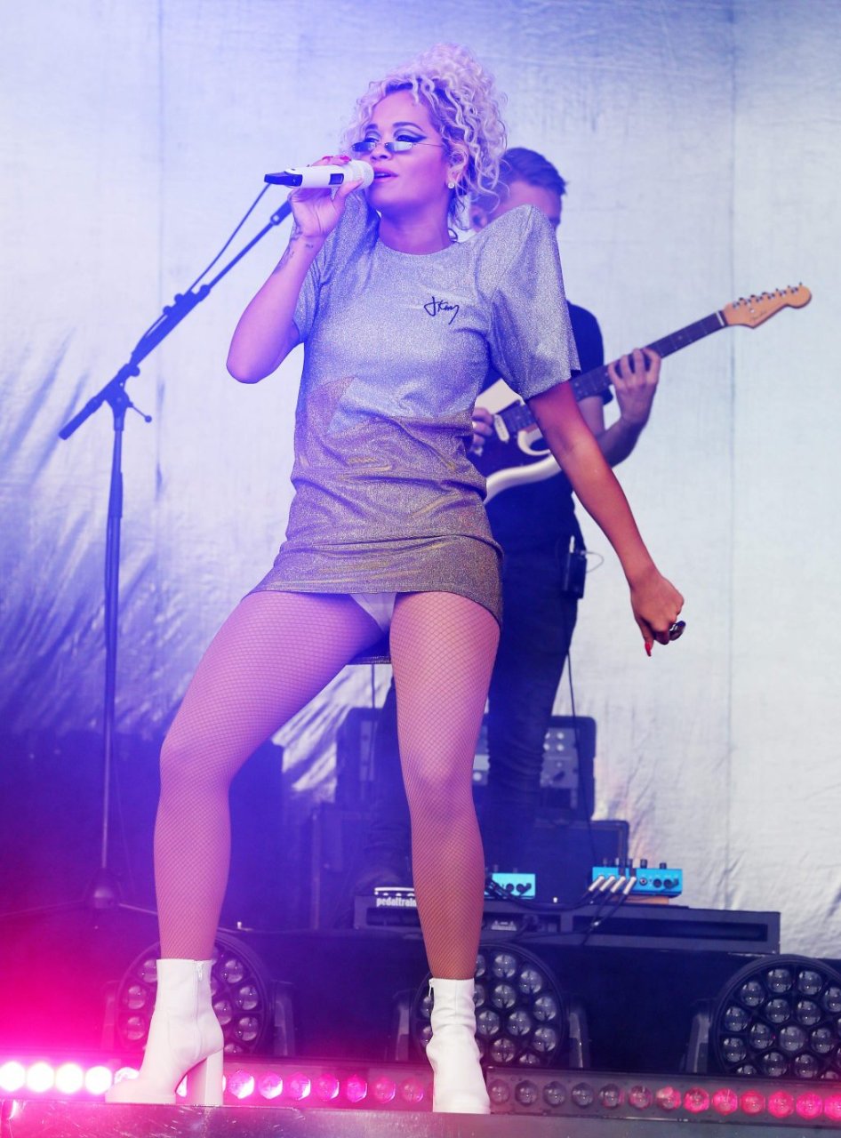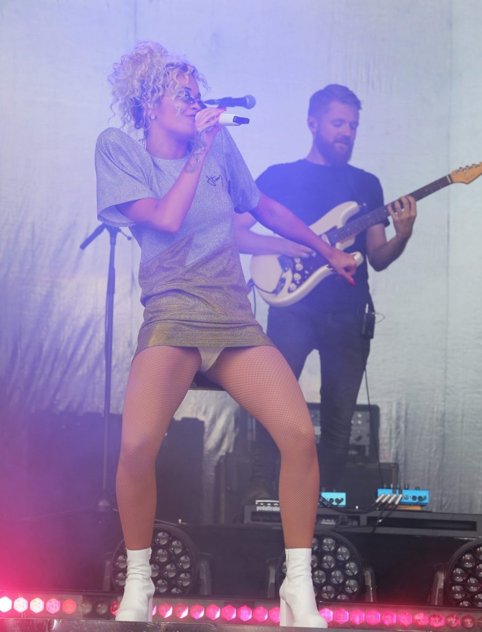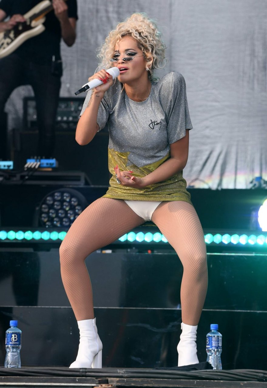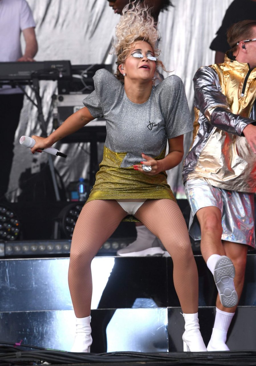 A cantora britânica Rita Ora visitou o Festival RiZE em Chelmsford, Essex, Inglaterra, em 18/08/2018. A beleza da estrela escolheu um traje estranho, focando toda a atenção dos presentes exclusivamente em sua calcinha branca.