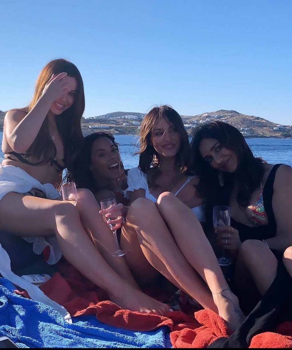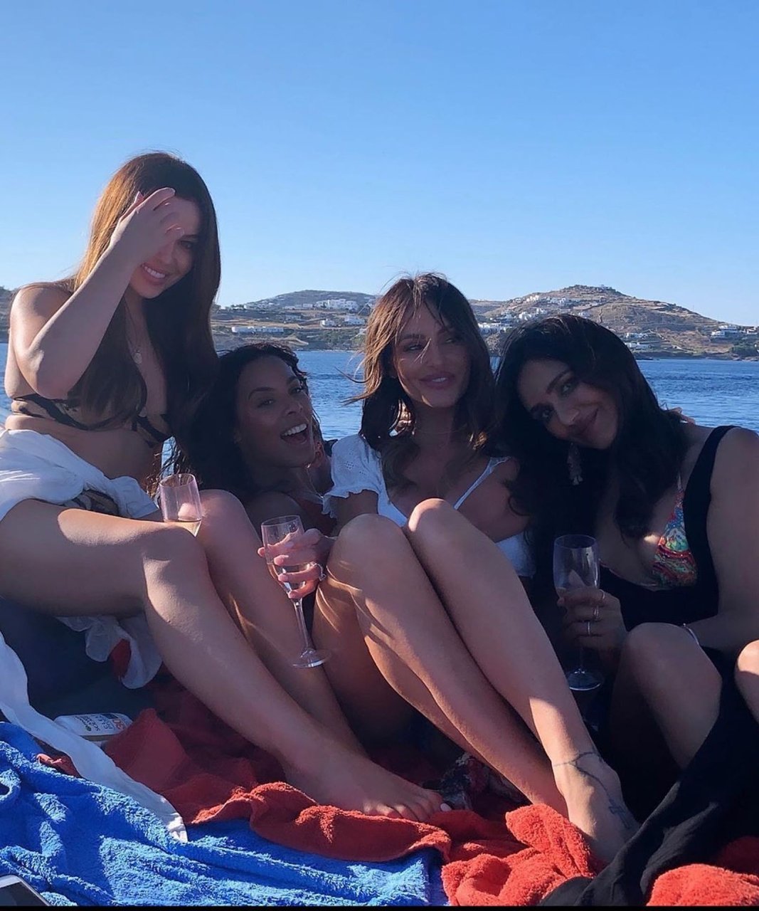 A cantora e apresentadora Rochelle Humes foi fotografada com o marido Marvin Humes e a melhor amiga Georgina Dorsett e seu parceiro, o jogador de futebol Tom Cleverley, de férias juntos na bela ilha de Mykonos, 05/06/2019.