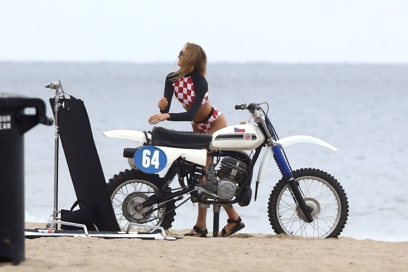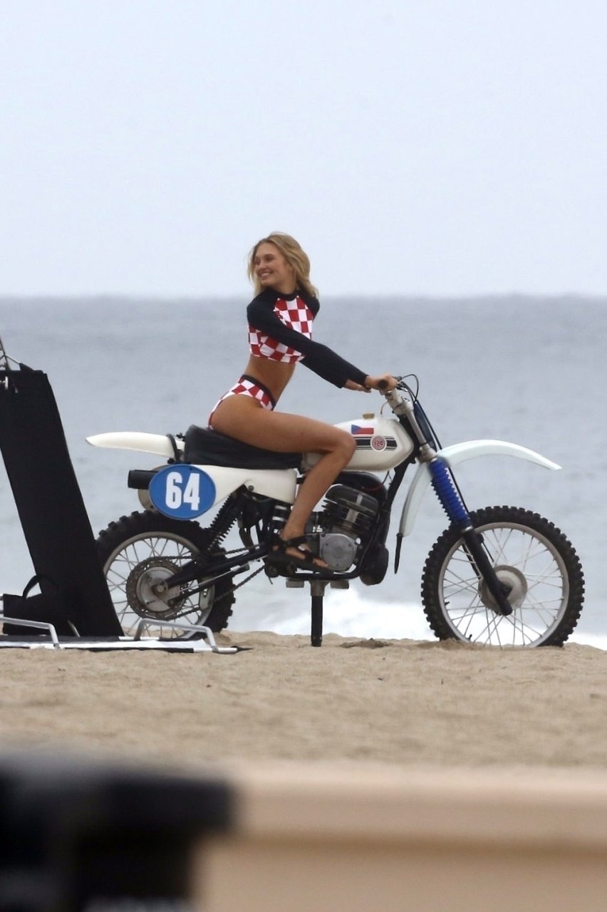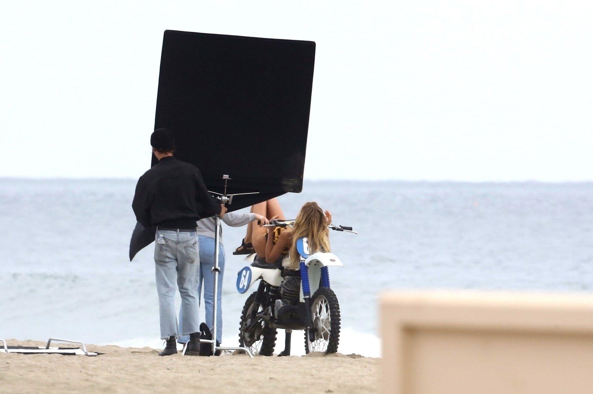 A modelo holandesa Romee Strijd (22) exibe suas longas pernas na praia para um ensaio fotográfico em Malibu, 13/05/2018. Romee estava usando um par de meias até a coxa, uma camisa tie-dye e uma calcinha branca para o ensaio.