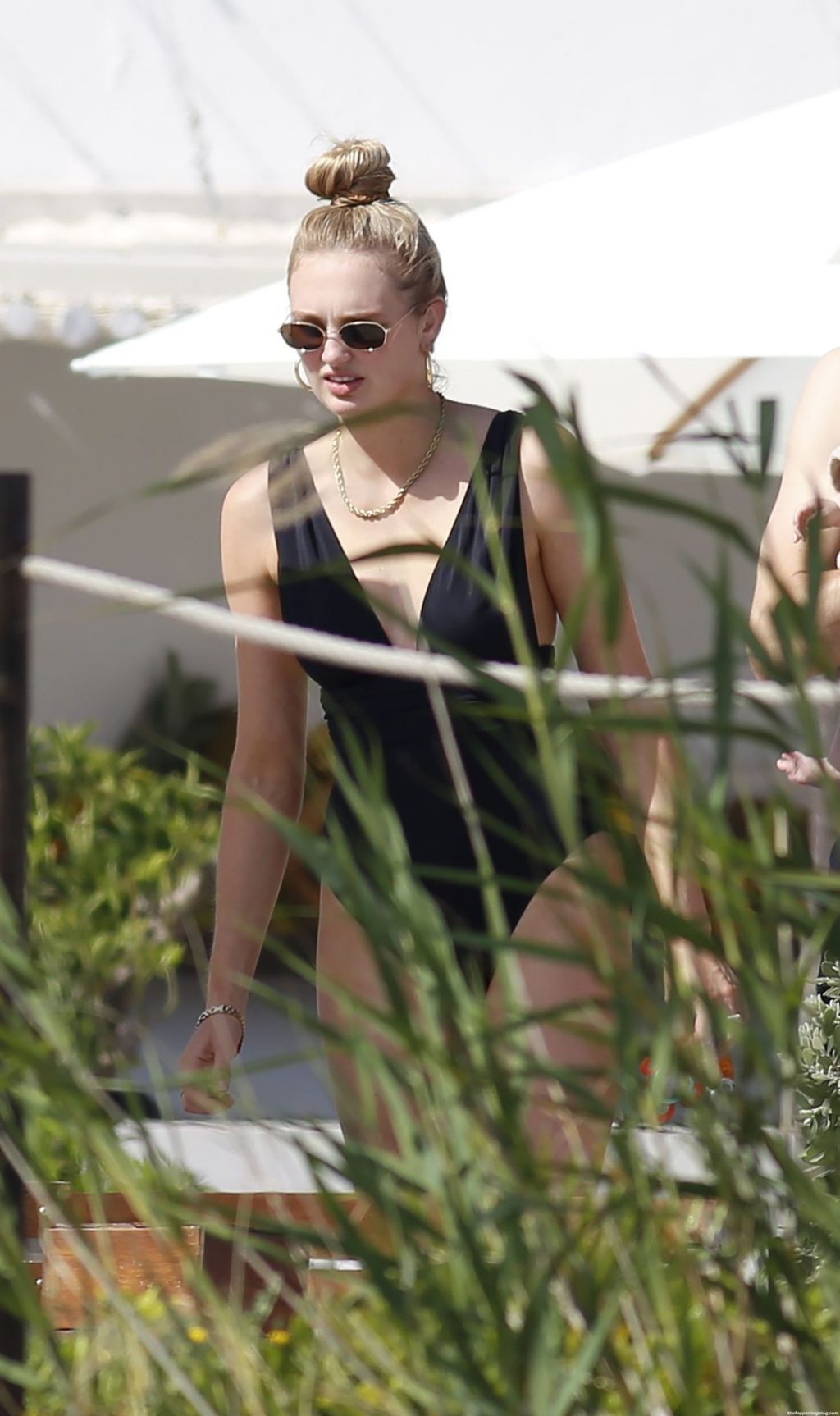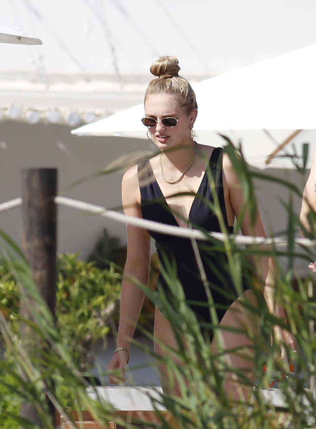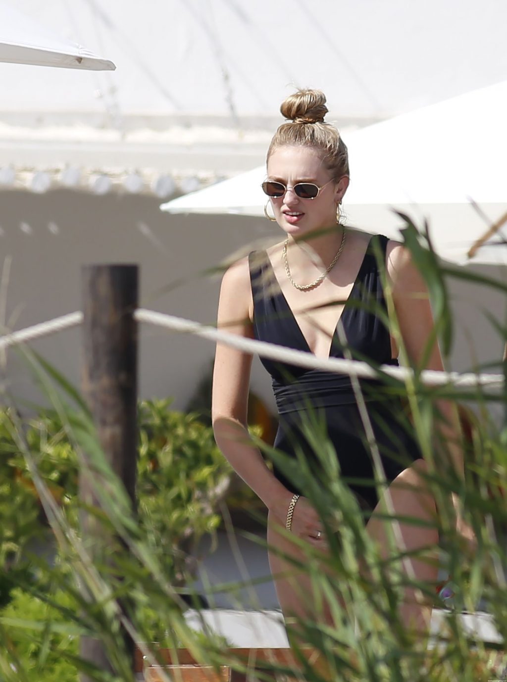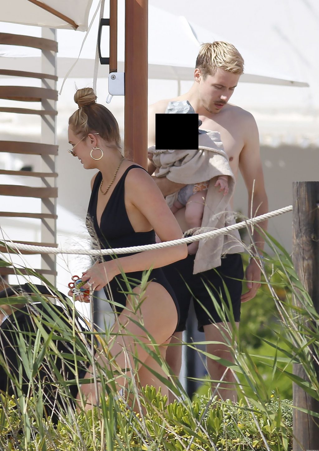 Victoria’s Secret Angel Romee Strijd exibe seu corpo incrível pós-bebê em um maiô preto durante férias em família em Ibiza no sábado, na companhia de seu bebê e de seu marido, Laurens Van Leuween.