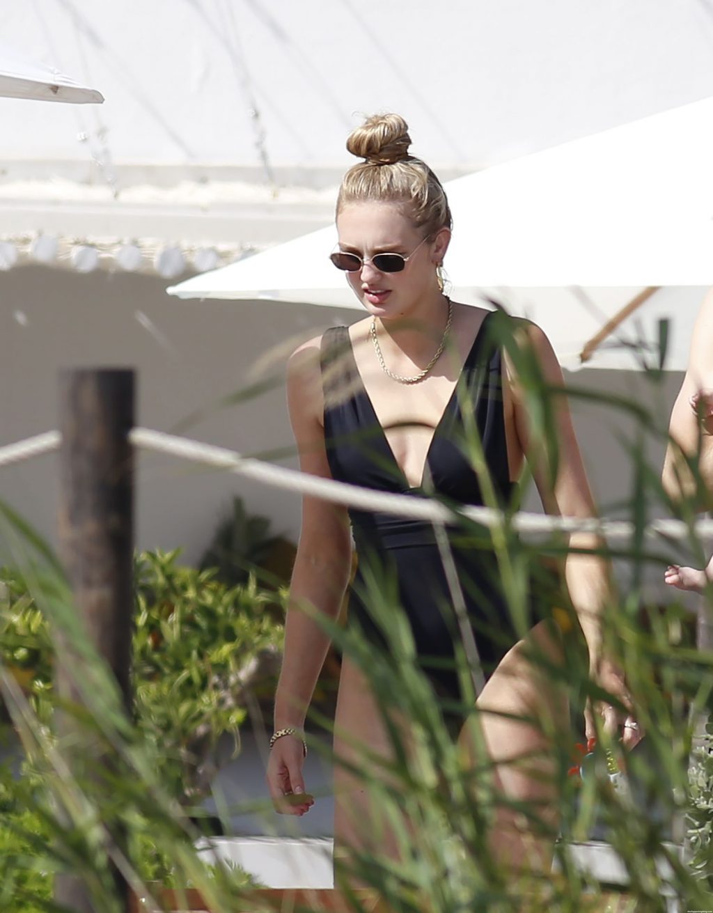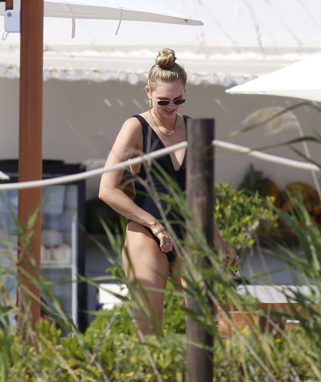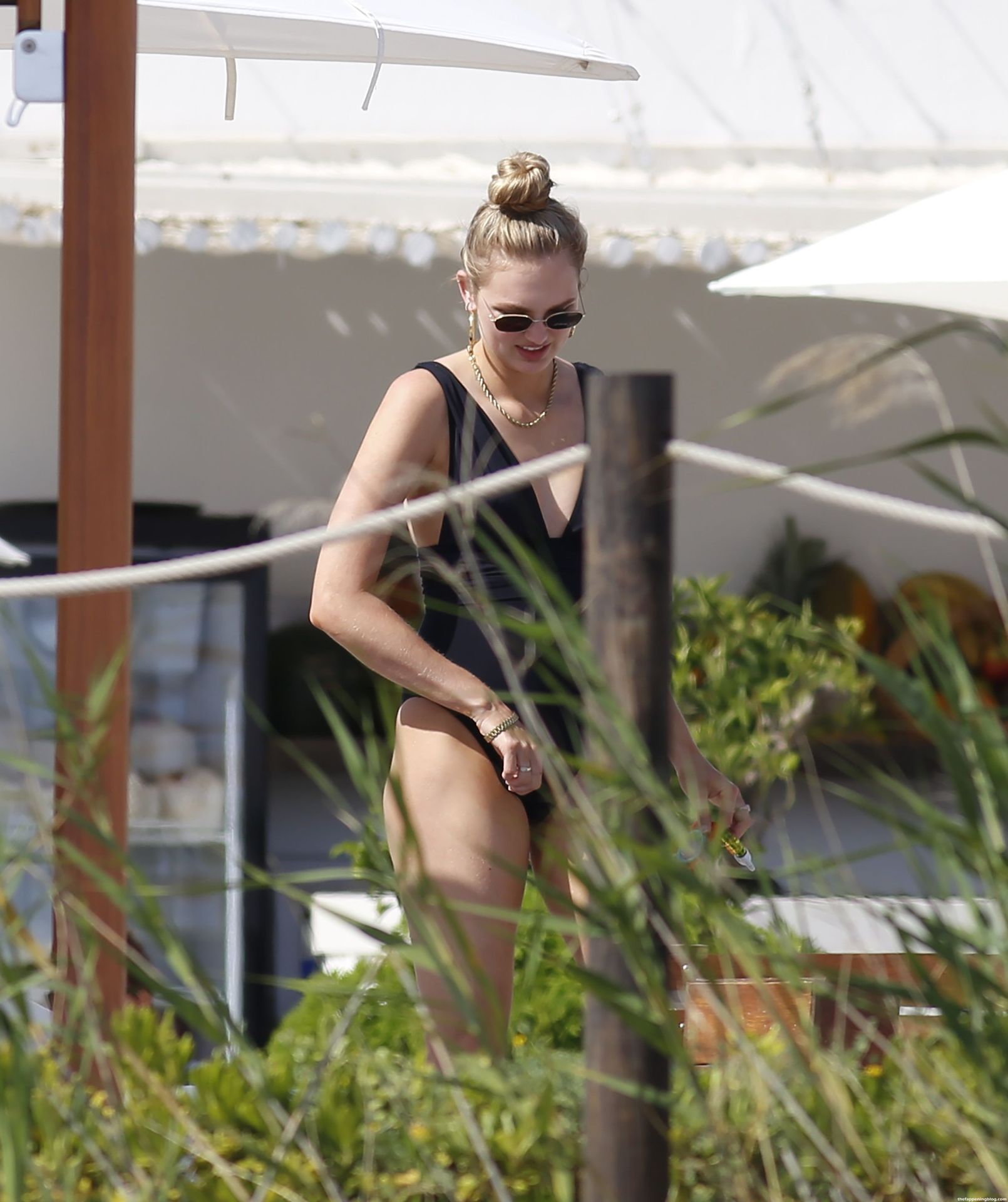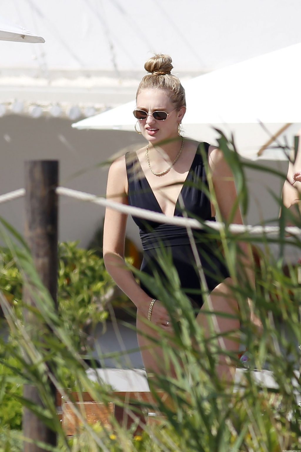 Victoria’s Secret Angel Romee Strijd exibe seu corpo incrível pós-bebê em um maiô preto durante férias em família em Ibiza no sábado, na companhia de seu bebê e de seu marido, Laurens Van Leuween.