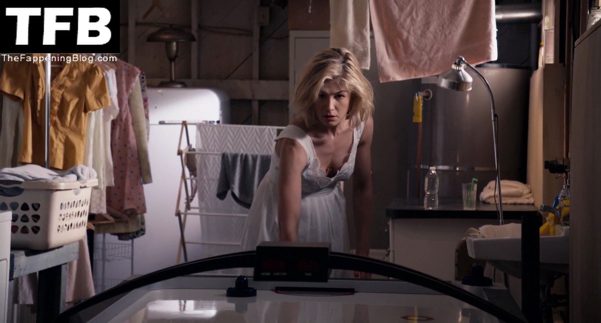Veja capturas de tela de Rosamund Pike em sua coleção com cenas nuas e sensuais de “Radioactive”, “Hector and the Search for Happiness” e “Return to Sender”.