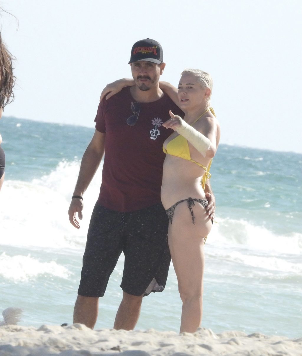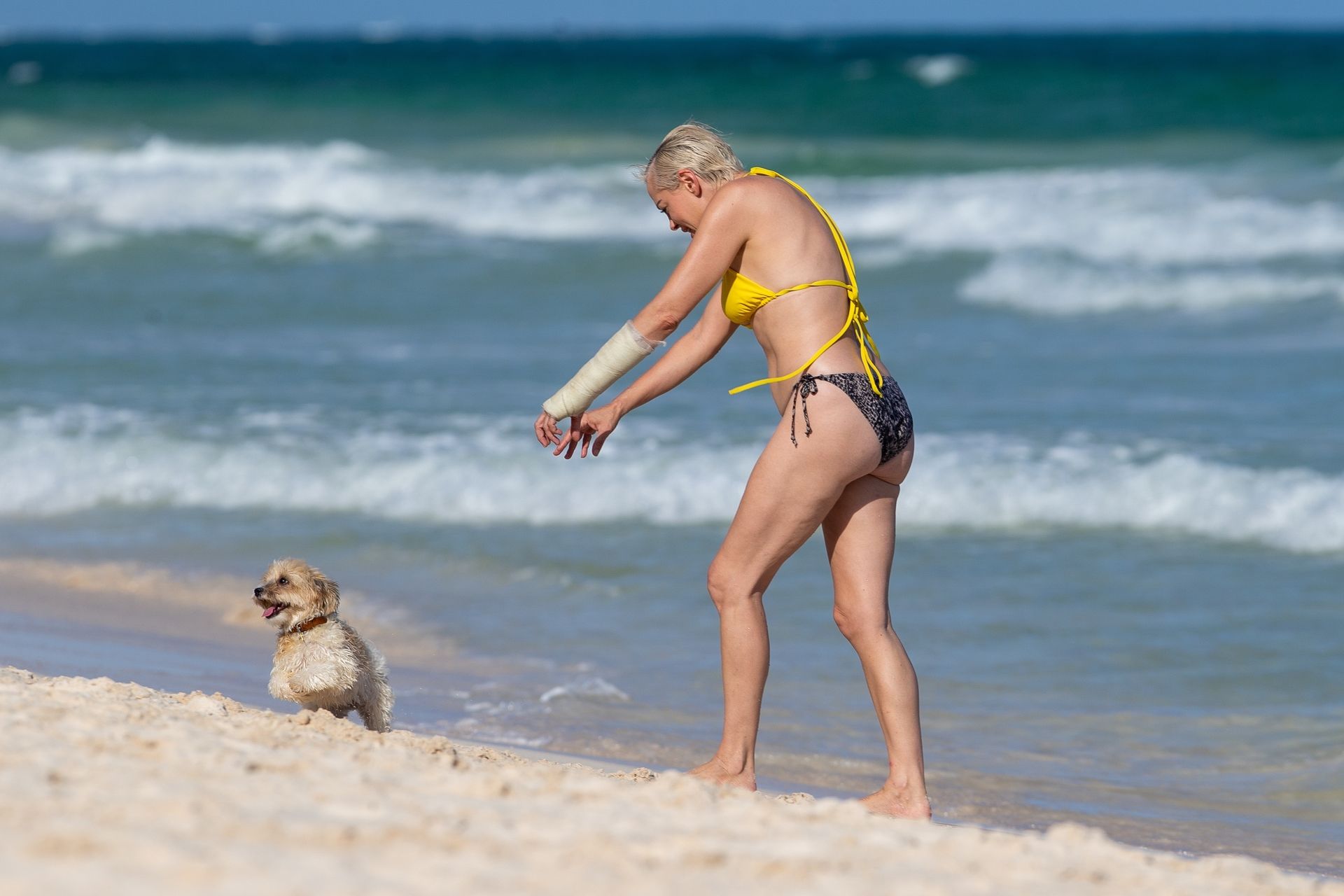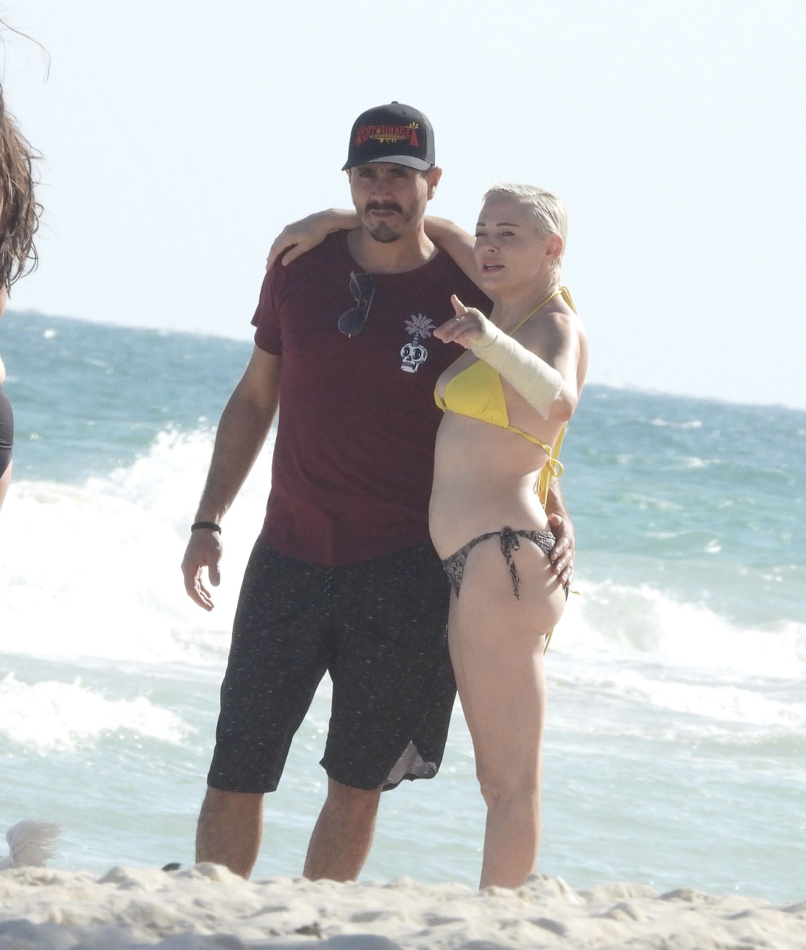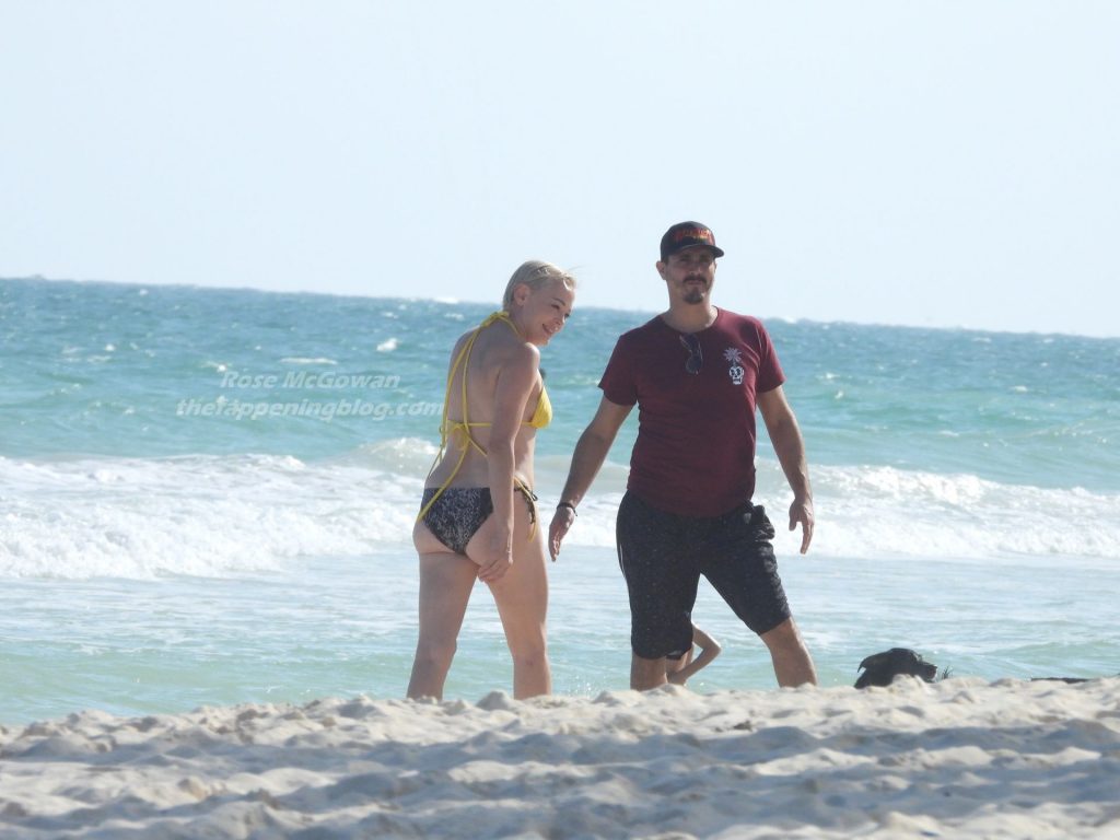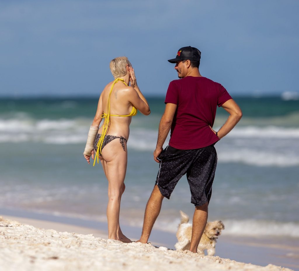 A estrela de The Fappening, Rose McGowan, vestida de biquíni, mima seu cachorro de estimação durante uma viagem à praia no México, 23/11/2020. Semanas depois de quebrar o pulso enquanto ‘lia os resultados das eleições dos EUA’.