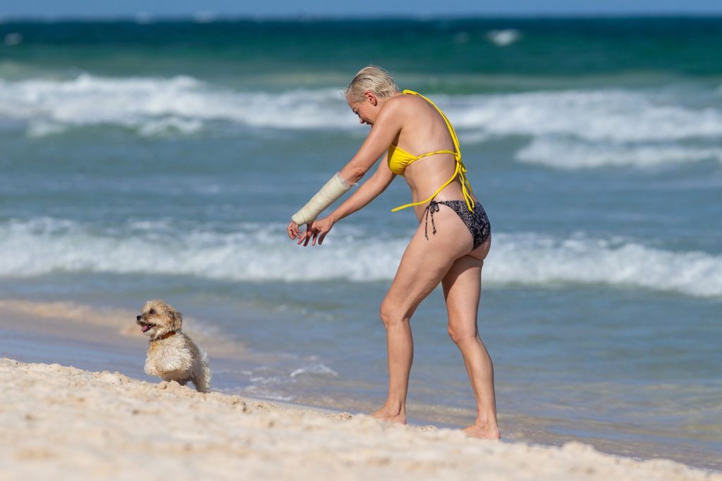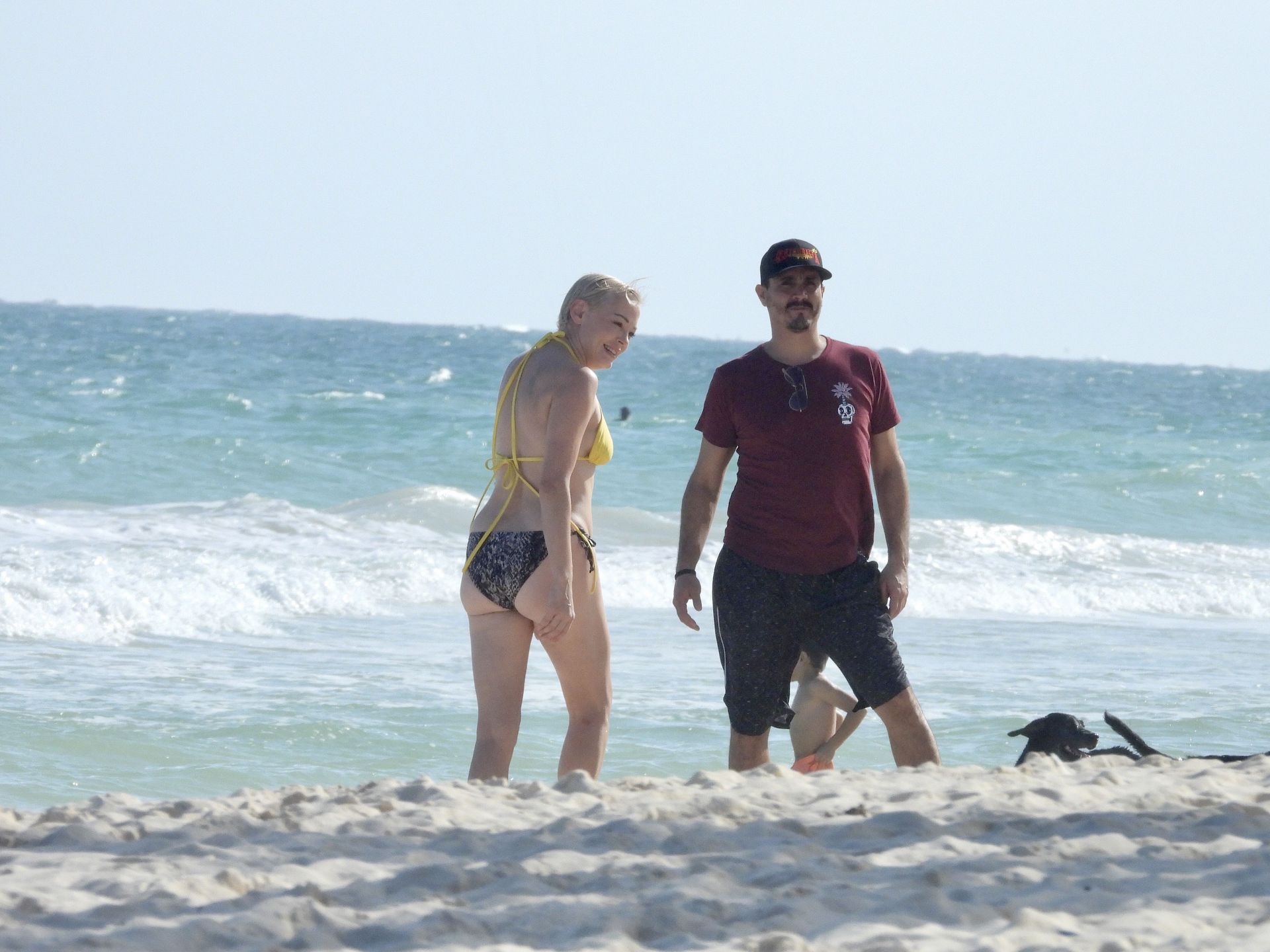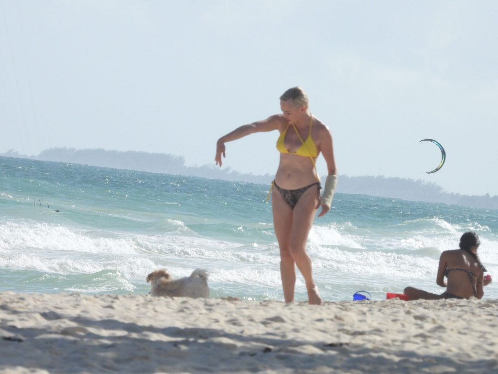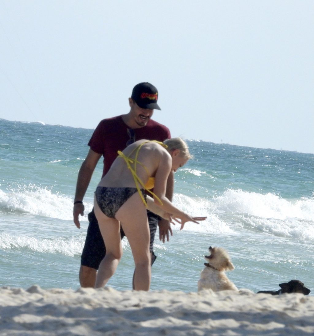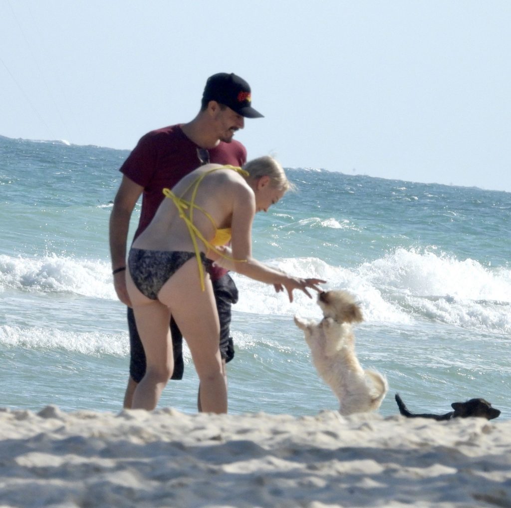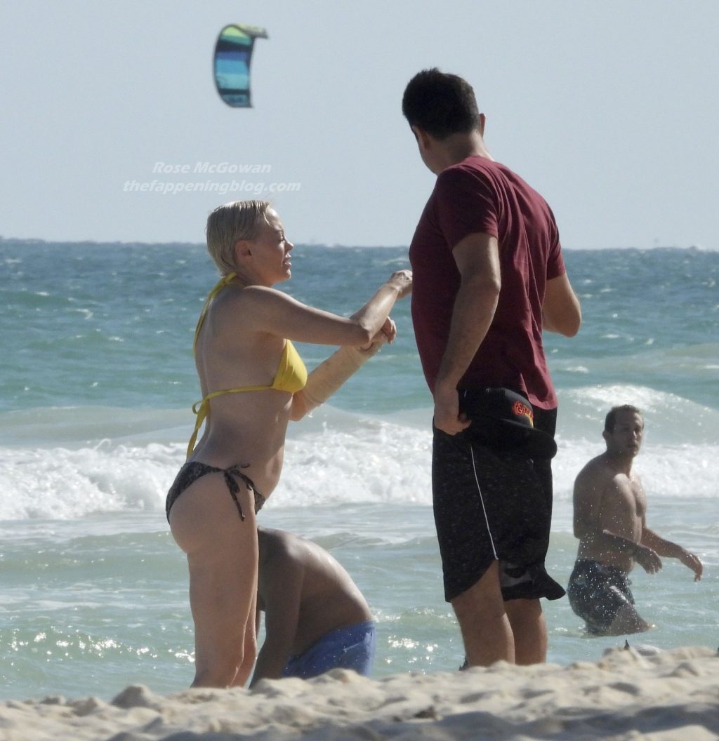 A estrela de The Fappening, Rose McGowan, vestida de biquíni, mima seu cachorro de estimação durante uma viagem à praia no México, 23/11/2020. Semanas depois de quebrar o pulso enquanto ‘lia os resultados das eleições dos EUA’.