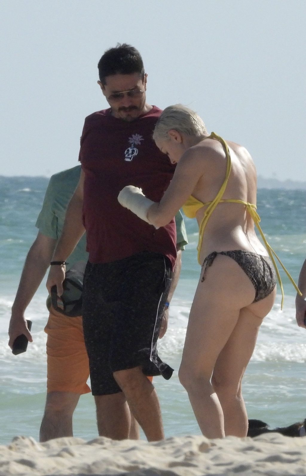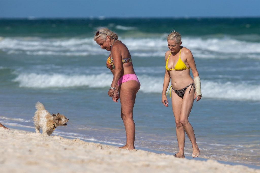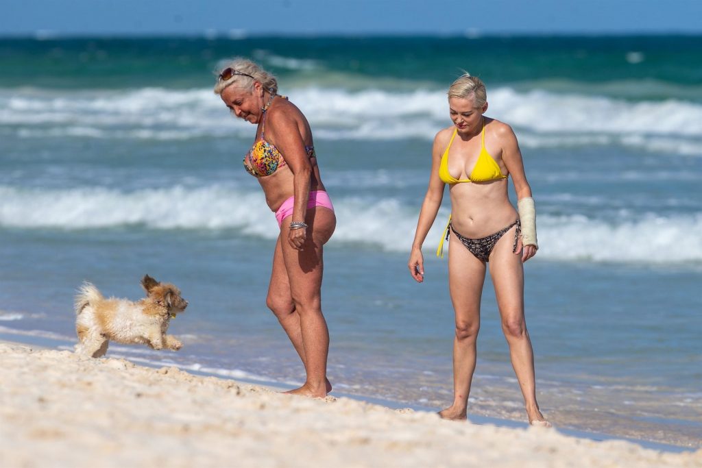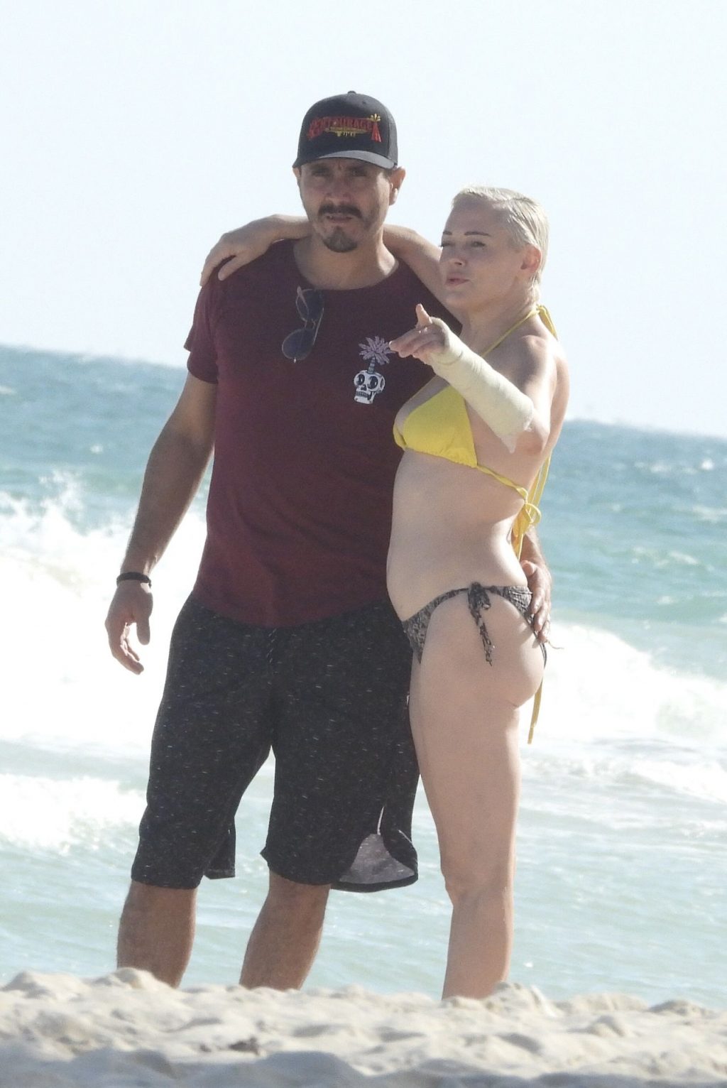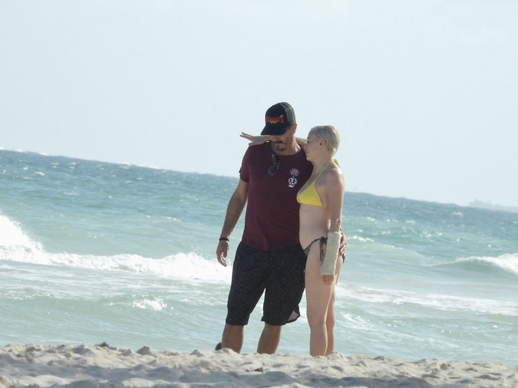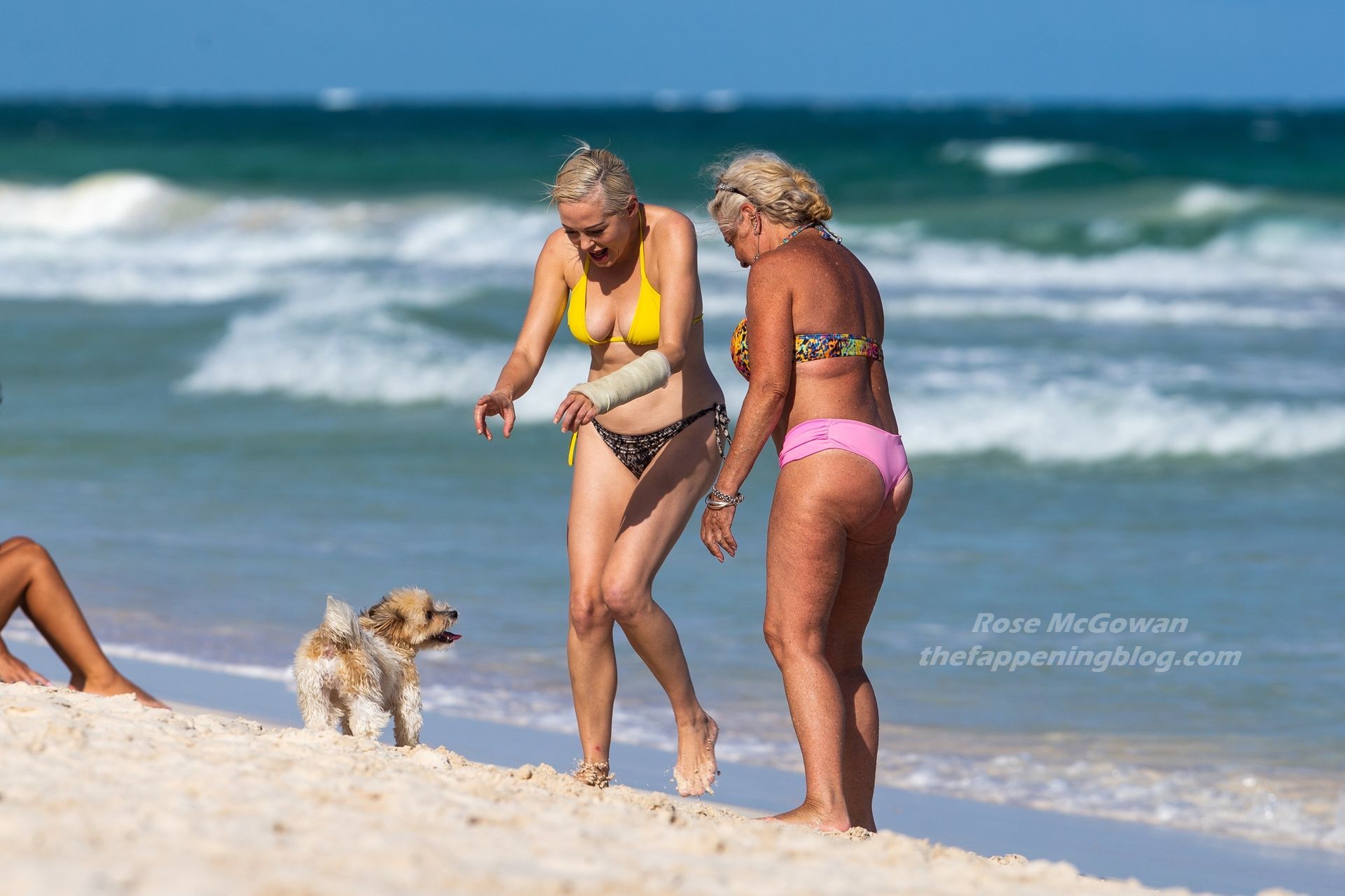 A estrela de The Fappening, Rose McGowan, vestida de biquíni, mima seu cachorro de estimação durante uma viagem à praia no México, 23/11/2020. Semanas depois de quebrar o pulso enquanto ‘lia os resultados das eleições dos EUA’.