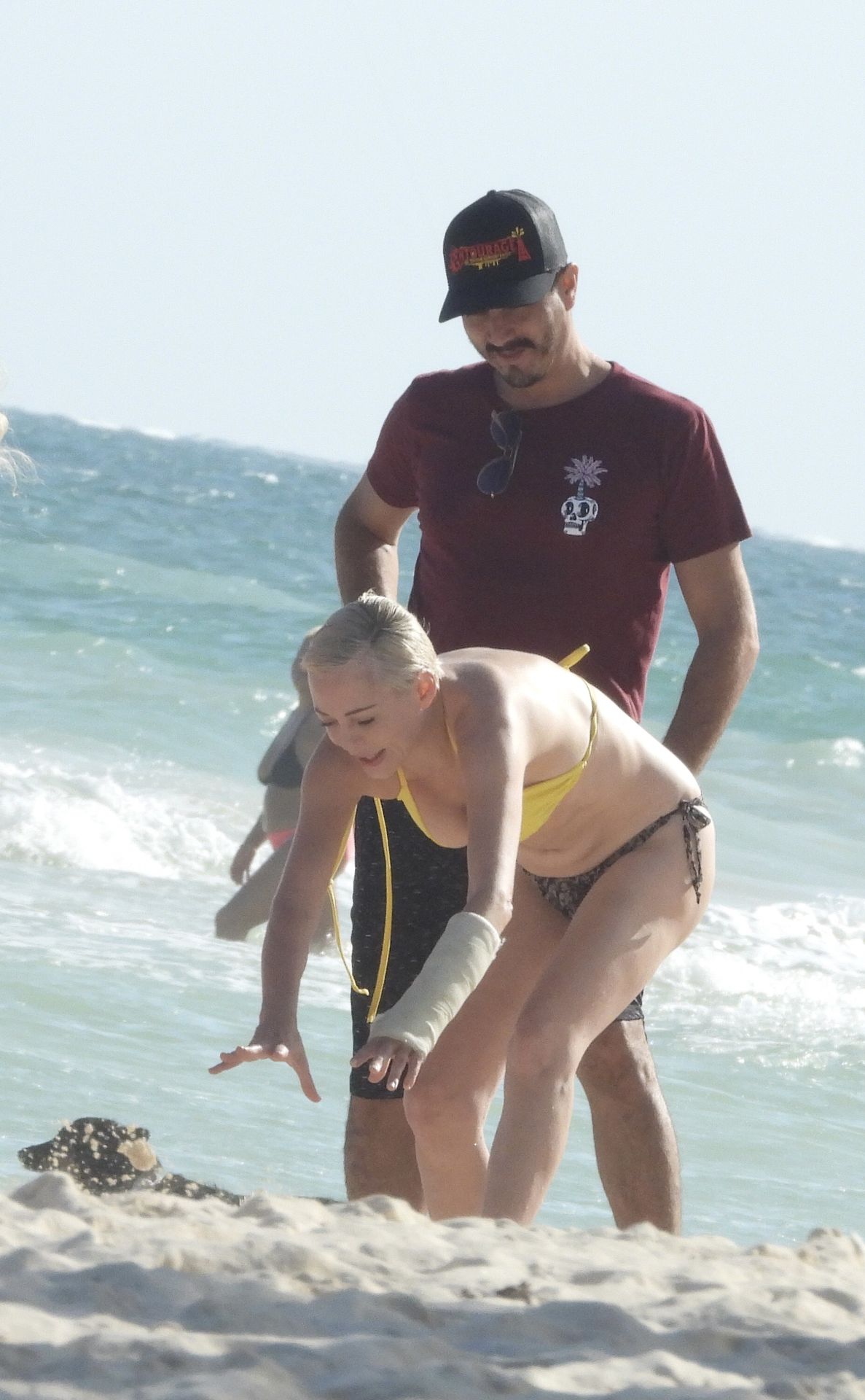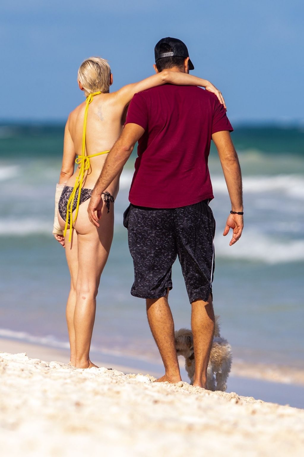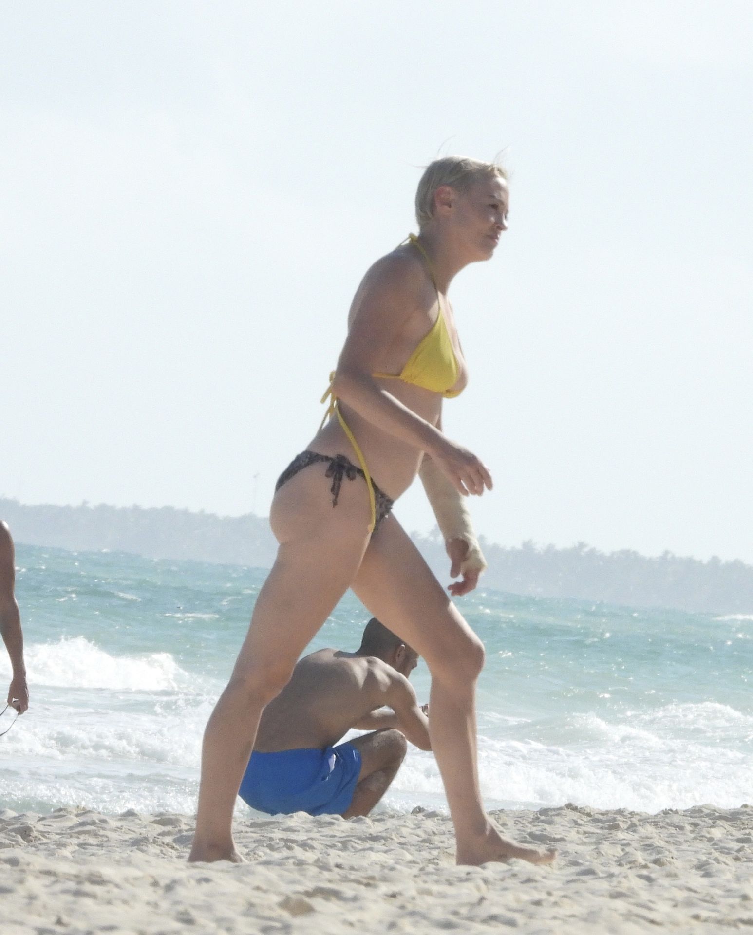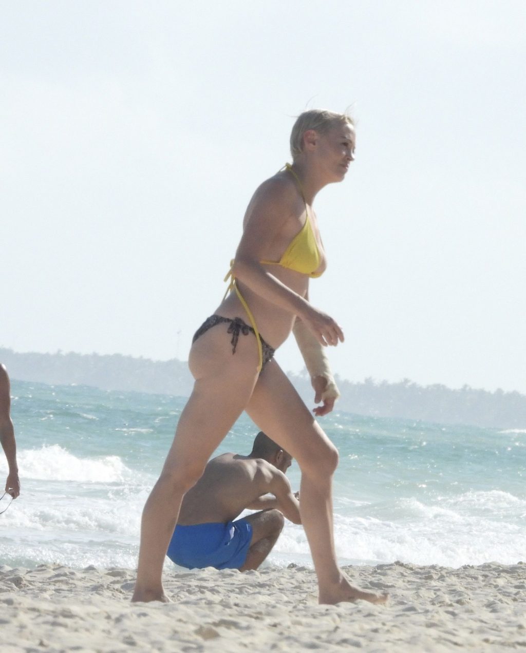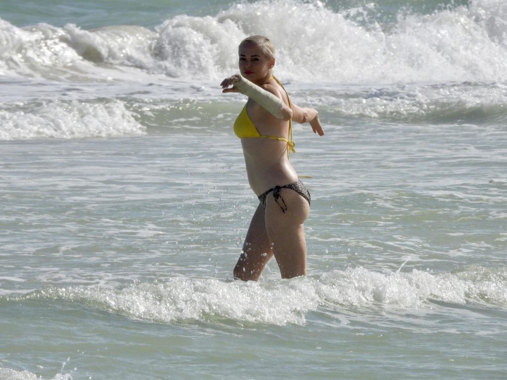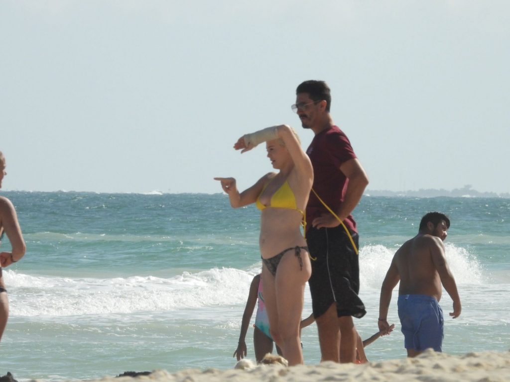 A estrela de The Fappening, Rose McGowan, vestida de biquíni, mima seu cachorro de estimação durante uma viagem à praia no México, 23/11/2020. Semanas depois de quebrar o pulso enquanto ‘lia os resultados das eleições dos EUA’.