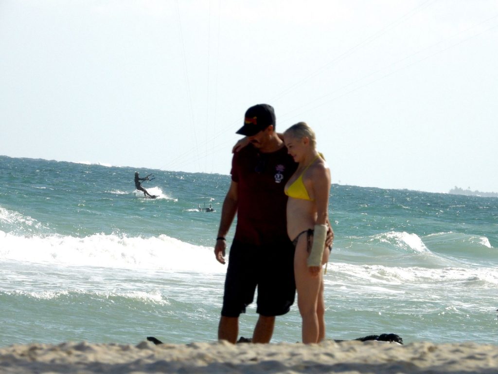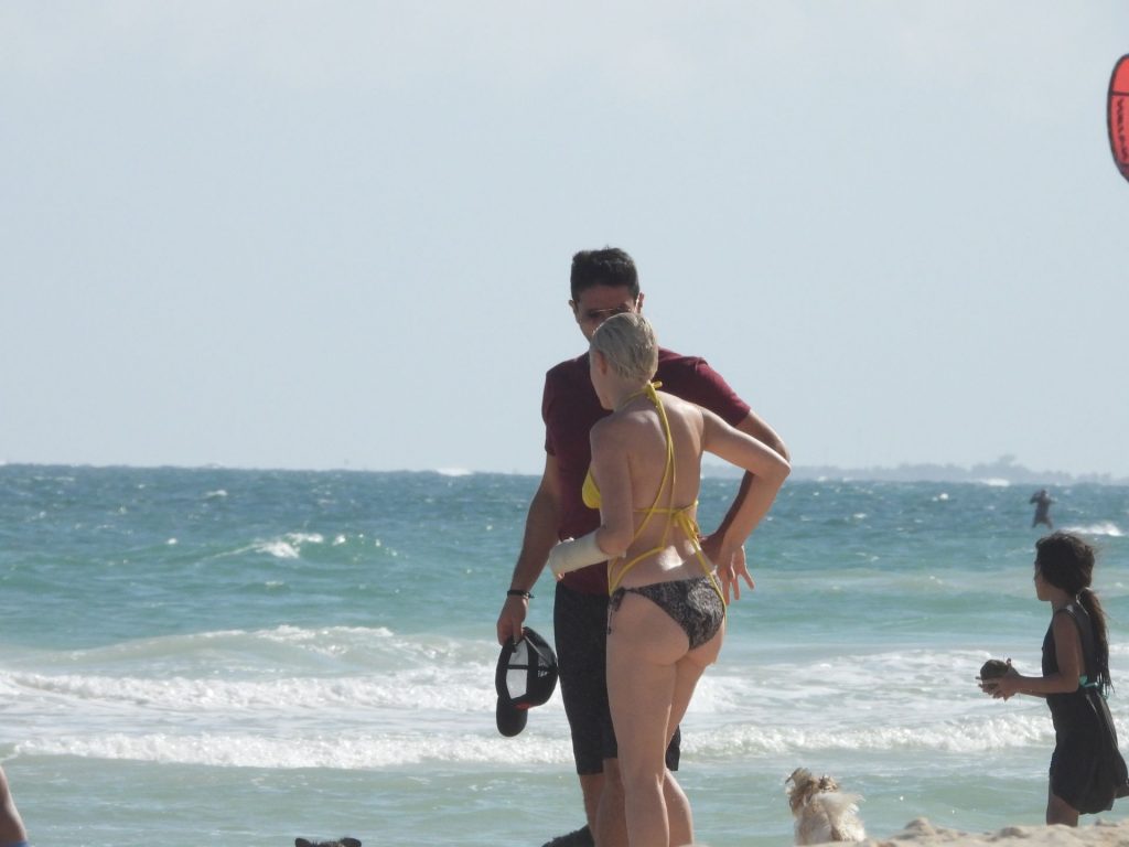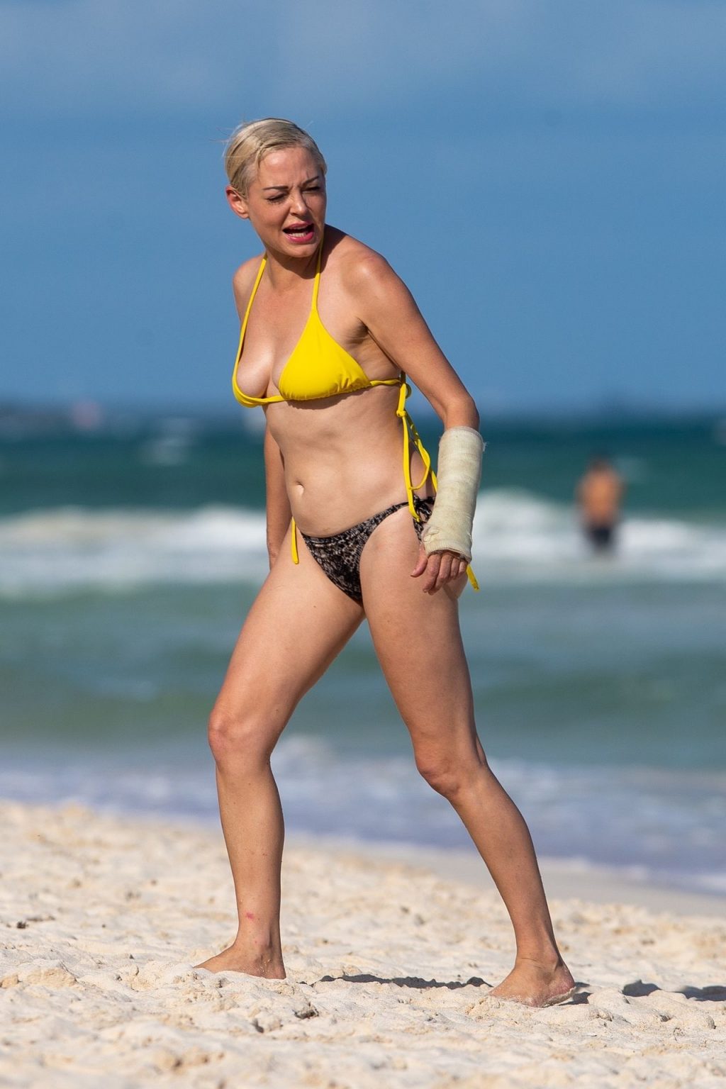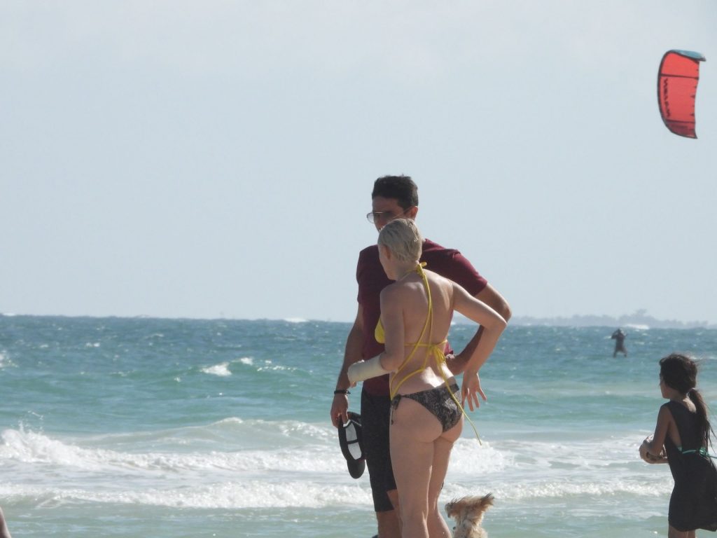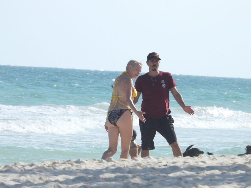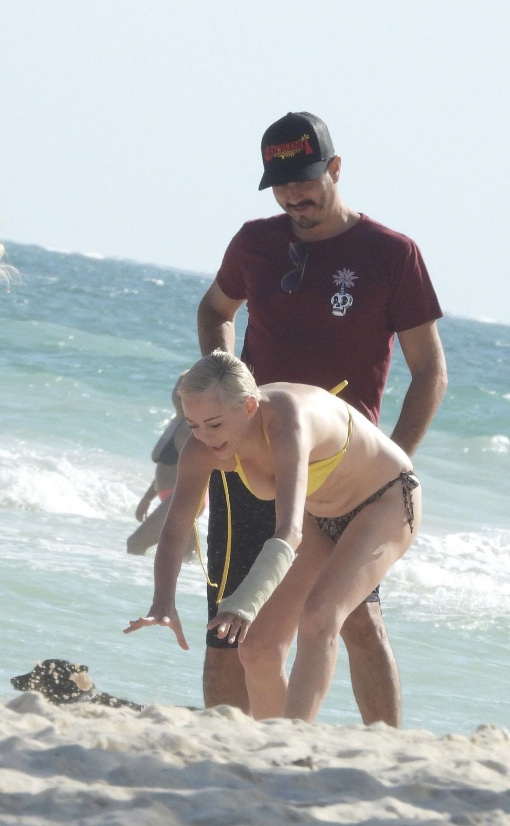 A estrela de The Fappening, Rose McGowan, vestida de biquíni, mima seu cachorro de estimação durante uma viagem à praia no México, 23/11/2020. Semanas depois de quebrar o pulso enquanto ‘lia os resultados das eleições dos EUA’.