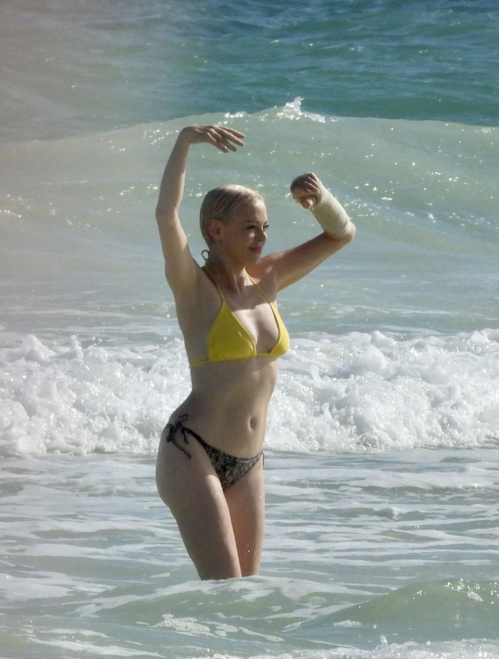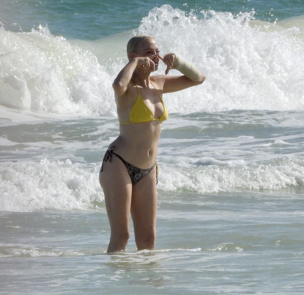 Ela ainda tem um traseiro mais ou menos decente e - para minha surpresa - parece ter peitos de verdade (veja a primeira foto; eles caem). Ela também quase não tem tatuagens, o que é sempre ótimo se você não quer parecer uma vagabunda barata de parque de diversões. Mas sim, os dias dela como símbolo sexual estão praticamente acabados.